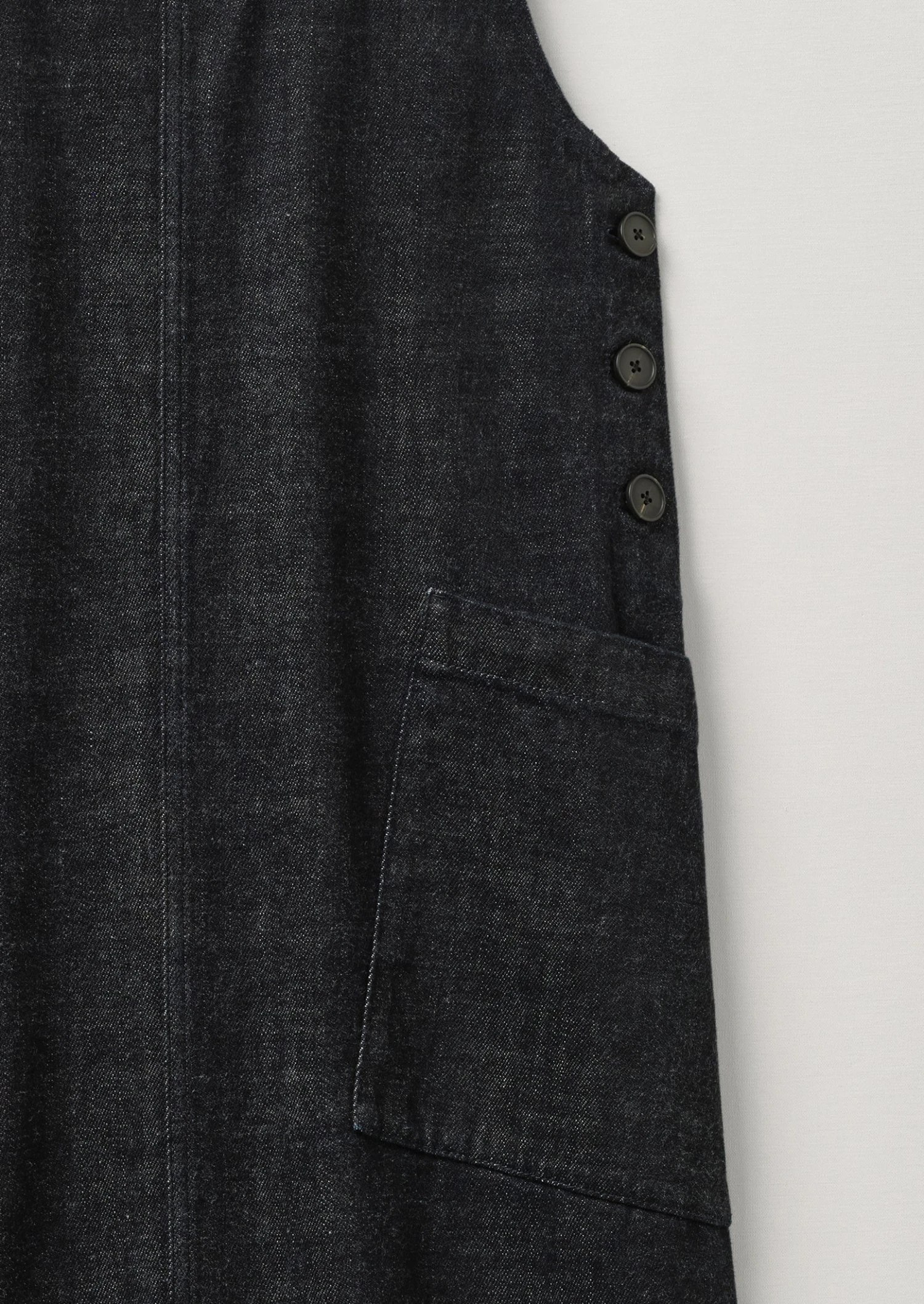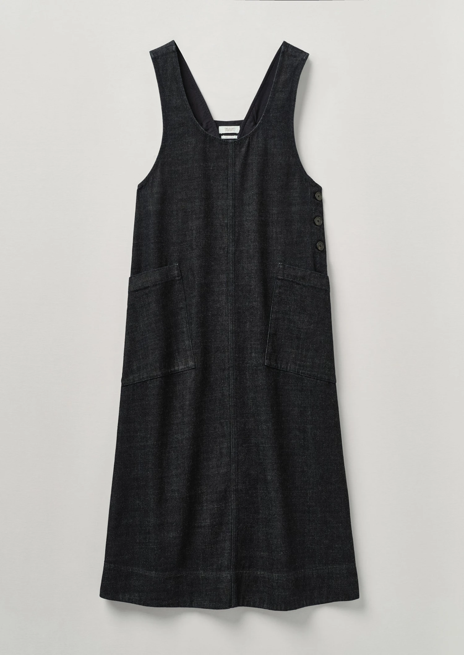 Cut to an A-line shape with a round neck and finished with horn buttons at the back of the adjustable straps. Japanese-woven cotton denim. A-line shape. Round neck. Adjustable buttoned straps. Large angled side pockets. Back patch pockets. Lower-calf length. Horn buttons.