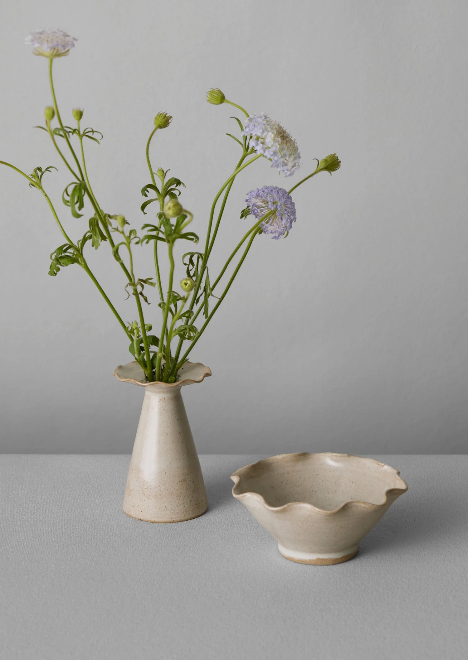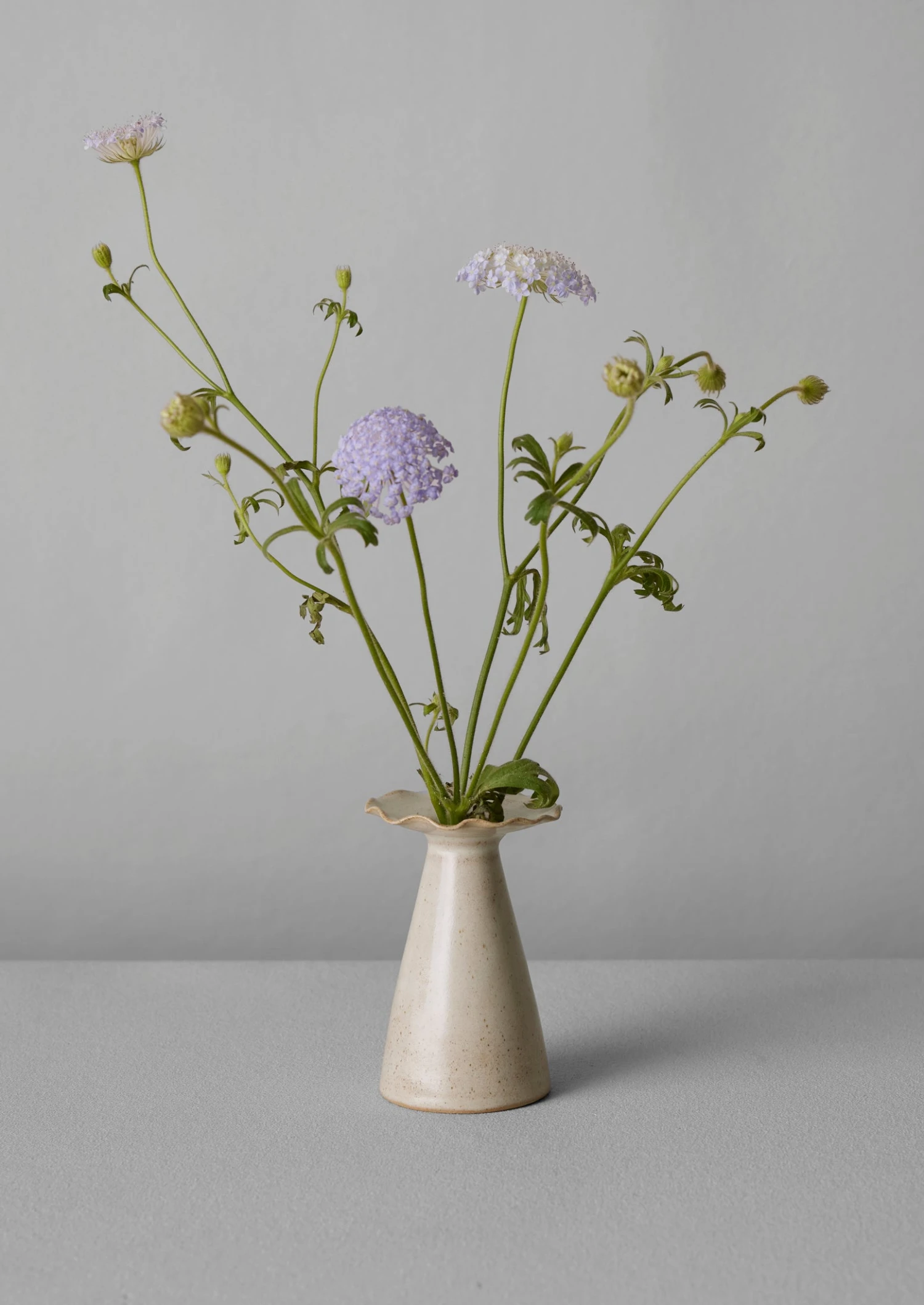 Scallop-edged vase hand-thrown by Alice Passingham exclusively for TOAST. Based by the coast in Hampshire, Alice works from her garden studio. After leaving a career in fashion in London, she began making pots a few years ago under the mentorship of a local potter. Crafted from stoneware clay and finished with a speckled, subtle grey-white glaze. Each varies slightly in shape and colour.