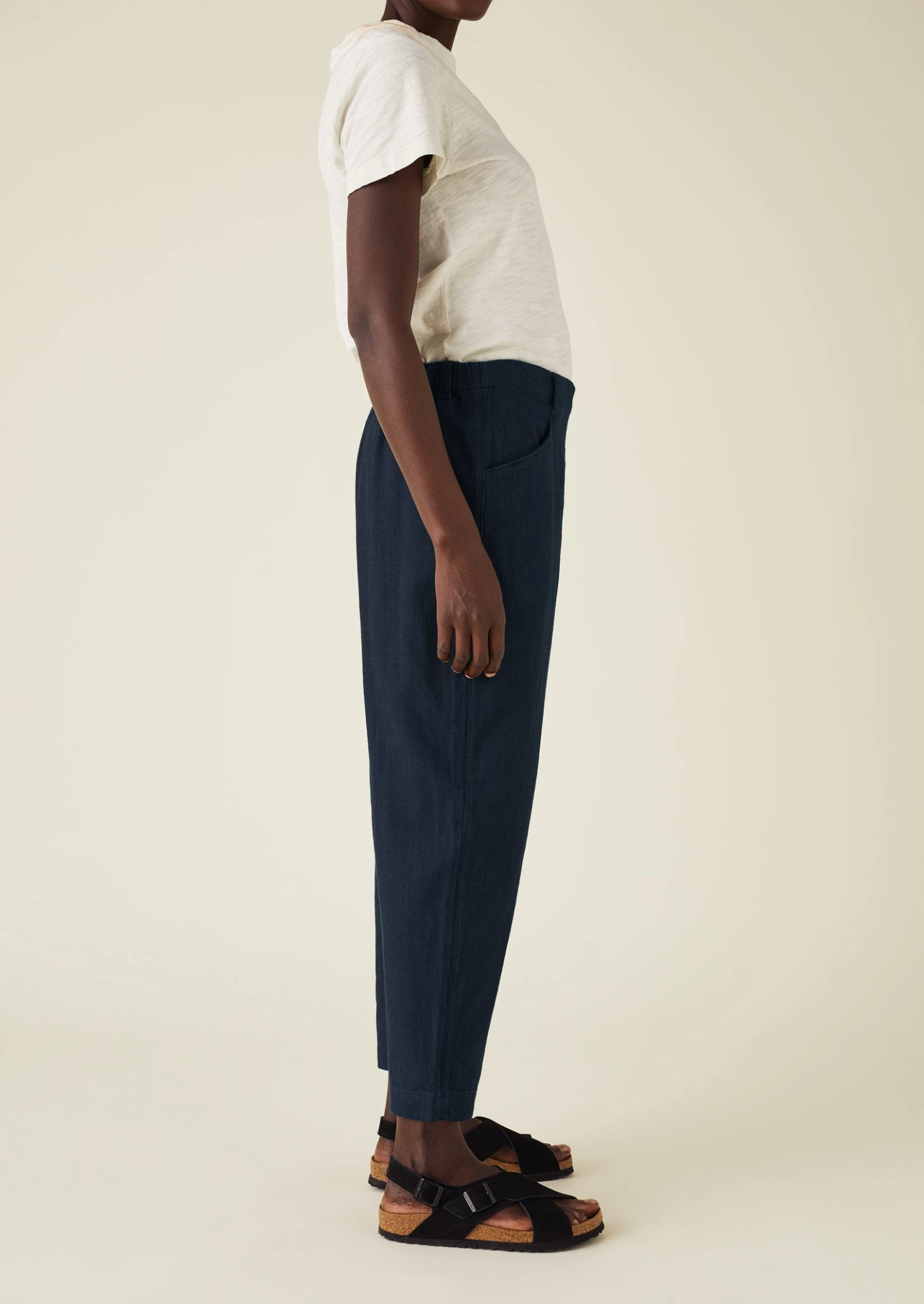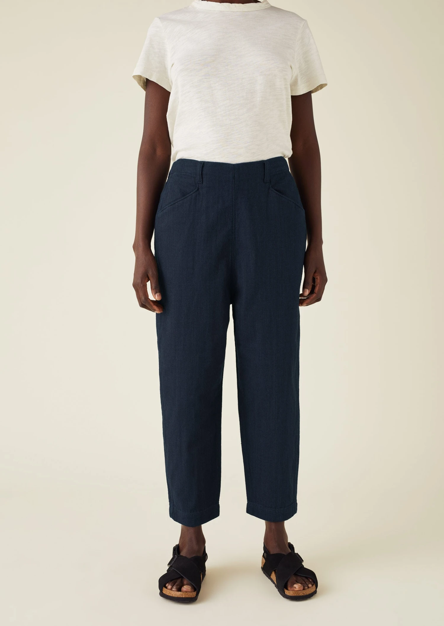 Japanese cotton denim. Flat front waistband. Elasticated back waist. Belt loops. Angled side pockets. Easy, tapered, ankle skimming legs.