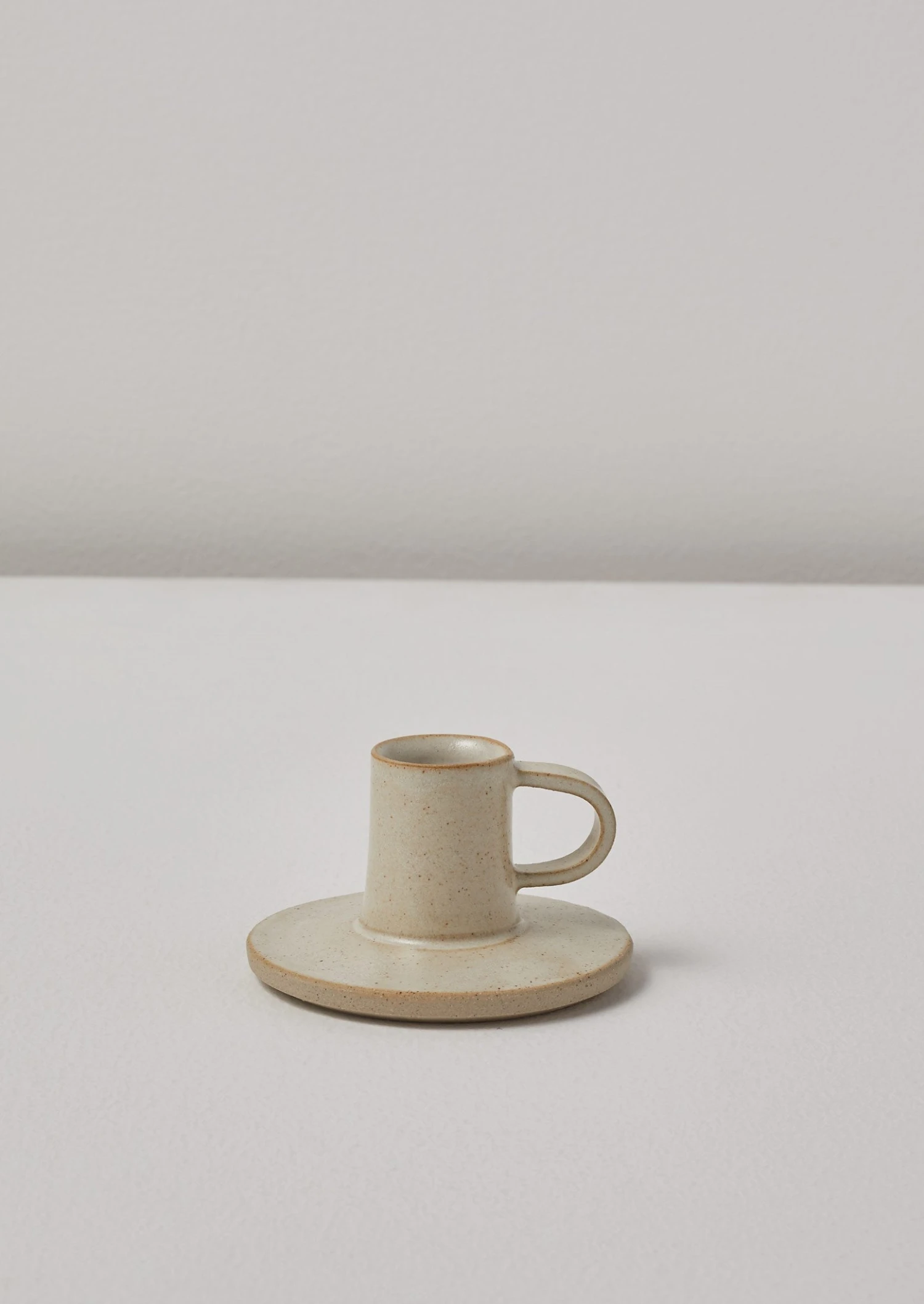 Hand thrown Staffordshire clay. Oatmeal glaze with a raw rim. Slightly shorter in form, with a small handle. To fit our English Beeswax Dinner Candles. Andrea Roman is based in London, and is drawn to the tactile and versatile nature of clay. She creates functional pieces that are characterised by their raw forms.