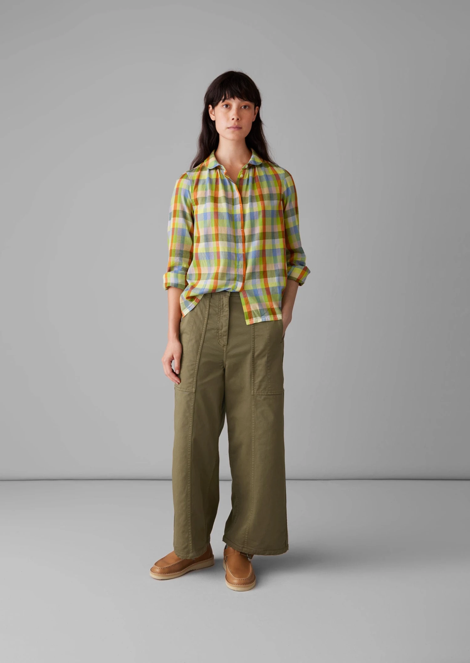Our shirt is crafted from cotton mulmul which is handwoven by artisans in the Chhindwara district of Madhya Pradesh, supported by the Kala Swaraj Foundation. Cut with a small collar and finished with the fabric selvedge at the edge of the placket.