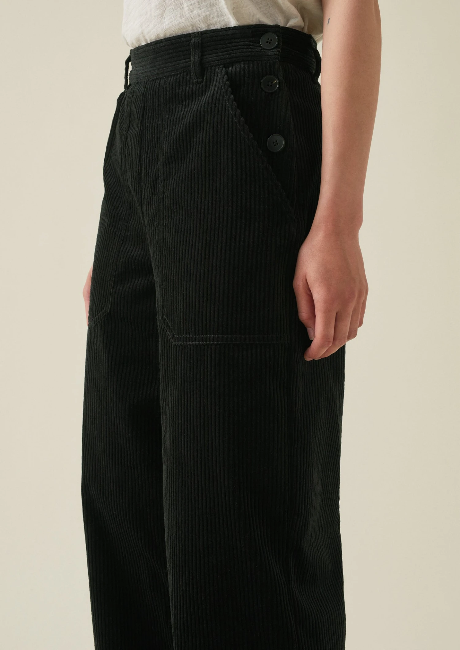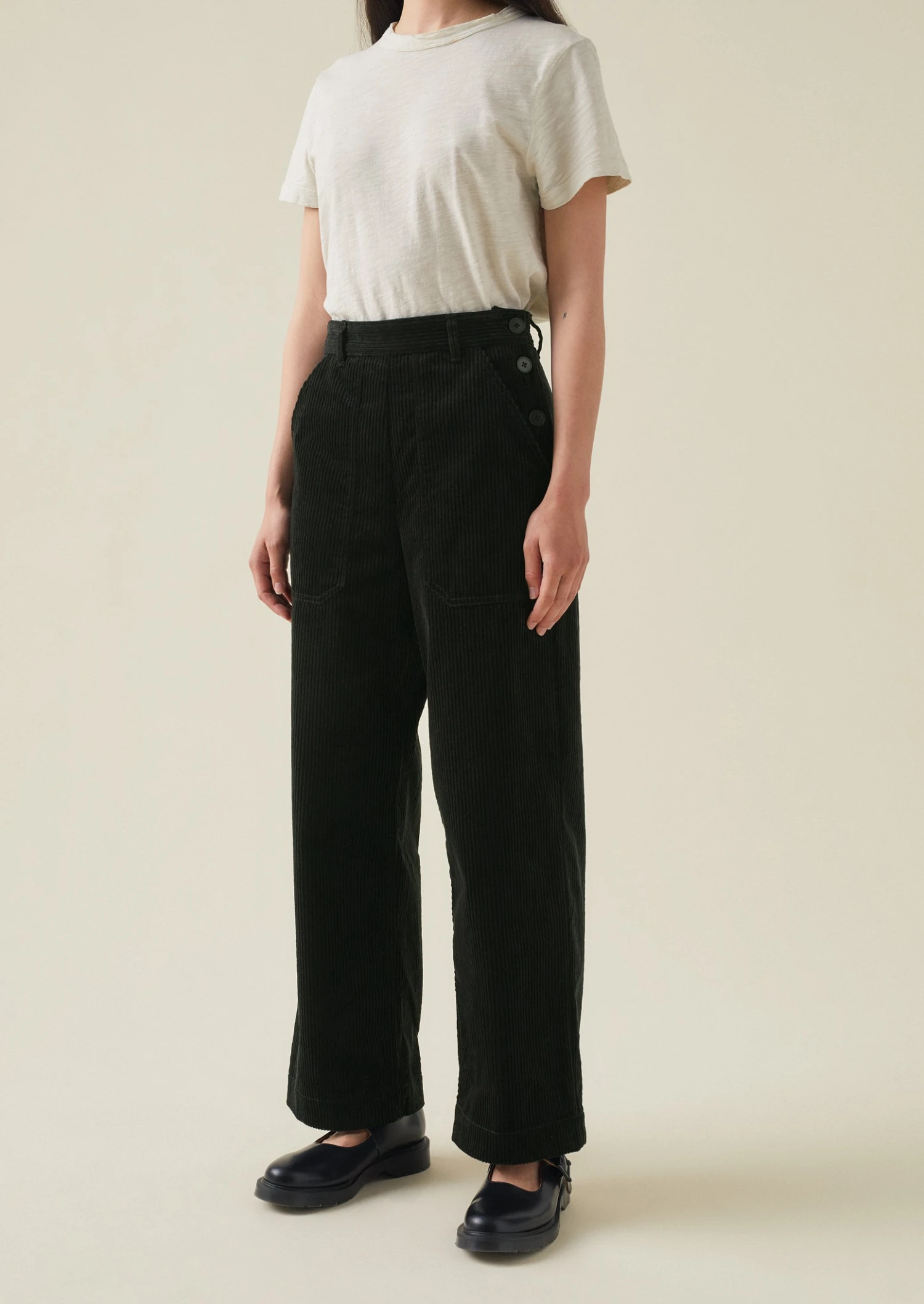 Organic cotton corduroy. Belt loops. Back buttoned jet pocket. Topstitched carpenter pockets. Long-cropped legs. Side buttons.