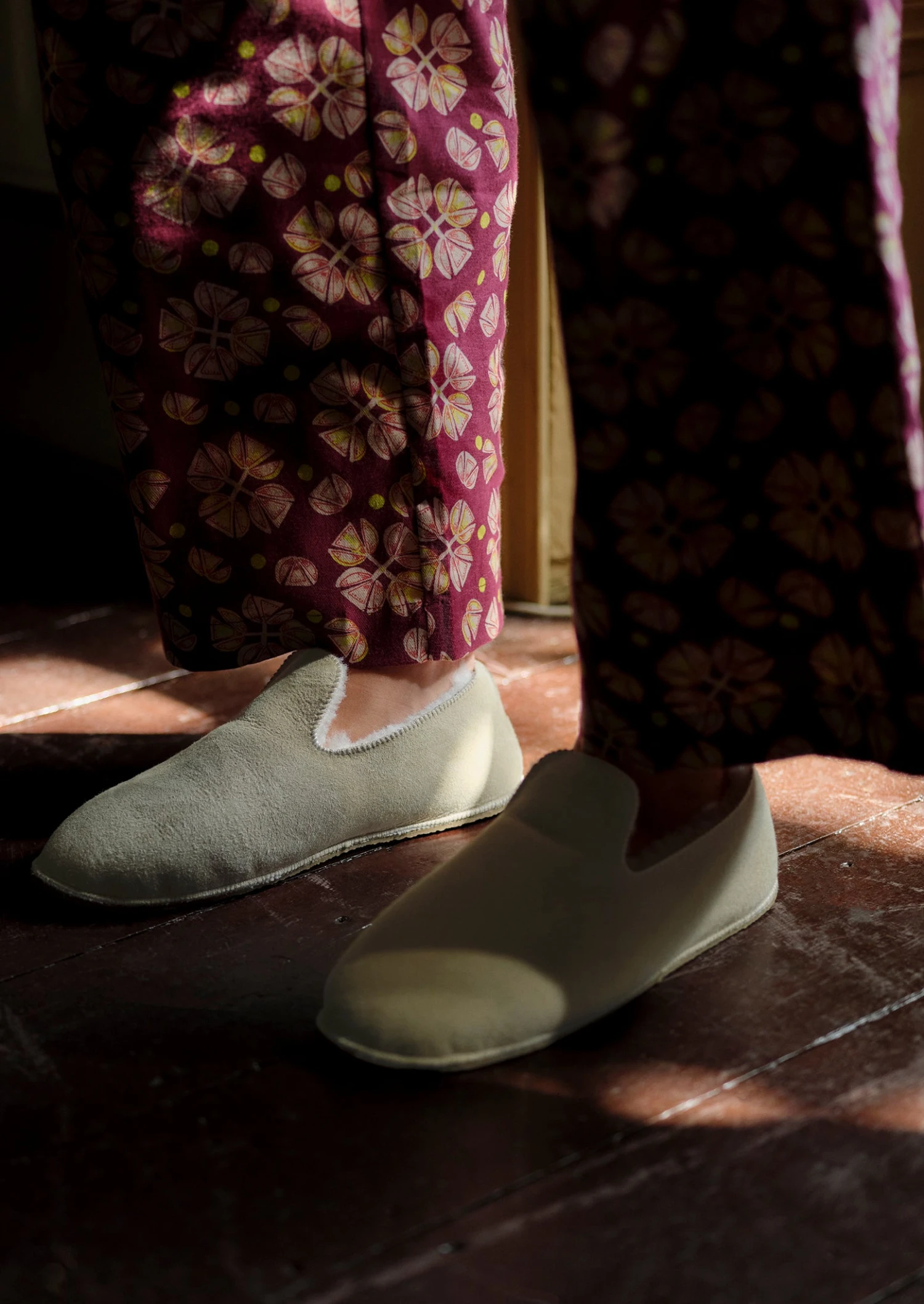 Very soft and sturdy sheepskin. Veg tanned by hand in Italy. Slip on with a curved tongue. Stitch details. Natural rubber sole. Ethically sourced sheepskin. Made by hand by artisans in Portugal using a unique overlocking technique. The wool of the sheepskin adapts to the body’s natural temperature, keeping feet fresh during the warmer months, and warm and cosy in winter.