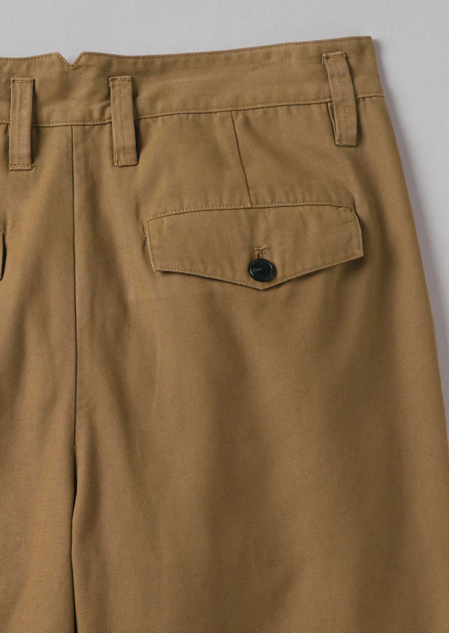 Weighty cotton canvas. Garment-dyed. Belt loops. Double reverse-facing pleats. Side pockets. Back buttoned flap pockets. Back waist slit. Wide legs. Internal French bearer. Zip and button. Horn buttons.