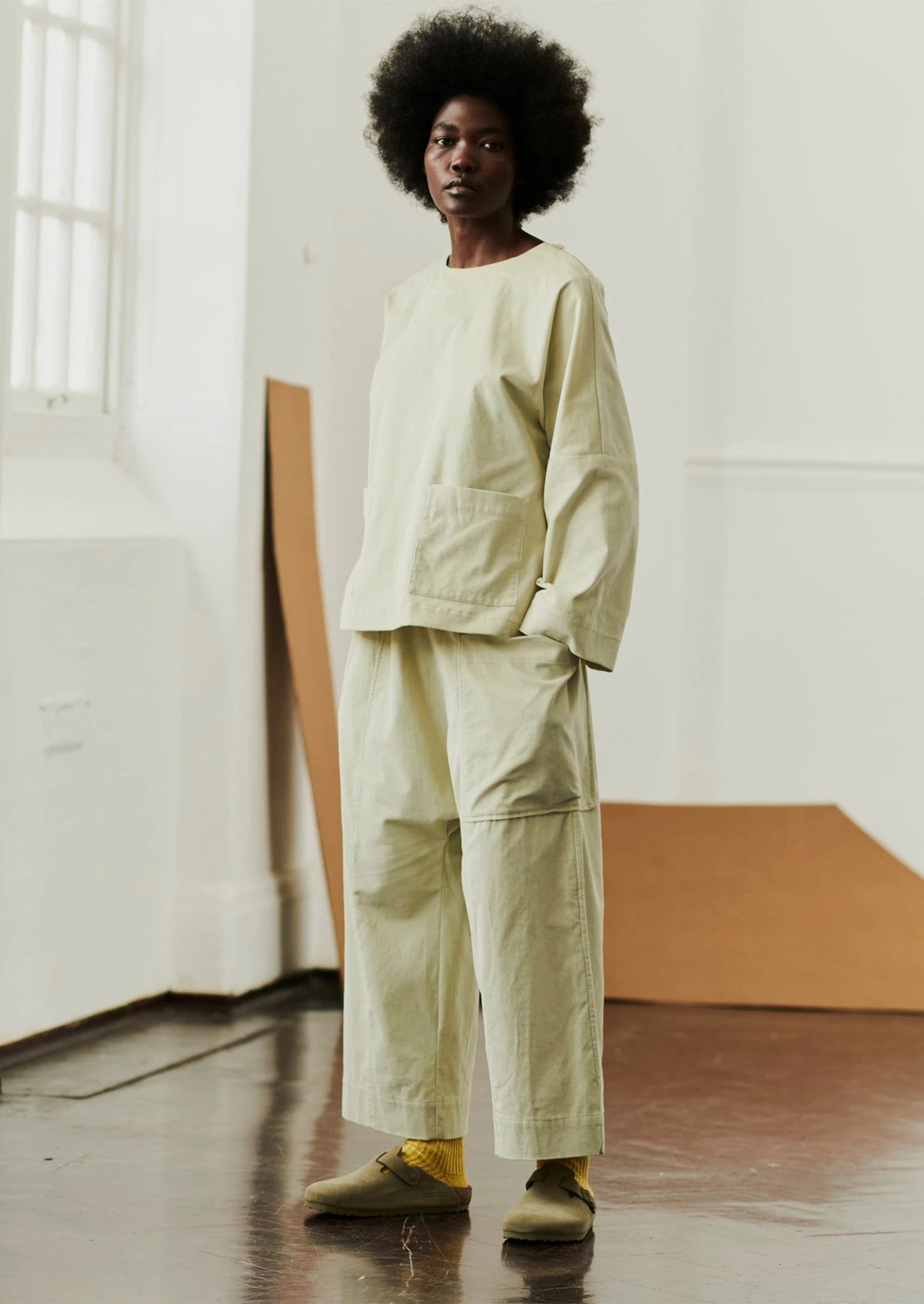 Suede upper, cork latex footbed, EVA sole.