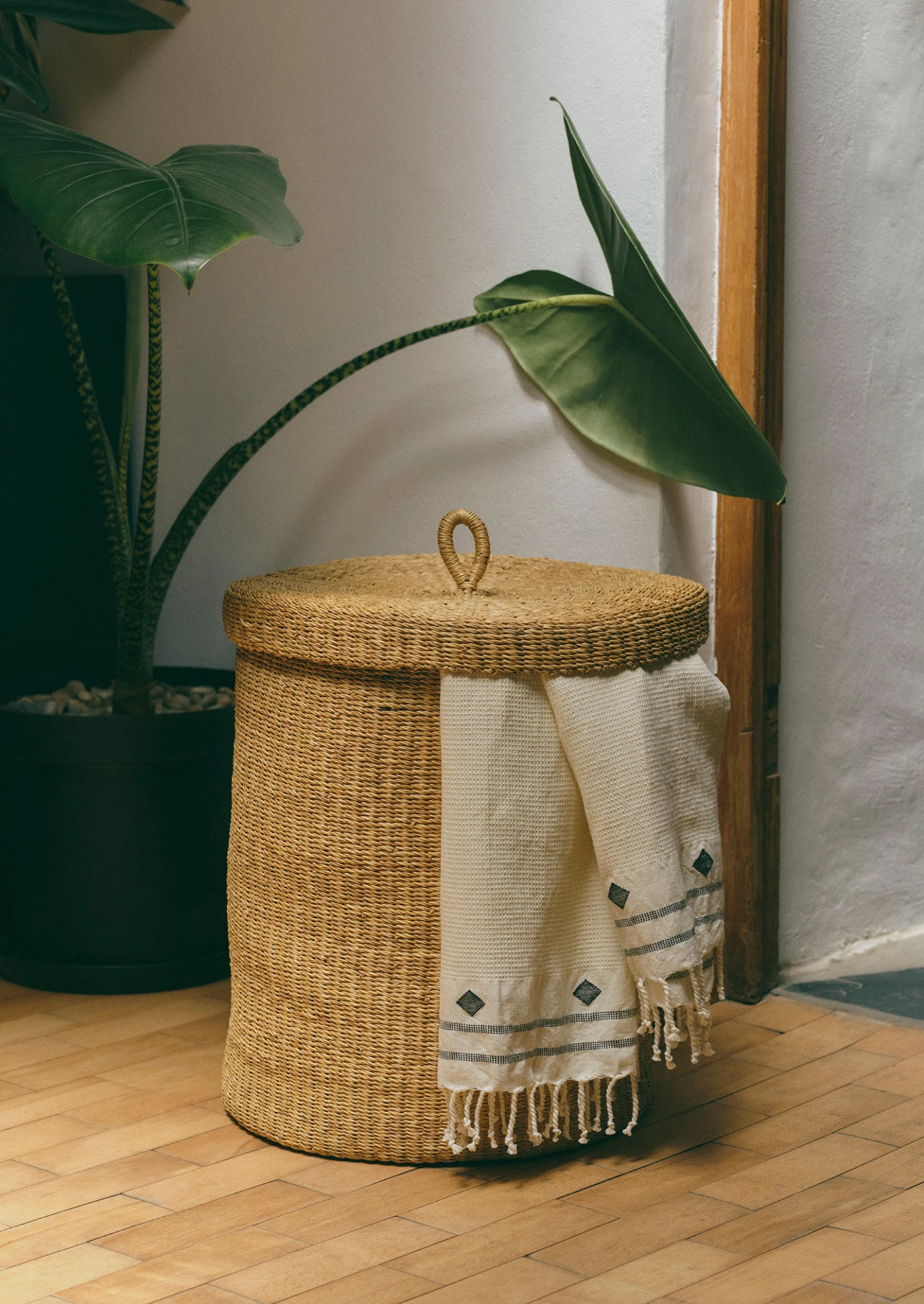 Lidded laundry basket handwoven by artisans in Bolga, Ghana, supported by Frafra Baskets. Made from undyed Veta Vera grass, exclusively for TOAST. Shipped pressed inwards from the artisans in Ghana, to save space. To reshape it, simply sprinkle water on the entire basket, straighten by hand and allow it to dry on a flat surface.