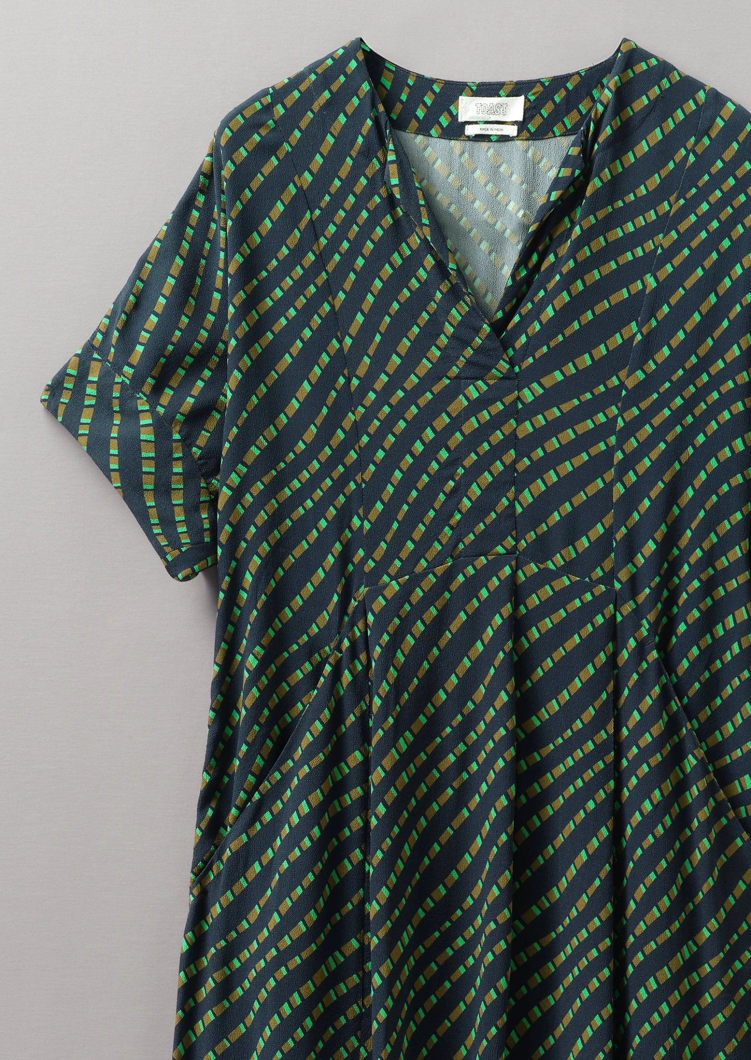 Hand screen-printed in India, our Bryn dress is illustrated by a geometric pattern inspired by garden trellises. Cut from FSC-certified blend crepe to an easy shape with raglan dolman sleeves, falling to a lower-calf length.