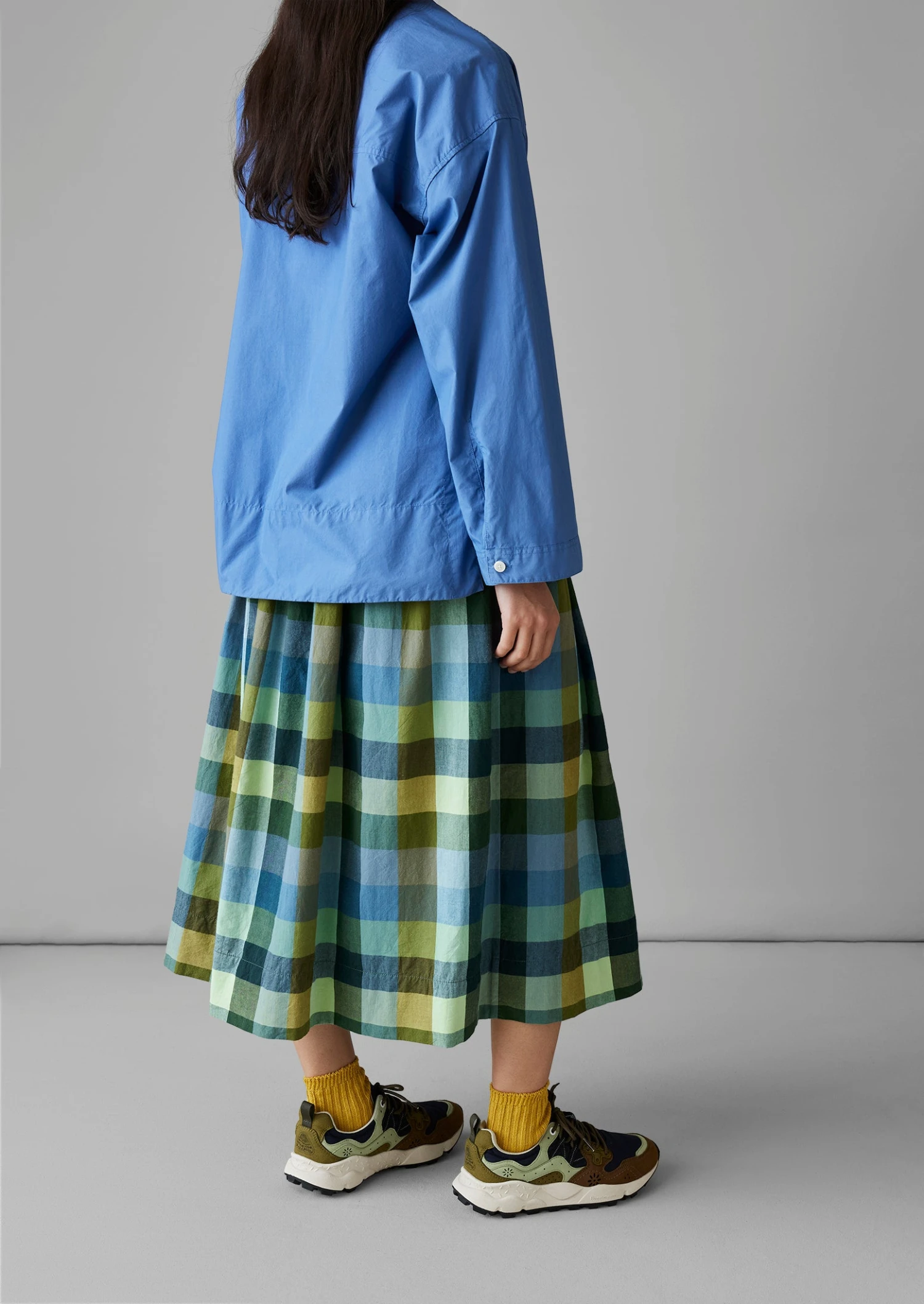 Our swingy skirt is crafted from organic cotton woven with large checks, inspired by vintage textiles in countryside cabins. Shaped with knife pleats below the comfortable elasticated waist and falling to a lower-calf length.