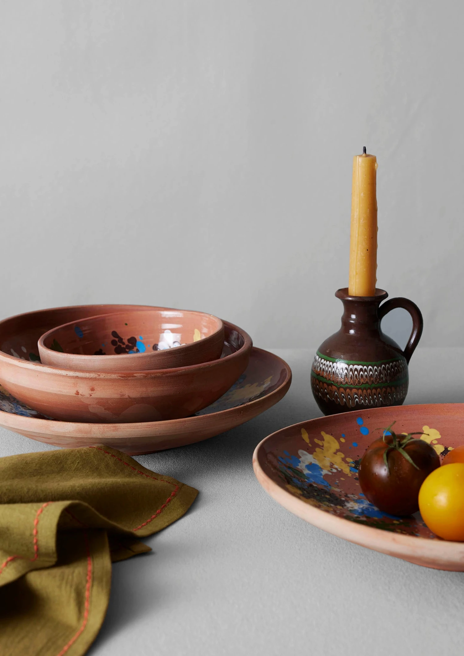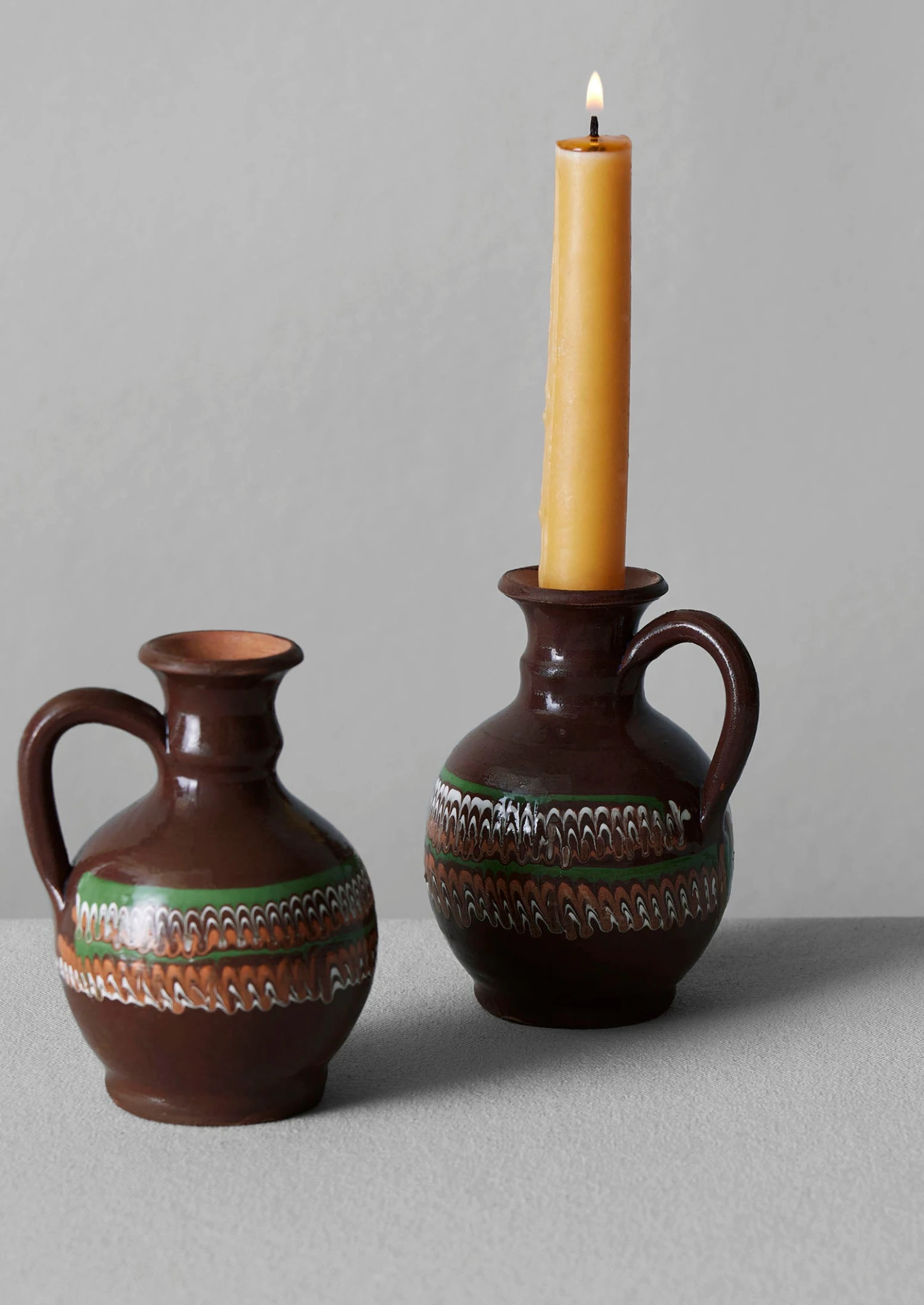 Dinner candle holder hand-thrown from clay collected locally from Ulmet hill near Horezu, Romania, where it’s been extracted carefully for hundreds of years, then shaped using a kick wheel.