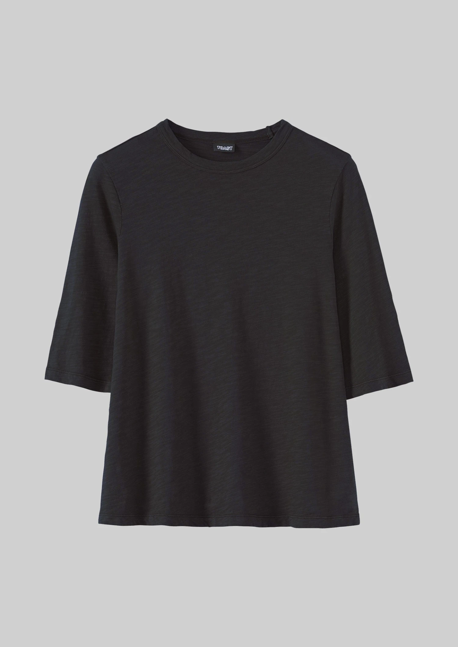 Lightweight slubby organic cotton jersey. Garment-dyed. Bound crew neck. Set-in elbow-length sleeves. Twin-needle-stitched edges.