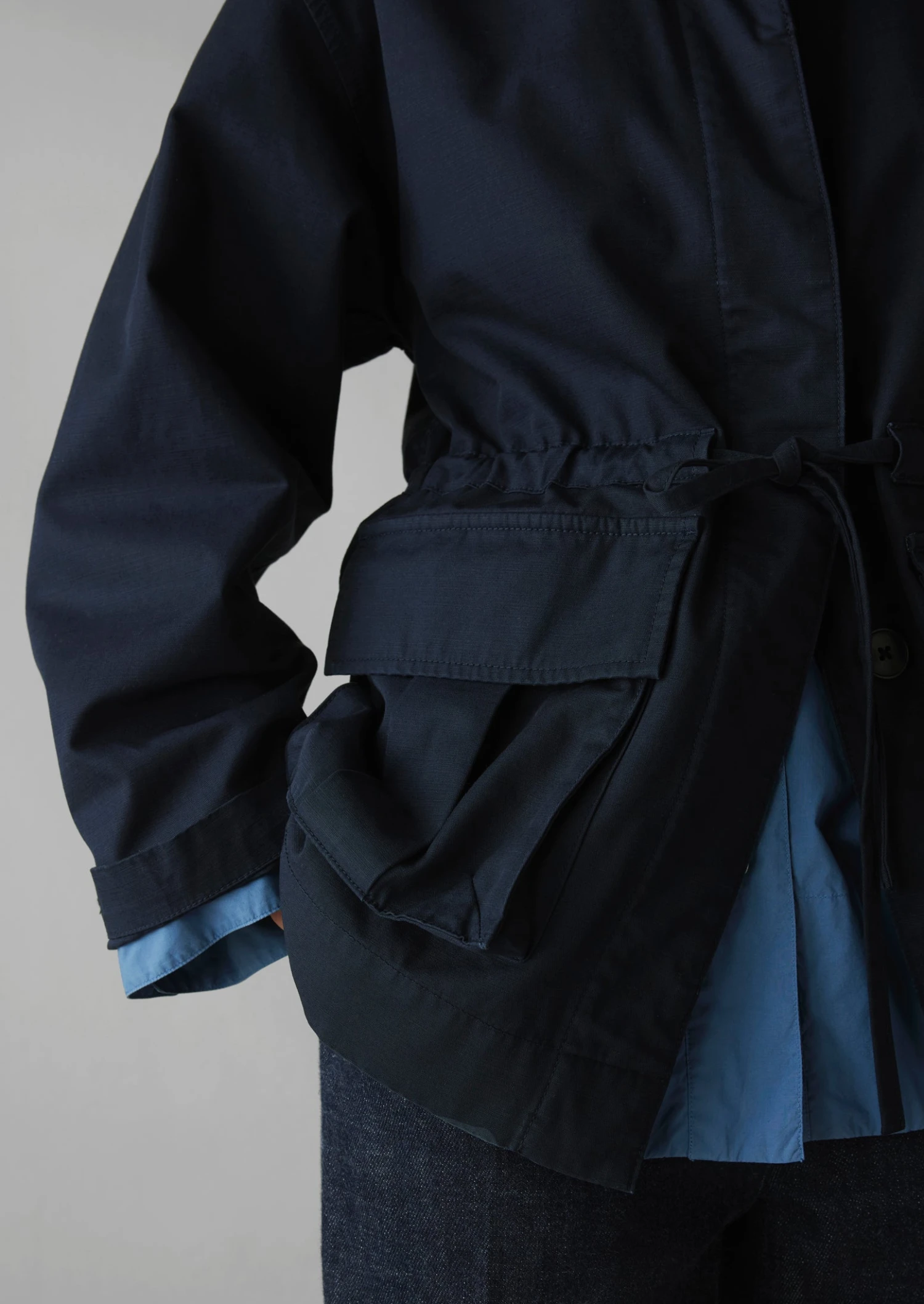 Drawstrings cinch in the waist of our utility jacket, bringing definition and texture to the straight shape. Crafted from compact organic cotton with dropped sleeves and side safari pockets, then accented by horn buttons.