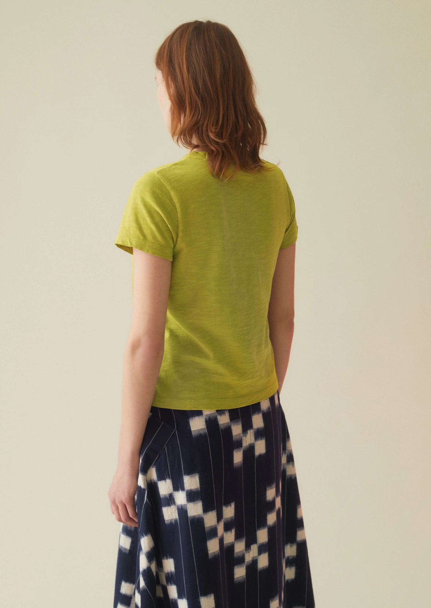 Soft cotton jersey. Garment-dyed. Straight shape. High round neckline. Edge twin-needle stitching.