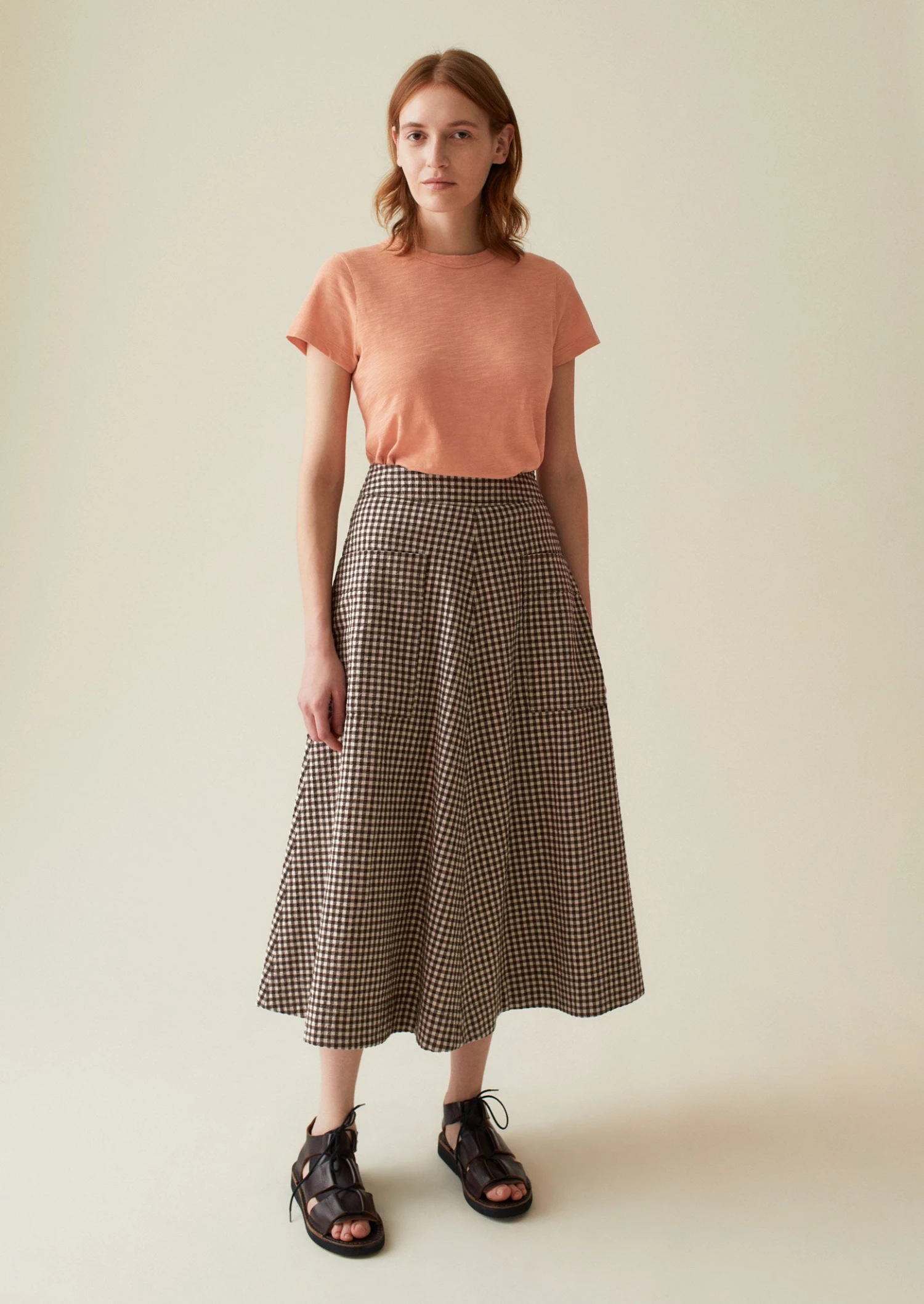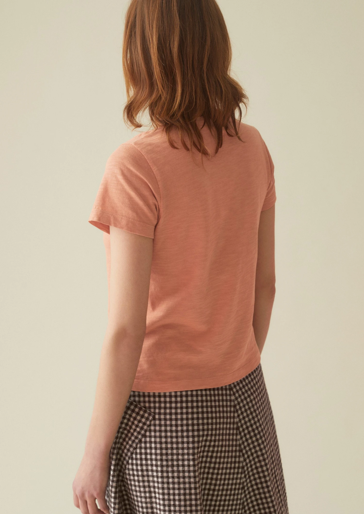 Soft cotton jersey. Garment-dyed. Straight shape. High round neckline. Edge twin-needle stitching.