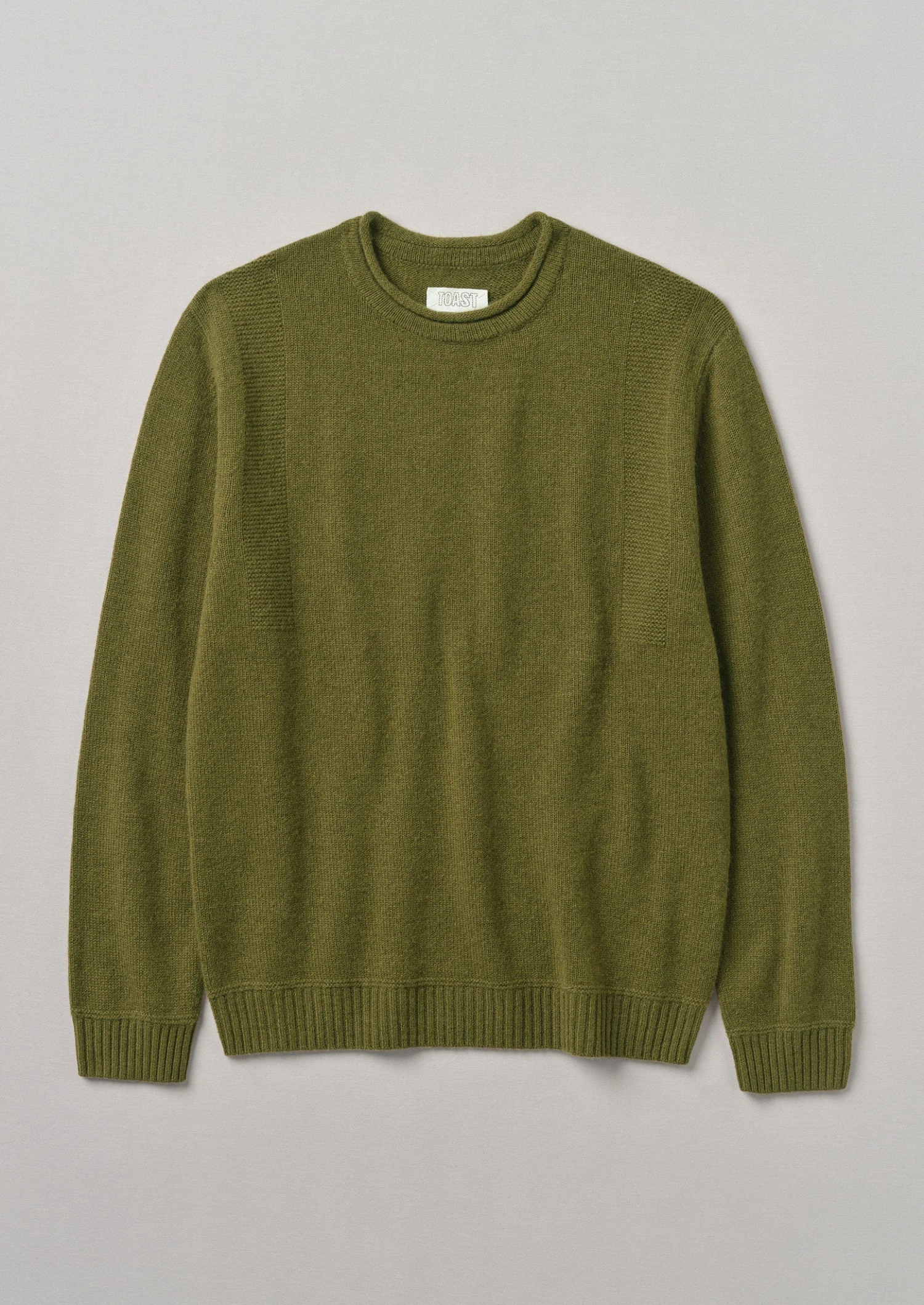 Wool and recycled cashmere blend. Rolled crew neck. Ribbed shoulders and edges. Link-stitched shoulders and cuffs.