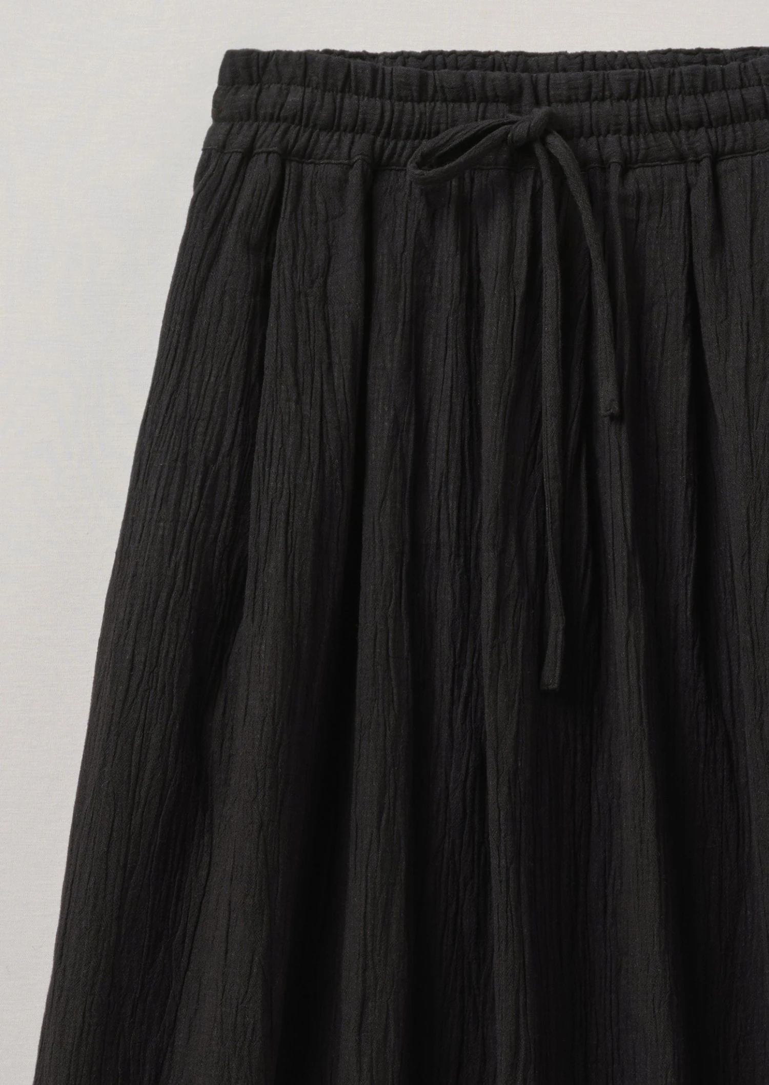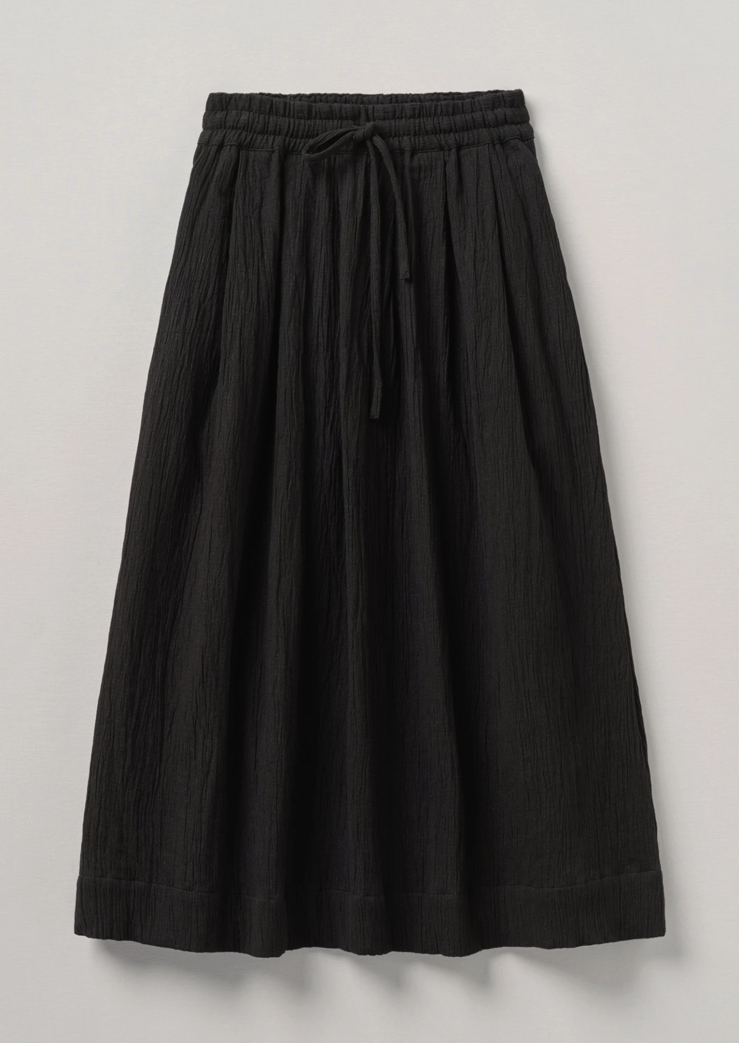 Crinkled cotton. Elasticated waist. Front knife pleats. Side pockets. Lower-calf length.