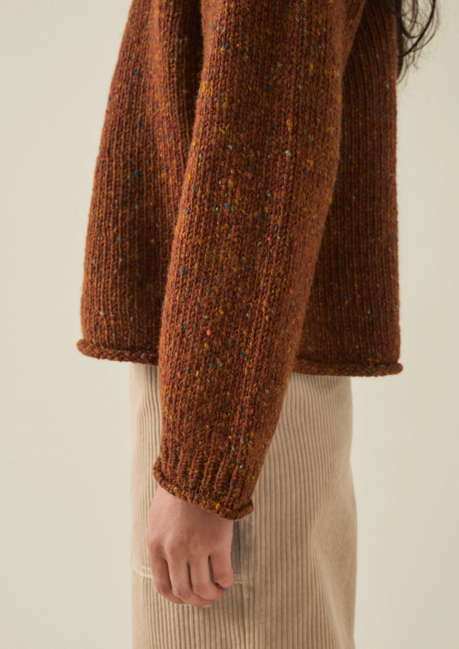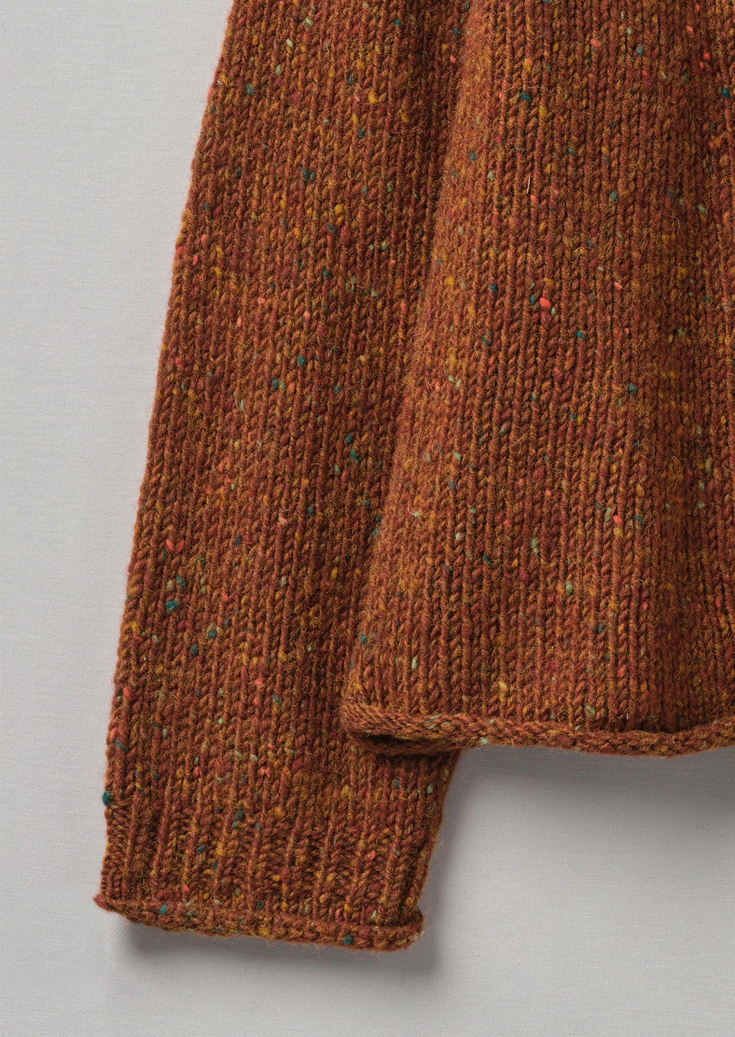 Donegal-spun wool. Rolled edges. Raglan sleeves. Integral ribbed neck and hem.