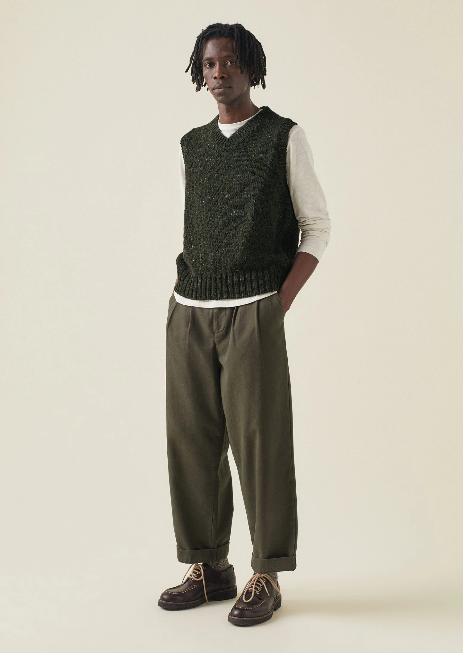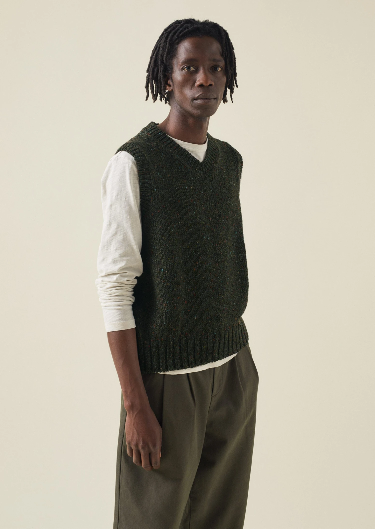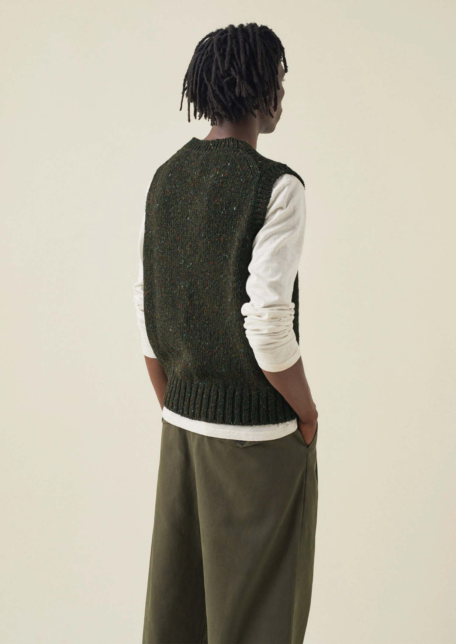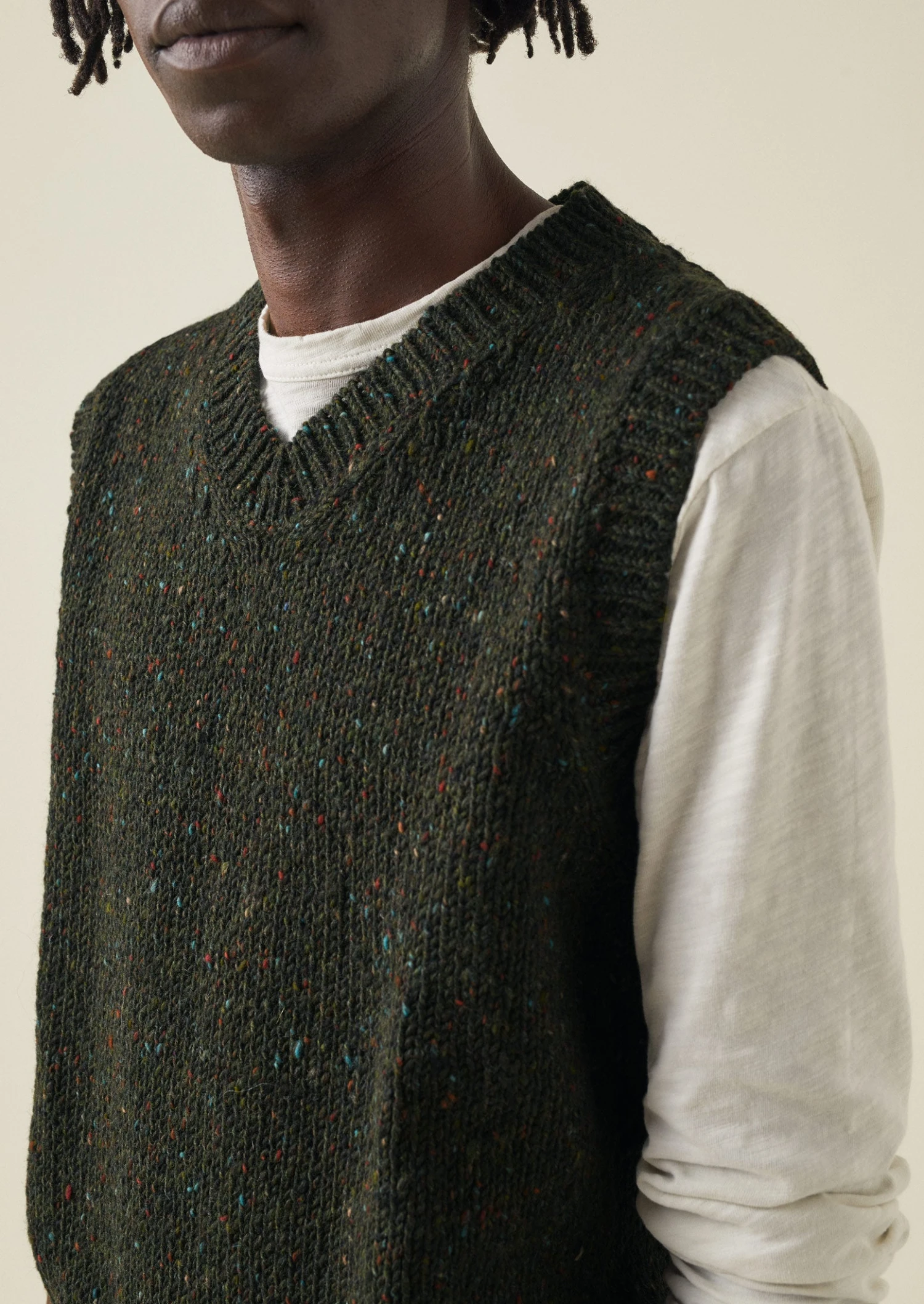 Donegal-spun wool. V-neck. Ribbed edges.