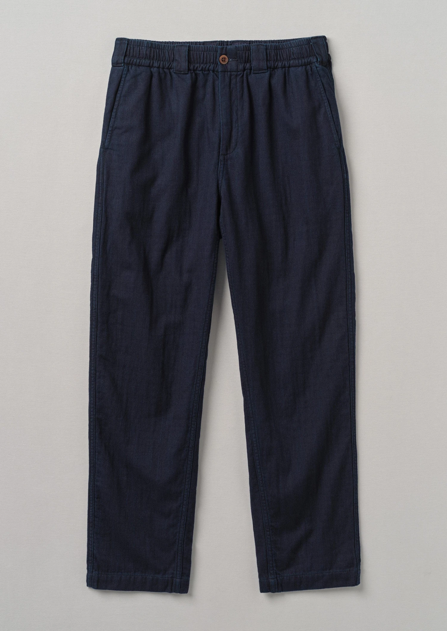 Double-faced Japanese cotton denim. Elasticated waist. Internal drawstrings. Side pockets. Back buttoned flap pockets. Inner leg panels.