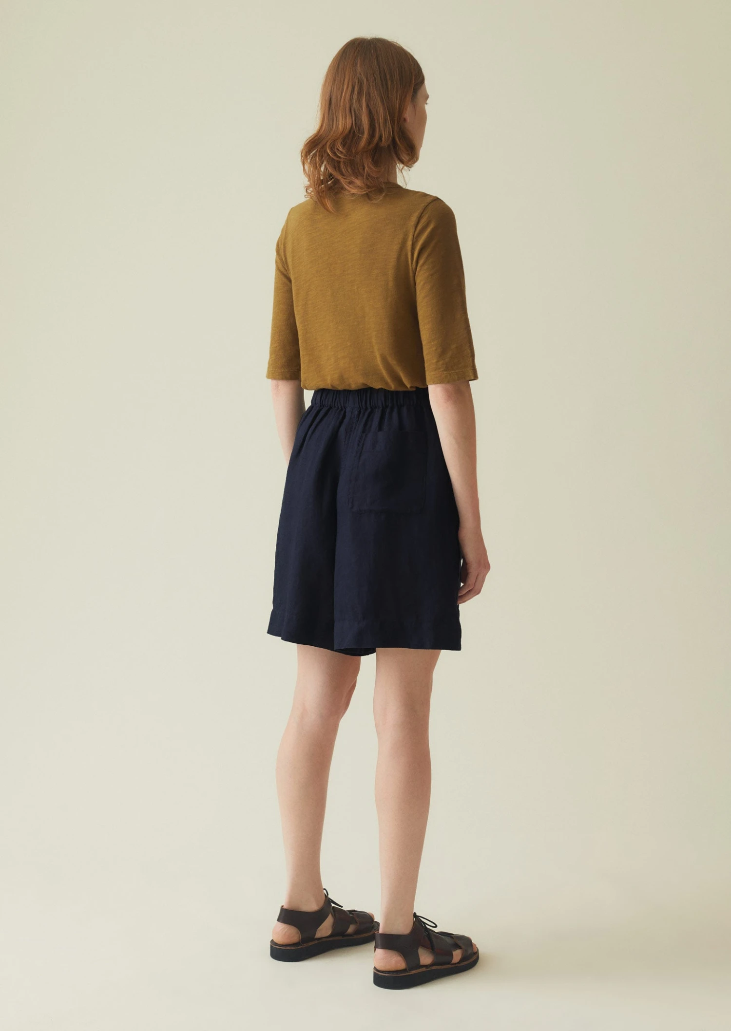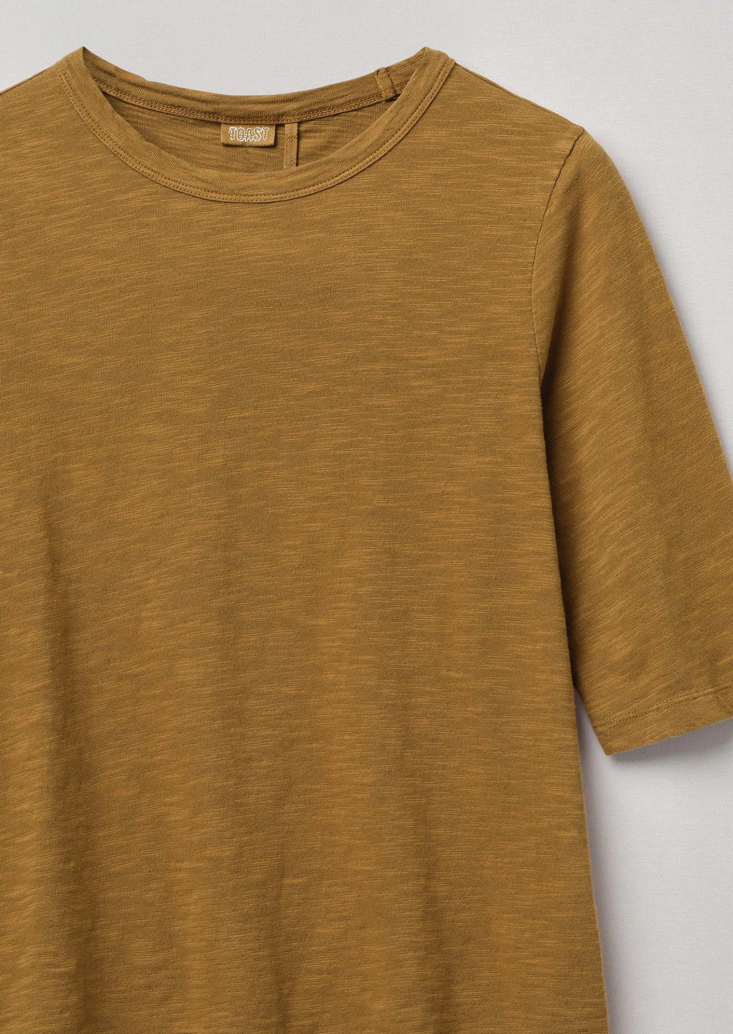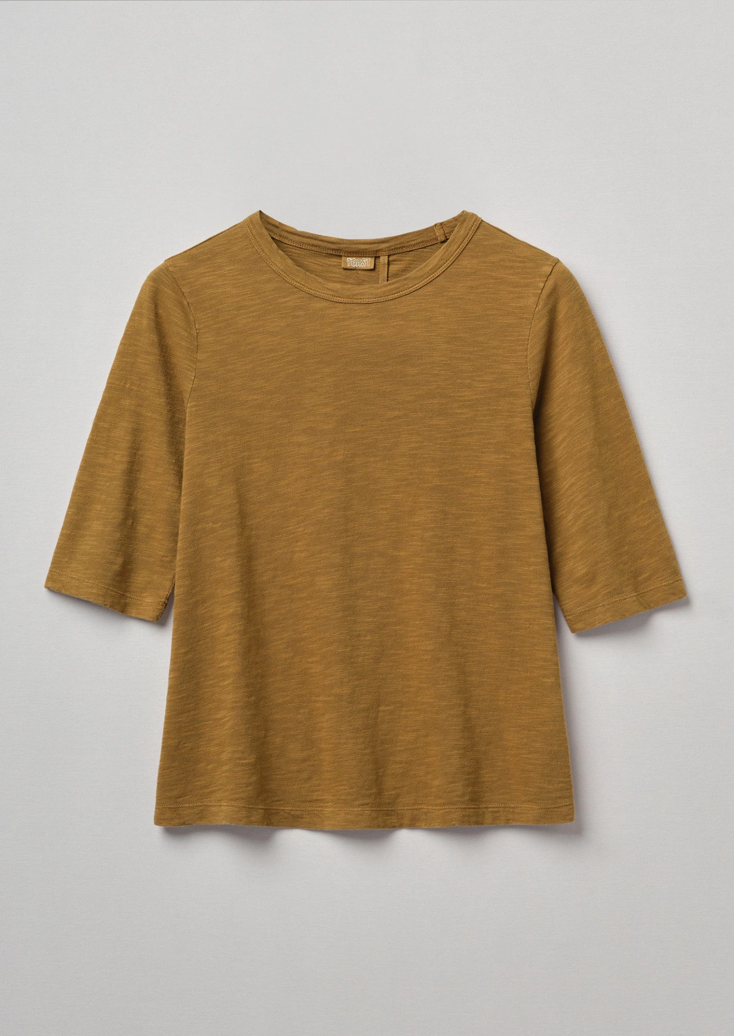 Our Emma tee is crafted from soft, slubby cotton jersey, then garment-dyed for a rich depth of colour. Cut to a roomy A-line shape with three-quarter-length sleeves, falling to a straight hem.