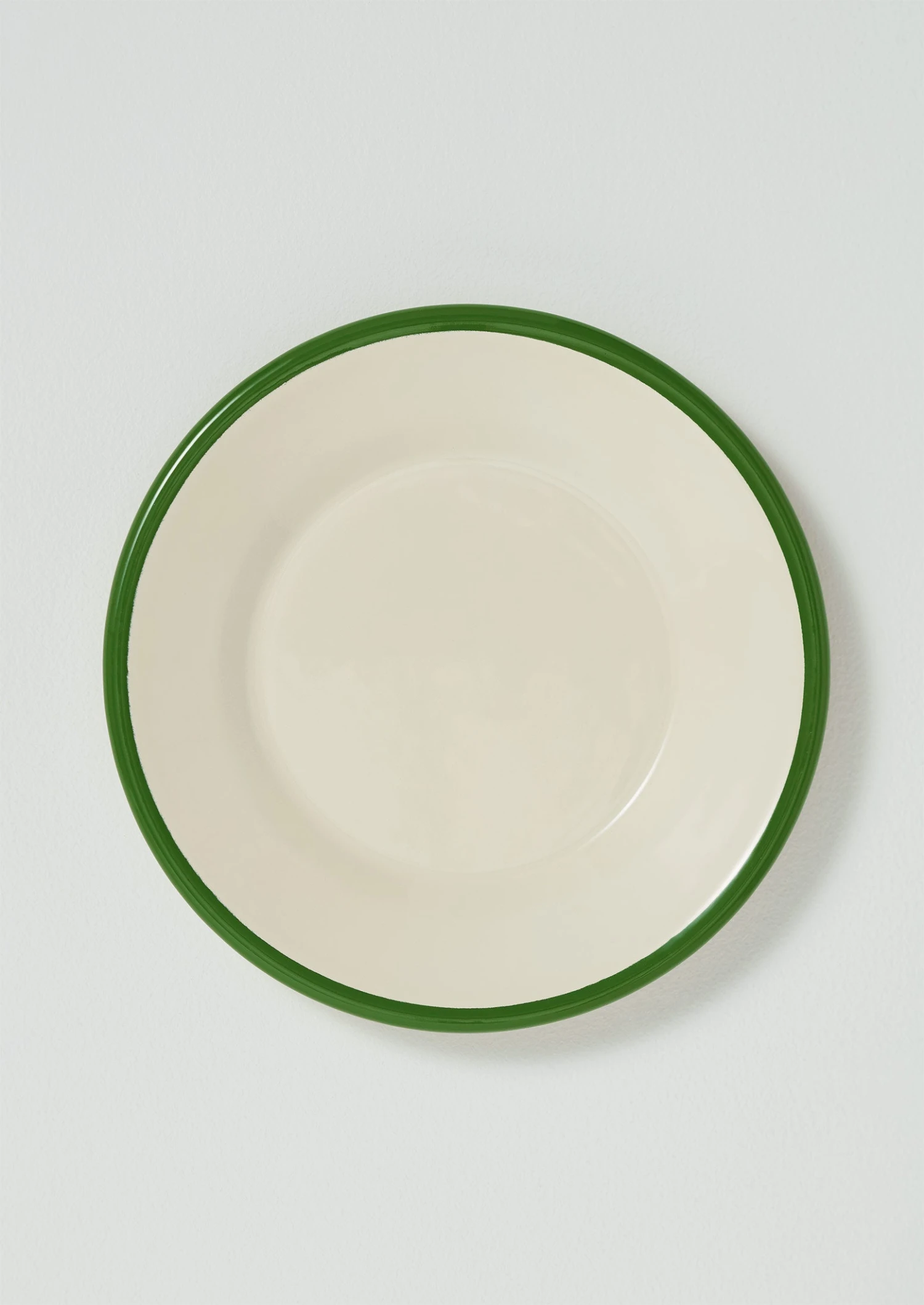 Traditional, durable and smooth, porcelain-infused enamel plate for the kitchen, for camping, or as you will. With a contrasting colour rim and outer. With a small amount of colour variation from batch to batch.