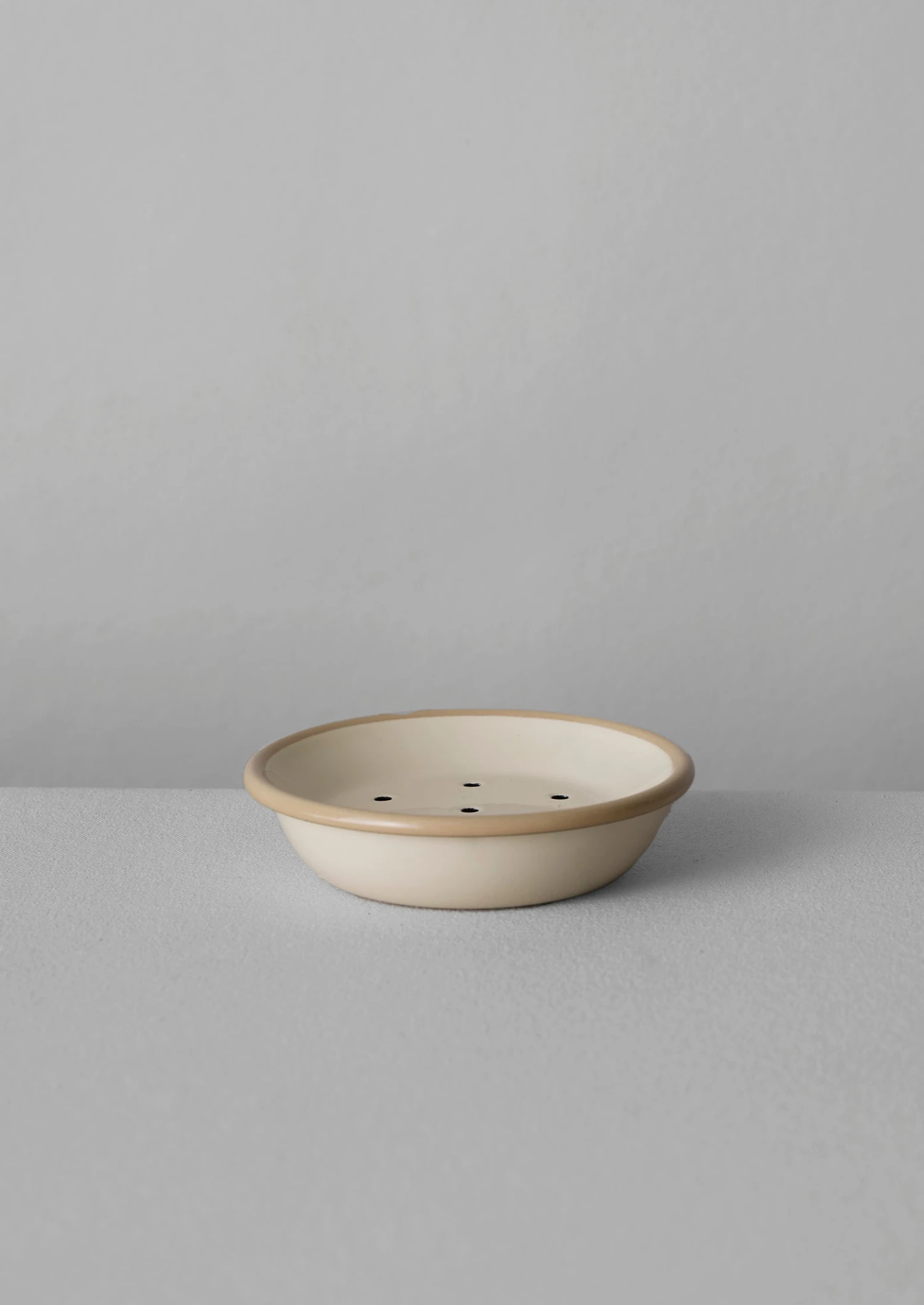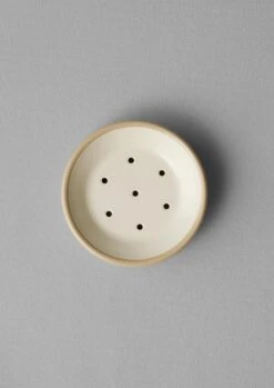 Functional round soap dish with a perforated base for drainage. Crafted in Turkey from durable and smooth, porcelain-infused enamelware. With a small amount of colour variation from batch to batch.