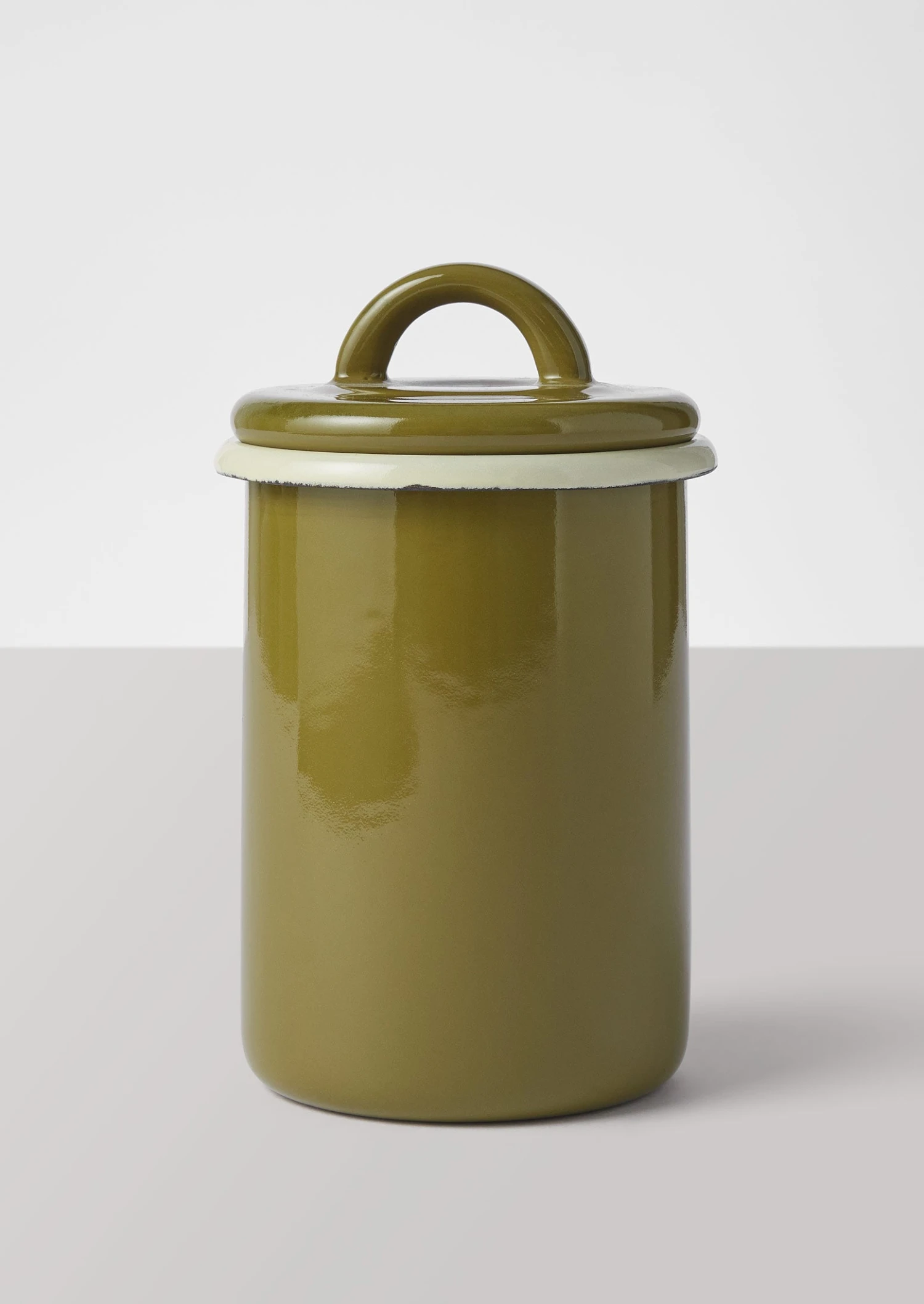 Traditional, durable and smooth, porcelain-infused enamel storage jar for the kitchen. With a handled lid accented by a contrasting rim. With a small amount of colour variation from batch to batch.