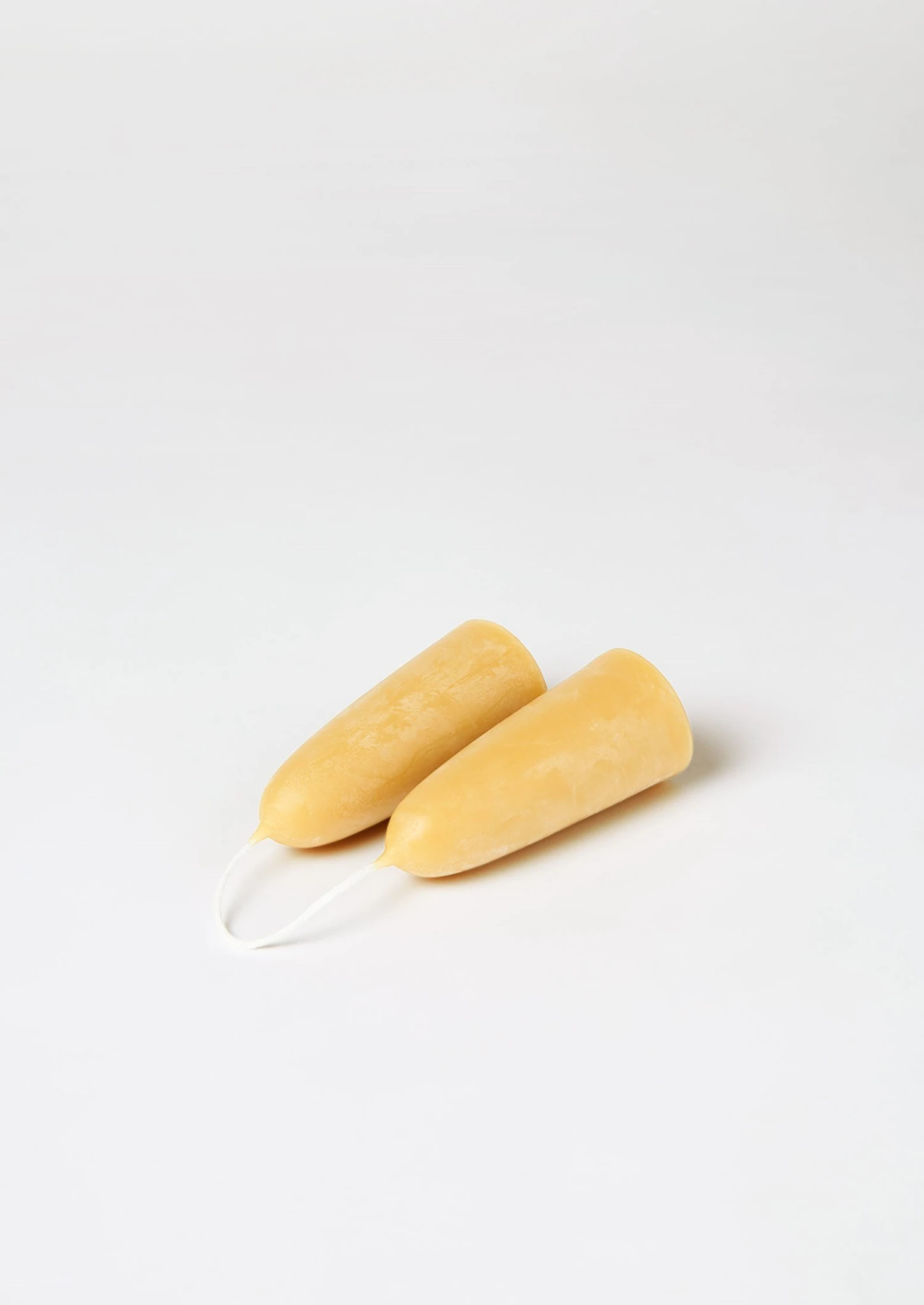 Subtly honey-scented with a natural hue, burning with a cleaner flame than non-beeswax candles. Set of two joined at the wick, in a recycled brown paper box.