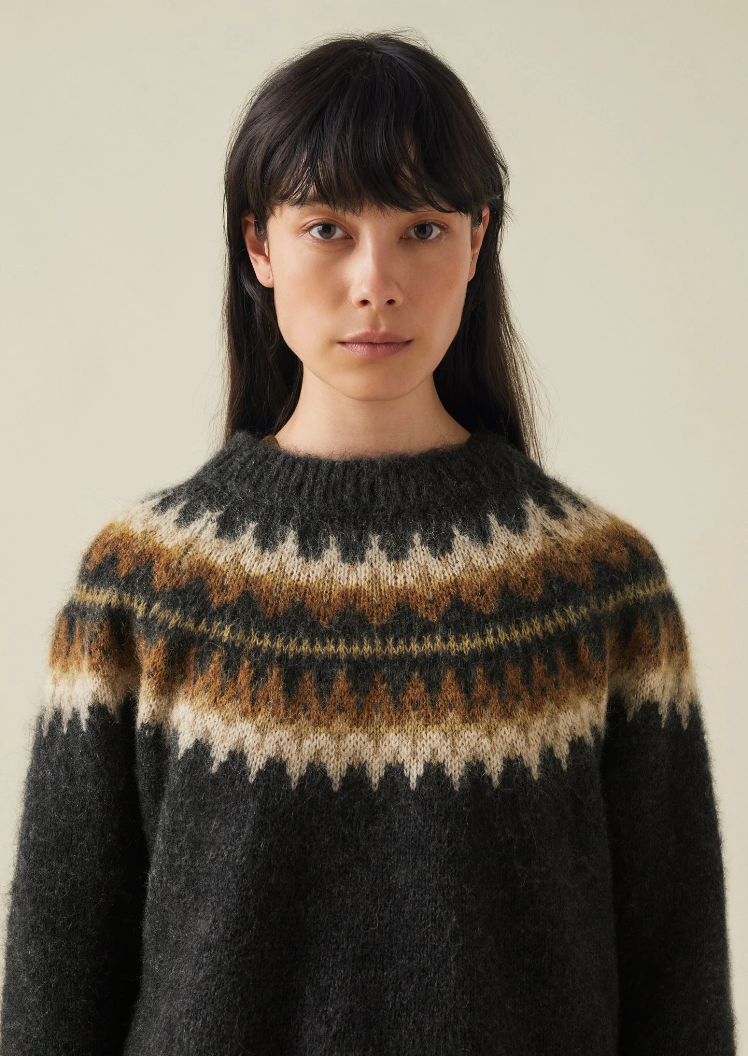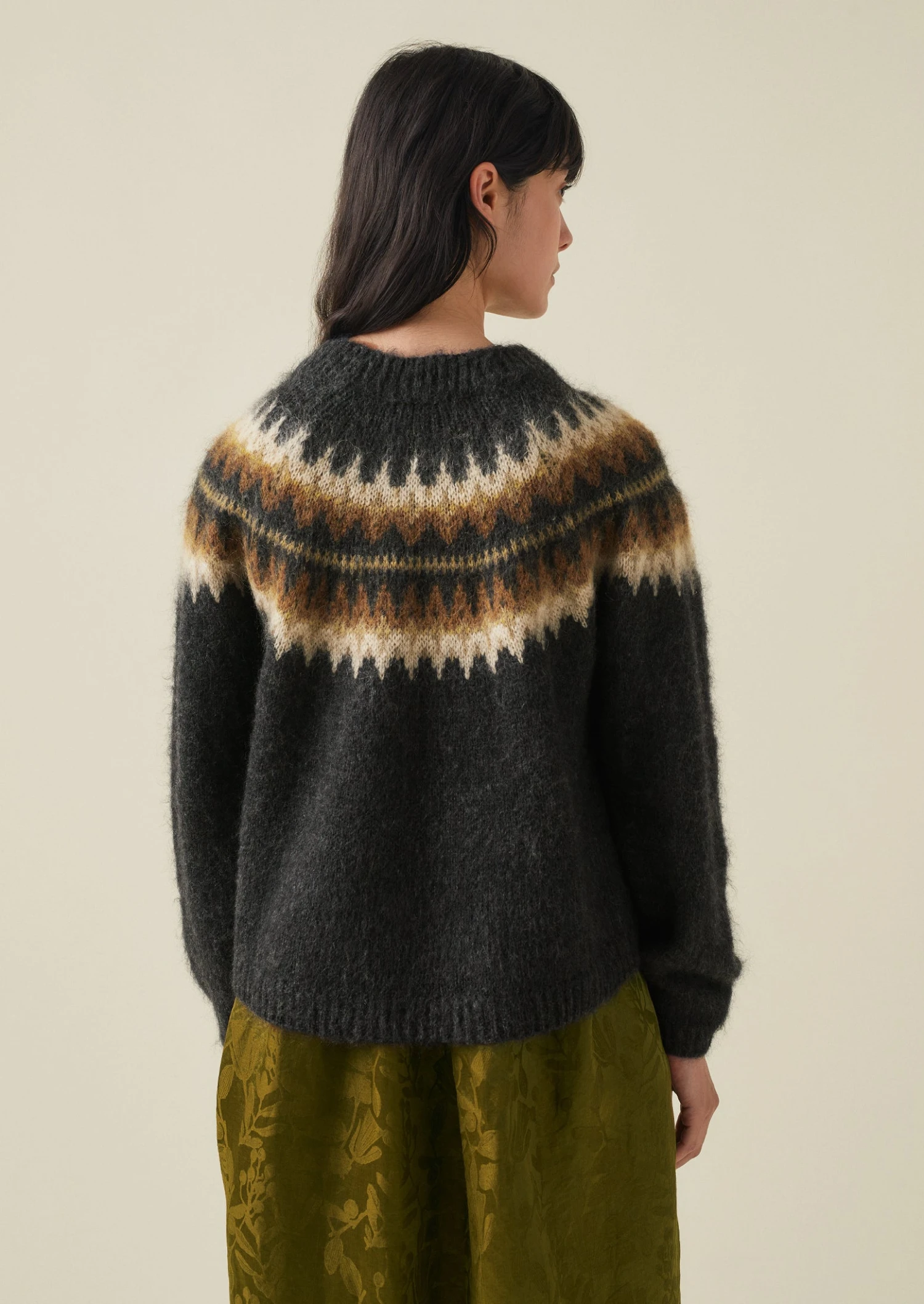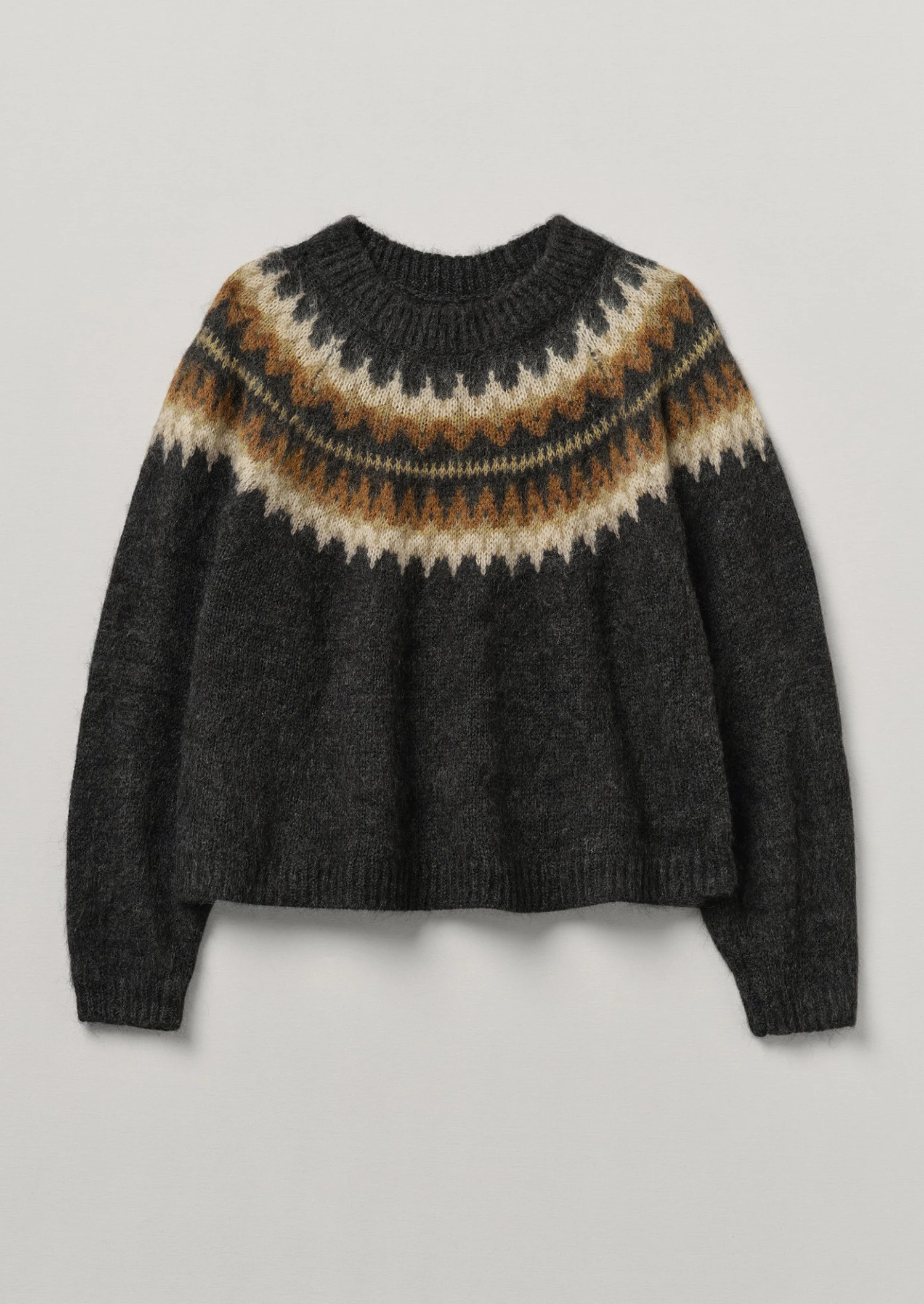 Our sweater is knitted from two yarns – one wool, the other a mohair blend – for a lofty texture which is accentuated by the brushed finish. Knitted to an easy shape with a Fair Isle-inspired jacquard yoke and finished with ribbed edges.
