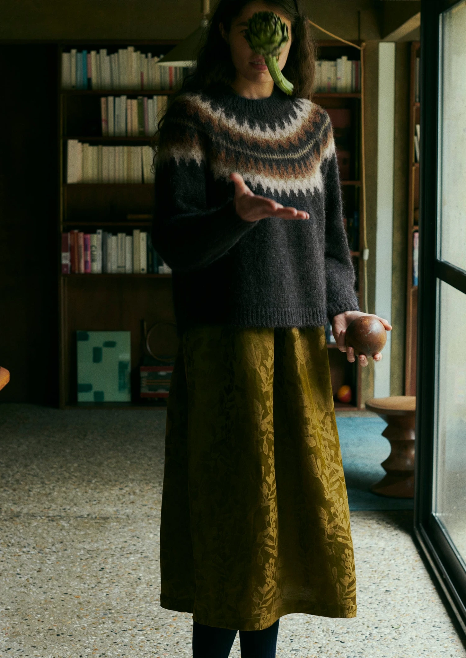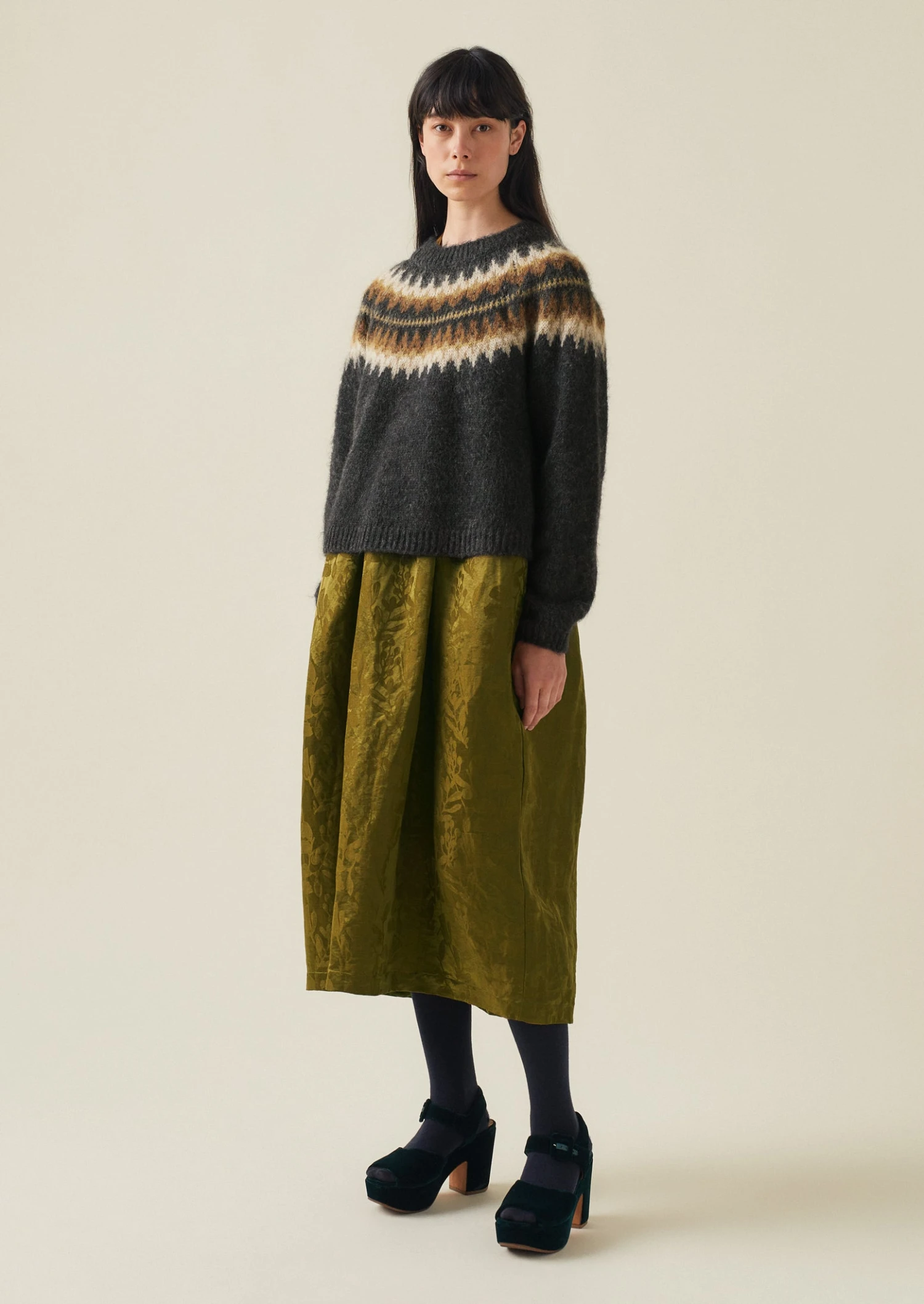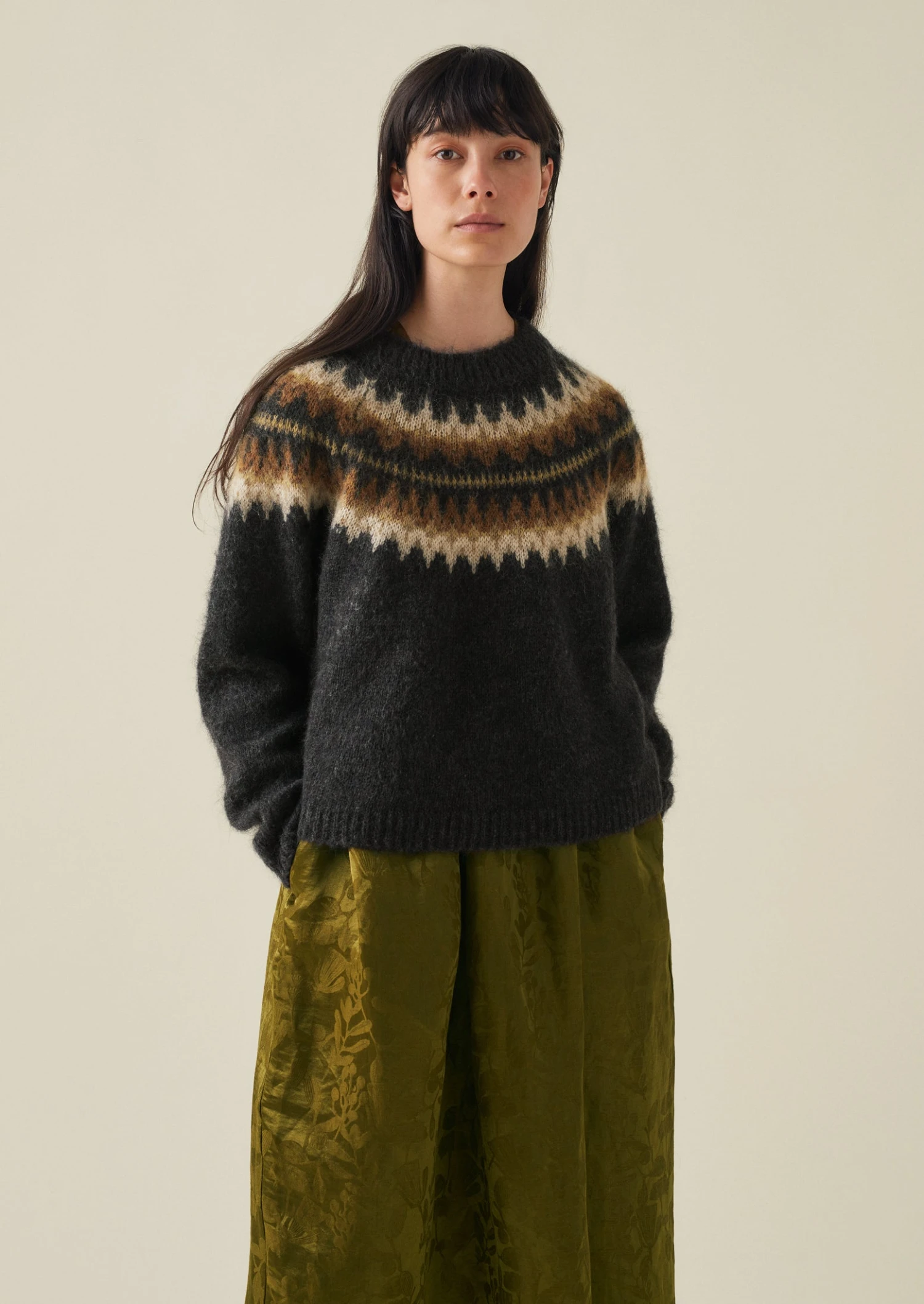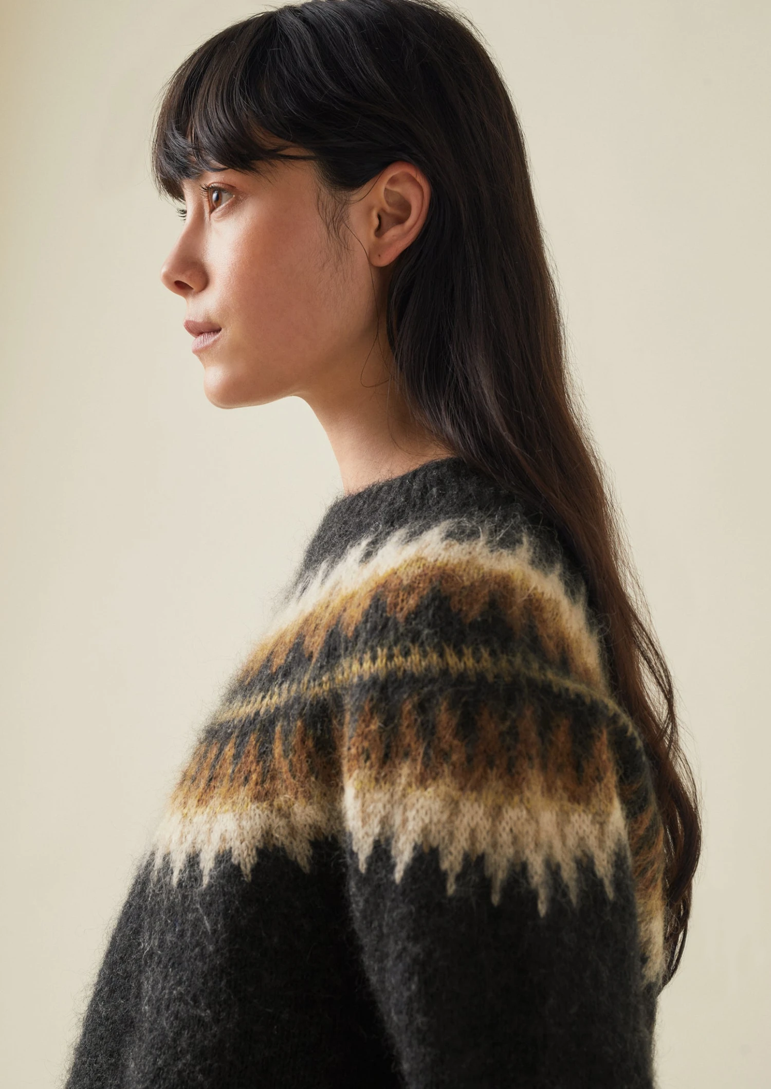 Our sweater is knitted from two yarns – one wool, the other a mohair blend – for a lofty texture which is accentuated by the brushed finish. Knitted to an easy shape with a Fair Isle-inspired jacquard yoke and finished with ribbed edges.