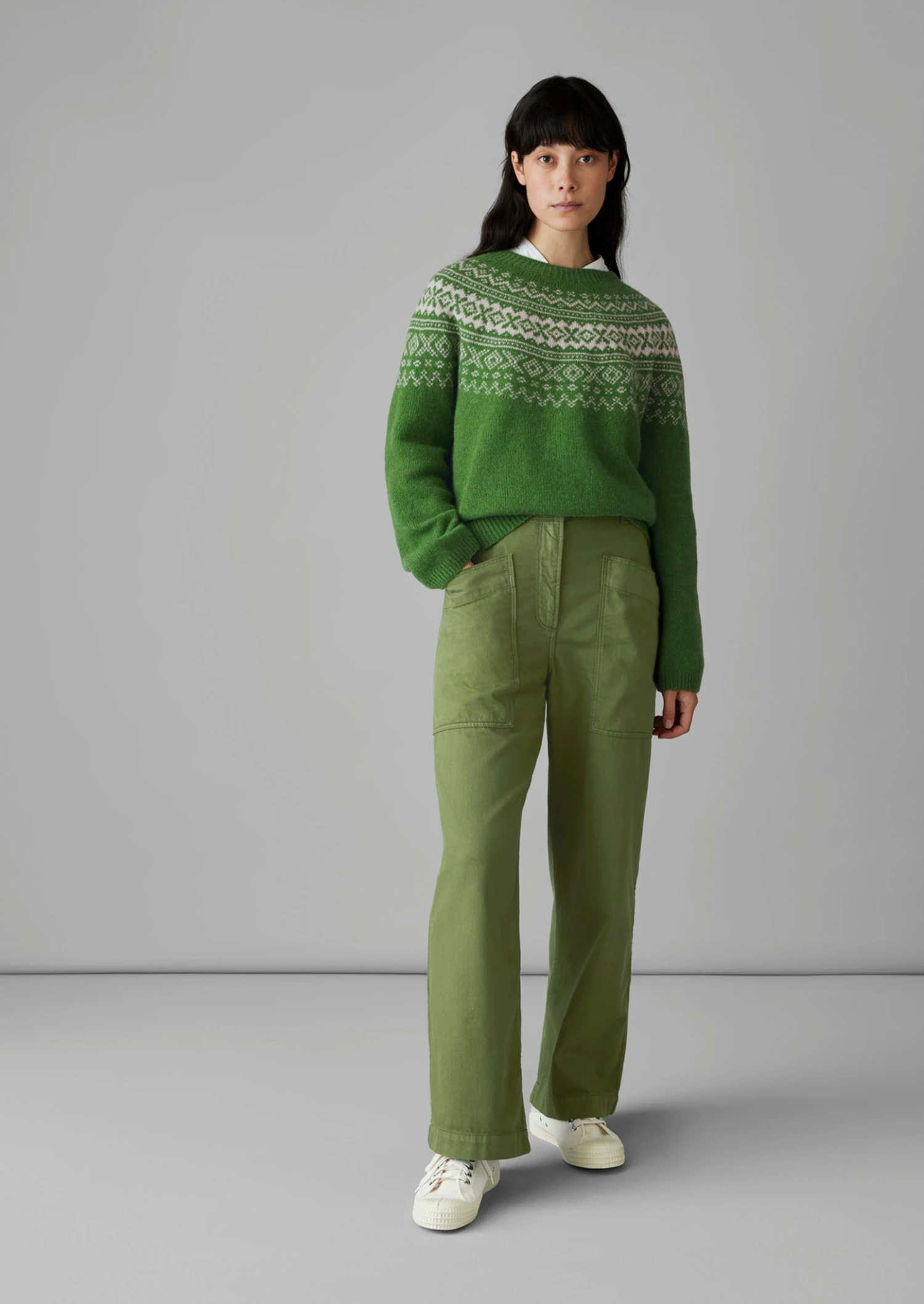 An intricate geometric Fair Isle pattern runs around the shaped yoke and sleeves of our sweater. Knitted in Scotland from soft wool to an easy shape with elongated sleeves, ending with rolled cuffs.