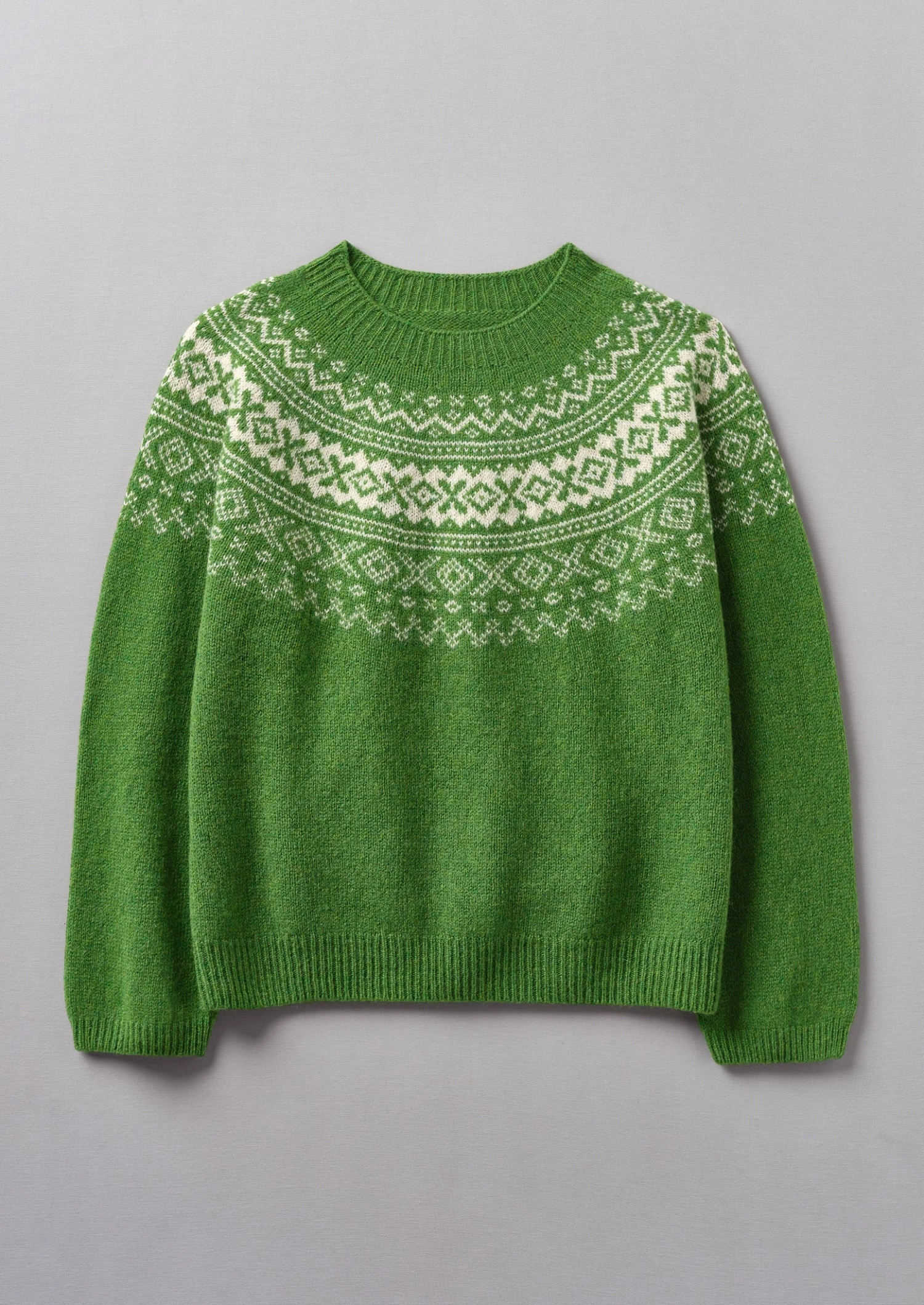 Soft wool. Fair Isle jacquard. Easy shape. Shaped yoke. Elongated sleeves. Rolled cuffs. Integral ribbed edges. Low-hip length.