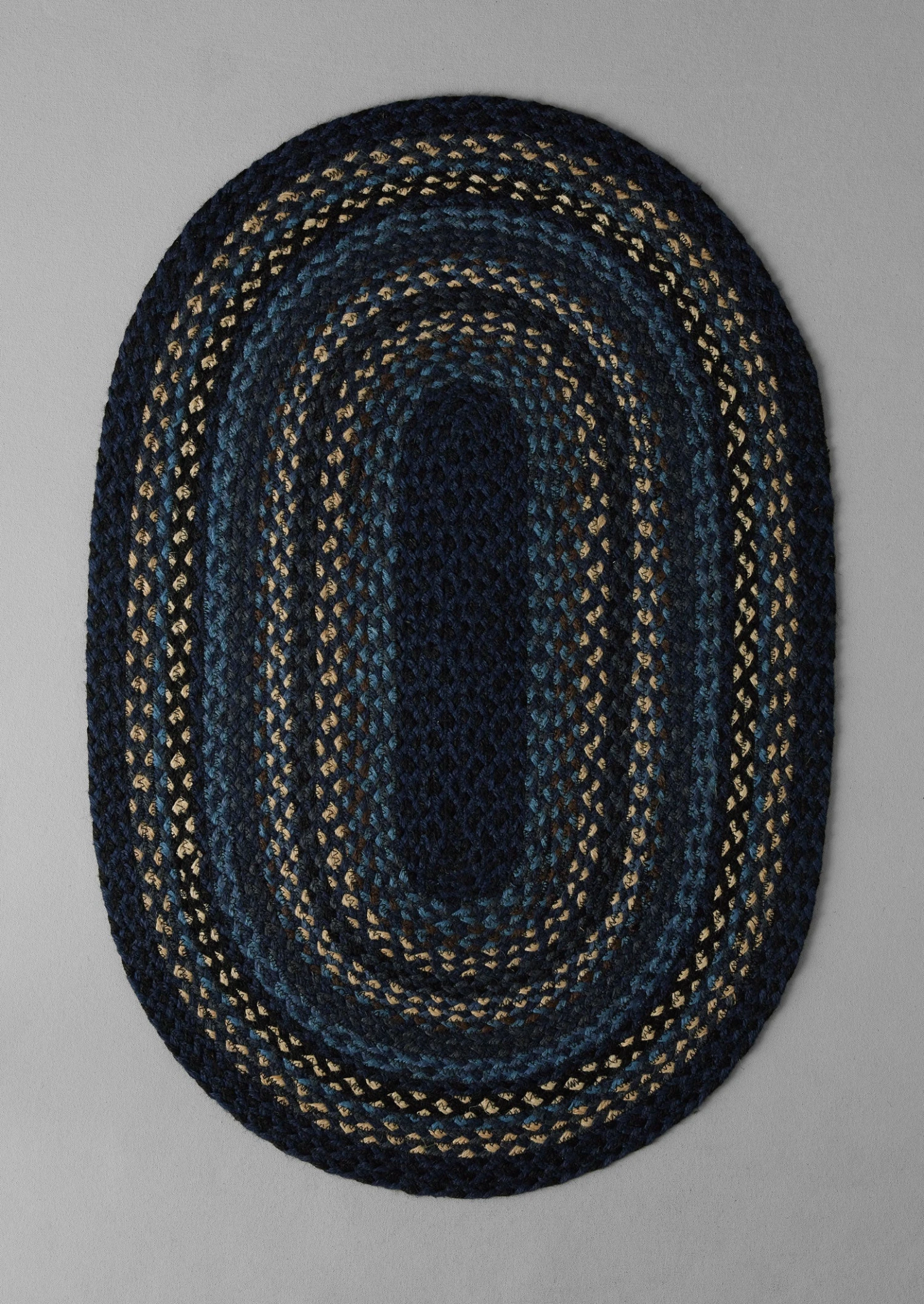 Cheerful doormat from The Braided Rug Company, hand-braided from organic jute by women artisans in India to an oval shape. Double-sided and durable, with colourful stripes and a soft curved edge.