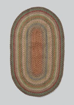 Uplifting, bright rug from The Braided Rug Company, hand-braided from organic jute by women artisans in India to an elongated oval shape. Double-sided and durable, with colourful stripes and a soft curved edge.