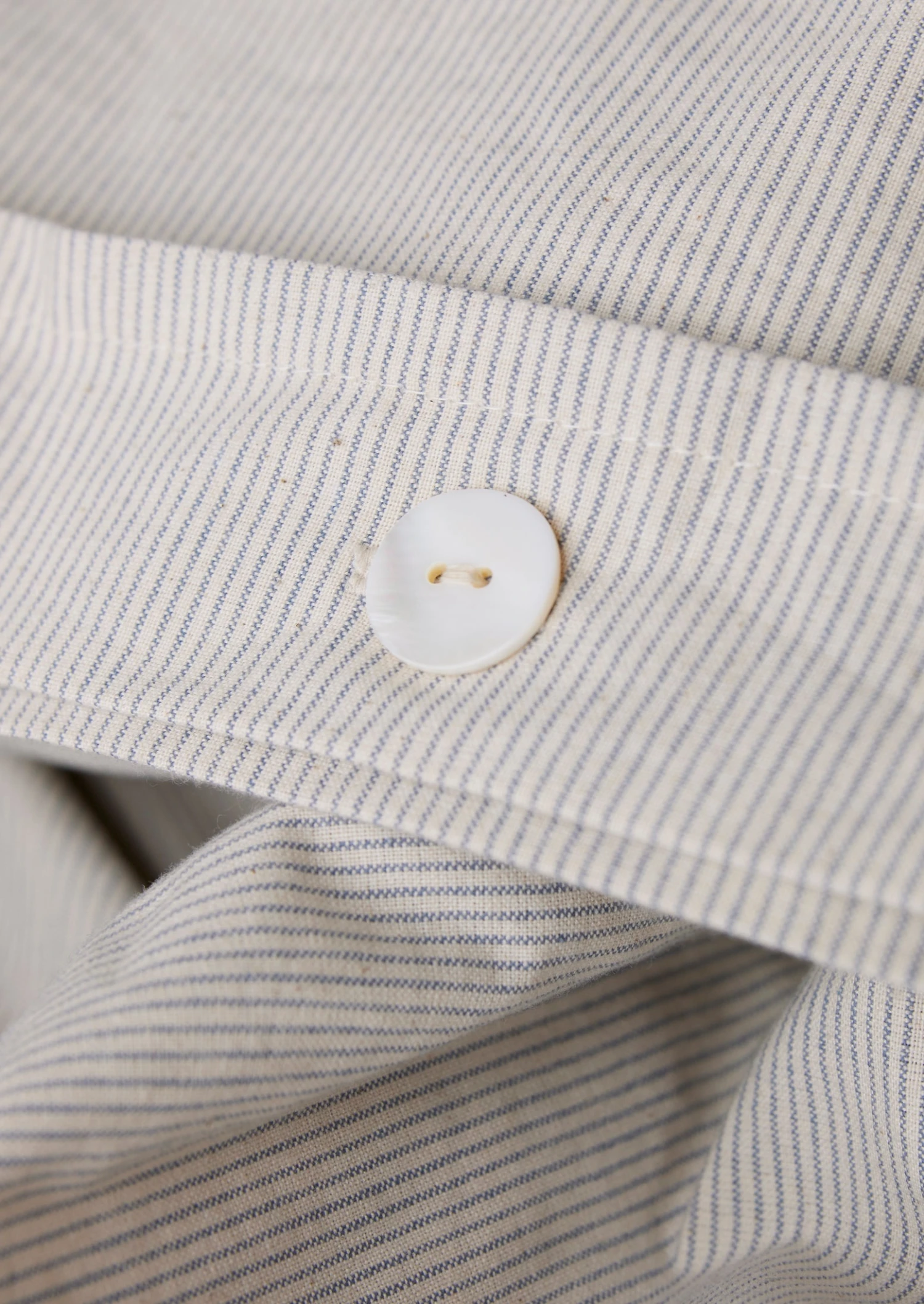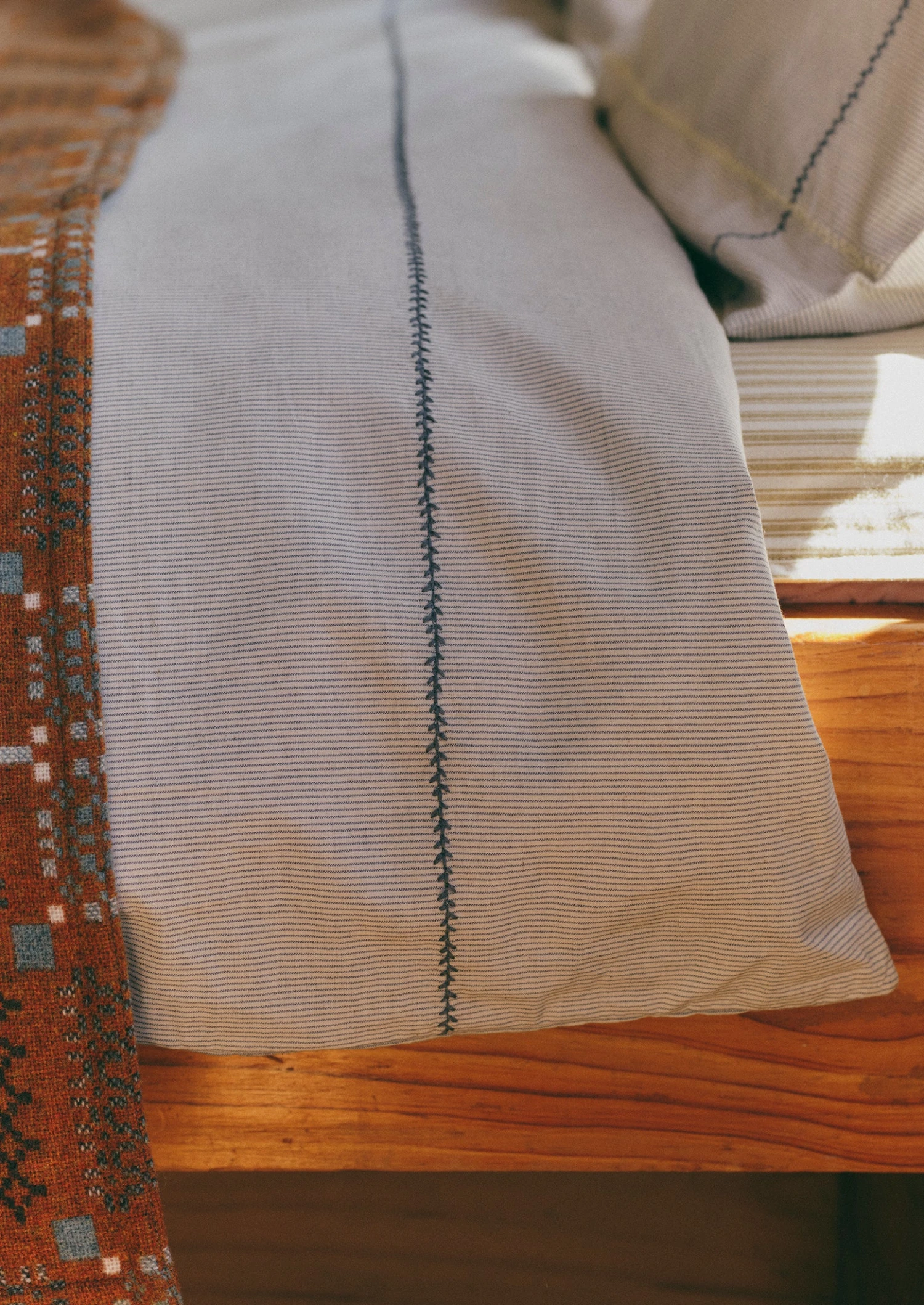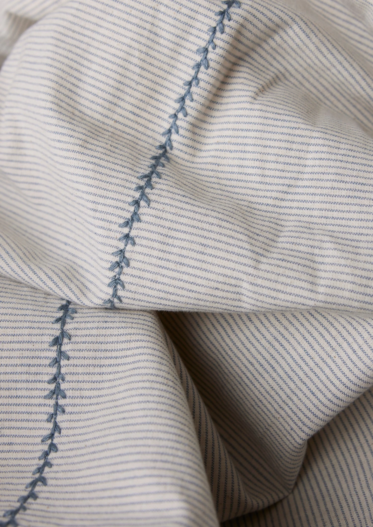 Soft duvet cover woven from cotton with fine stripes, then accented by embroidered linear motifs. Finished with mother-of-pearl buttons. Washed for a casual look and accompanied by a matching fabric bag.