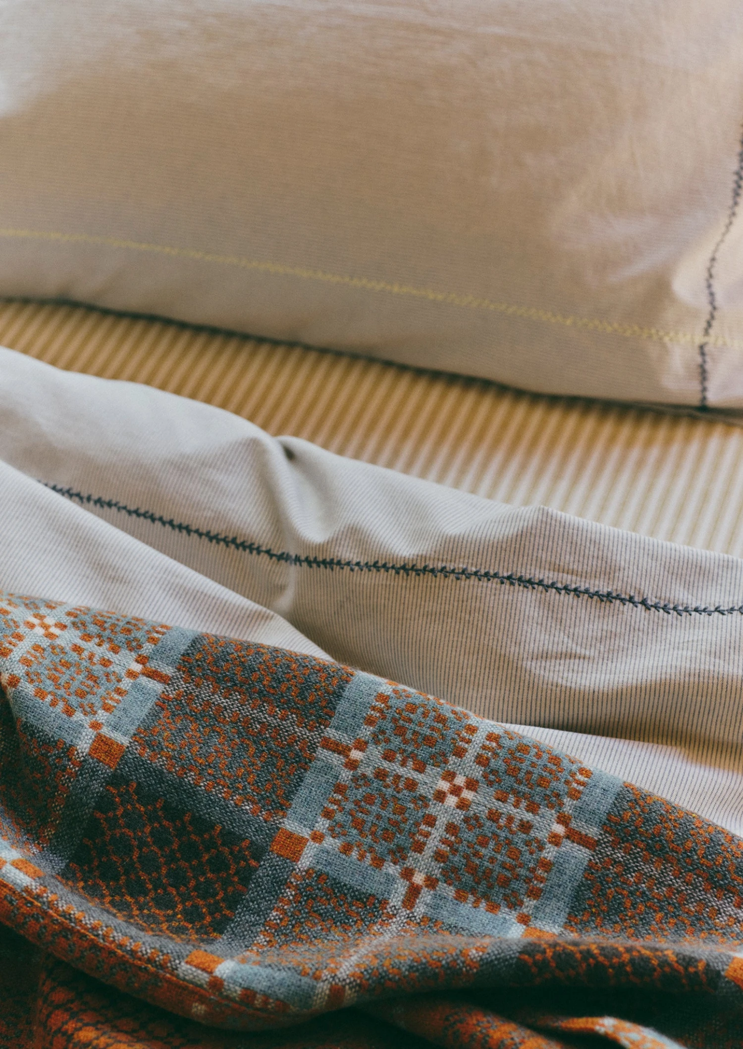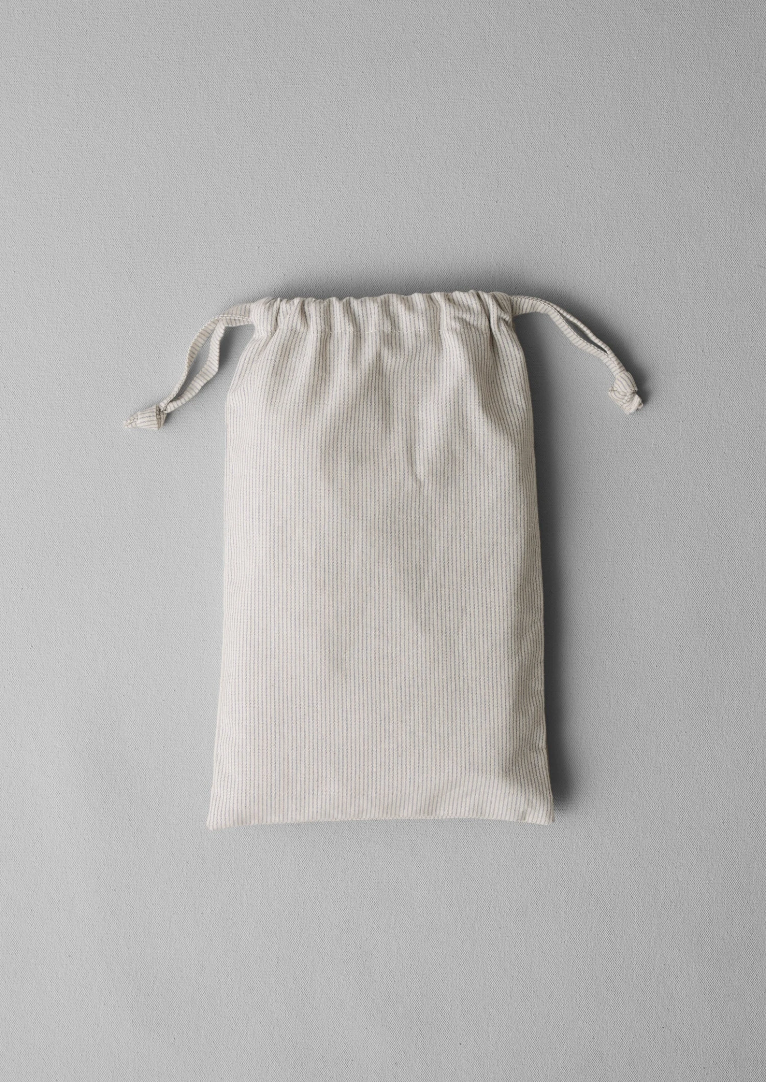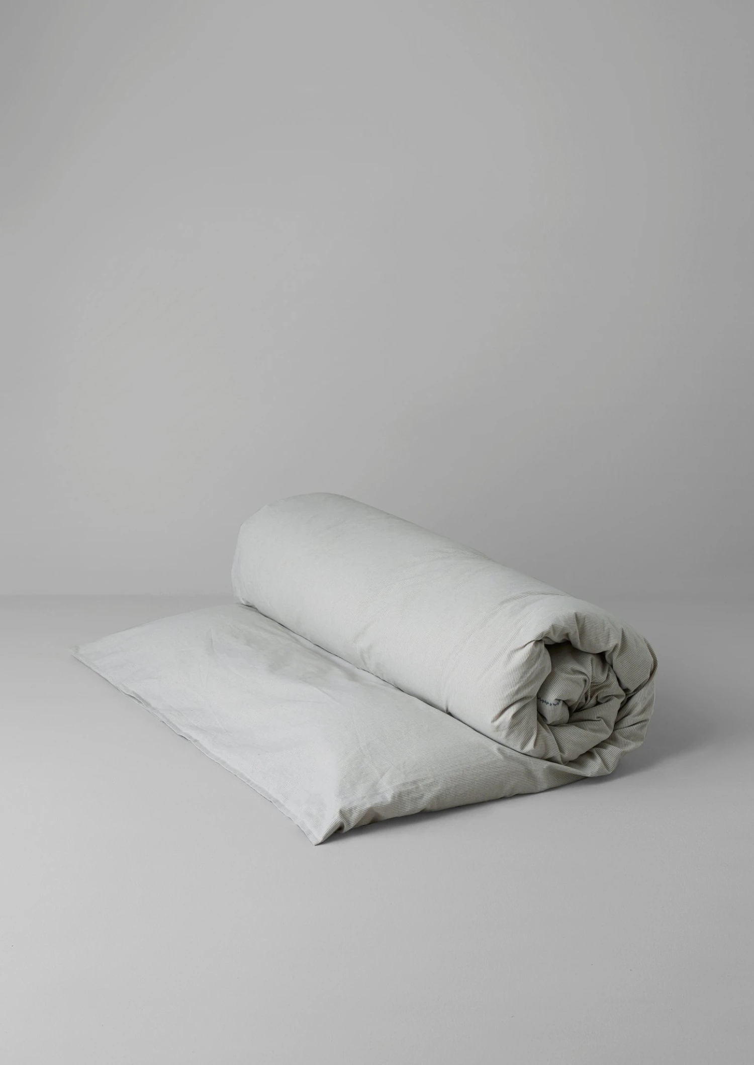Soft duvet cover woven from cotton with fine stripes, then accented by embroidered linear motifs. Finished with mother-of-pearl buttons. Washed for a casual look and accompanied by a matching fabric bag.