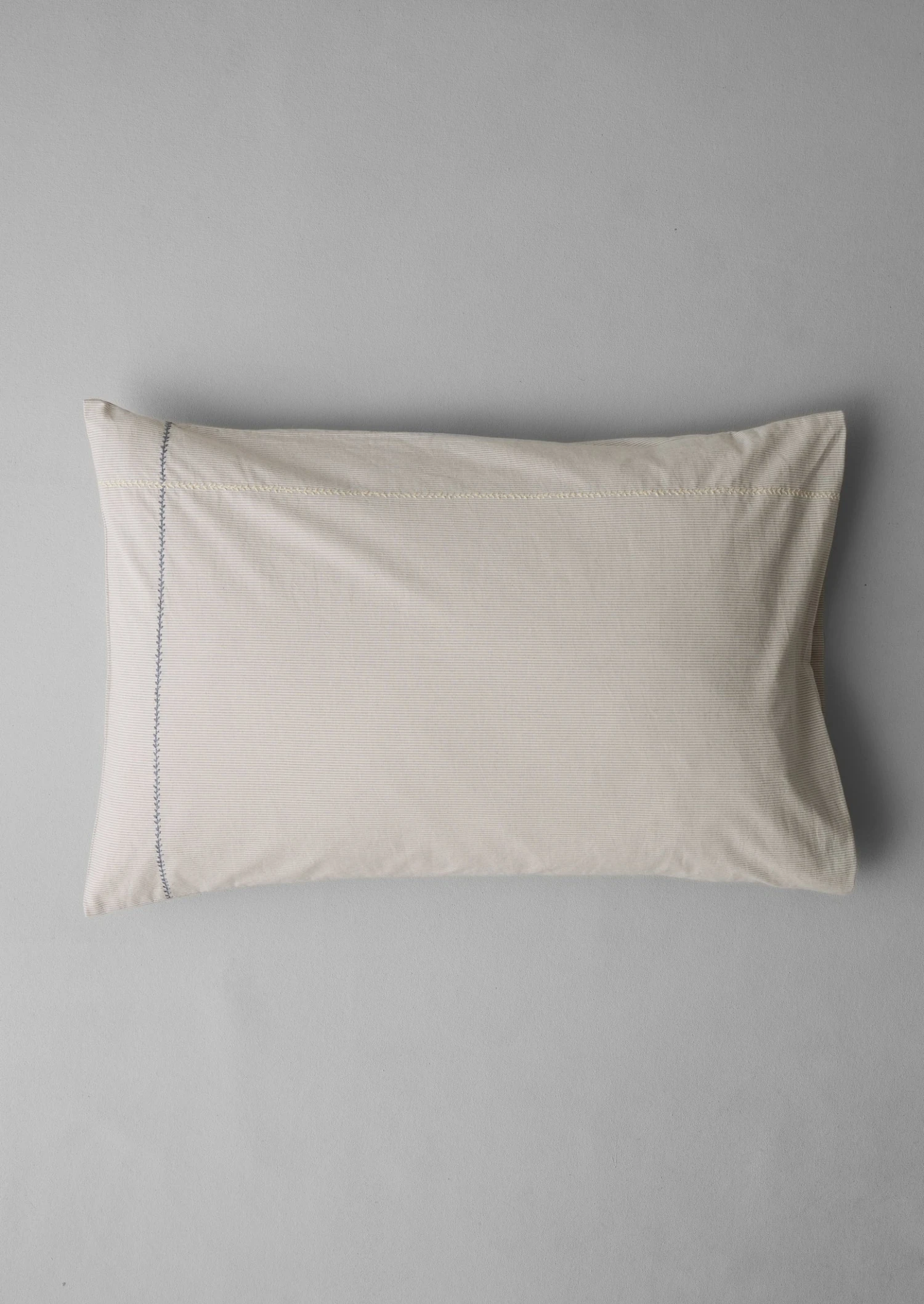 Soft pillowcase crafted from organic cotton woven with fine stripes. Accented by embroidered linear motifs and finished with a simple envelope closure. Washed for a casual finish and accompanied by a matching fabric bag.