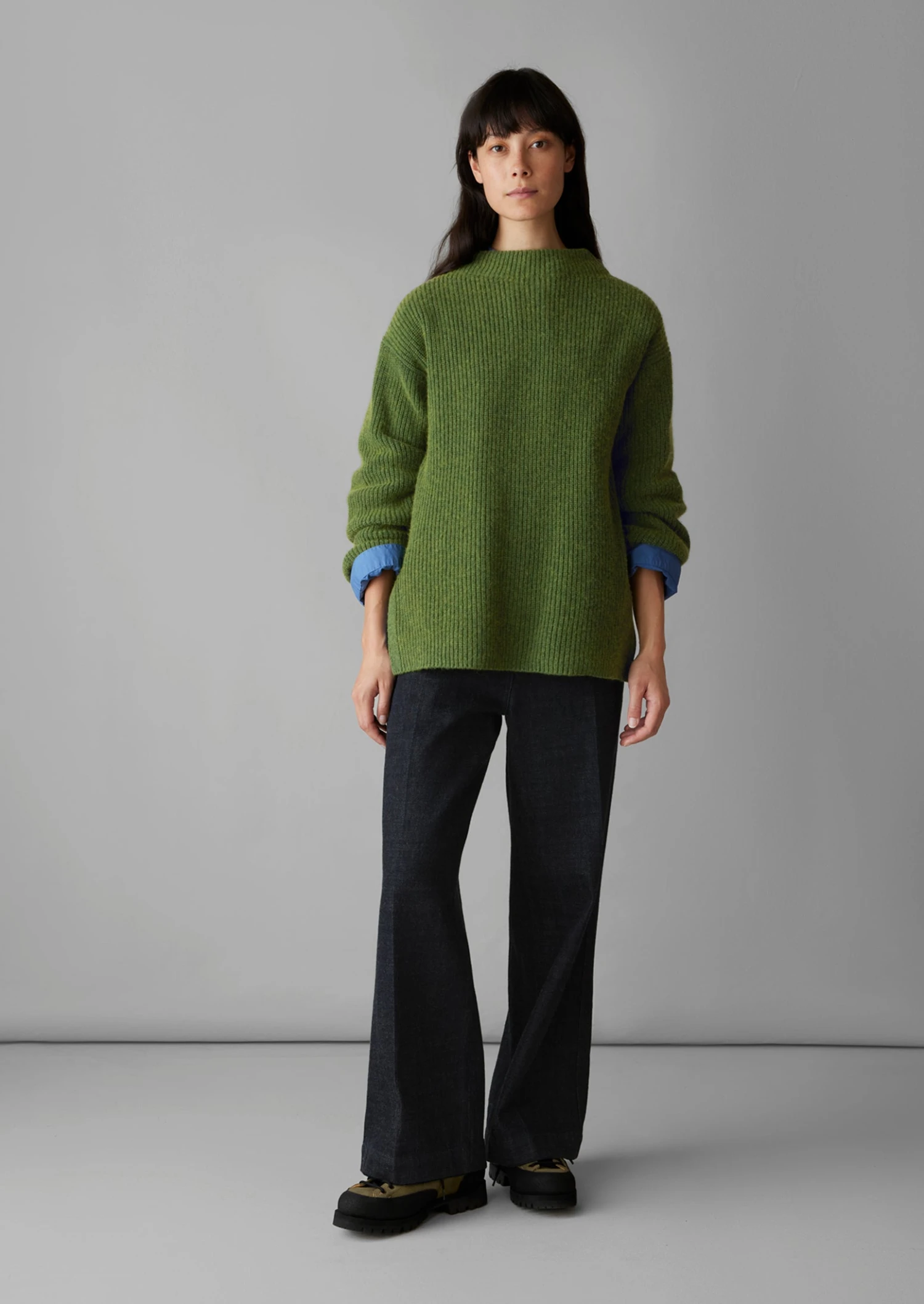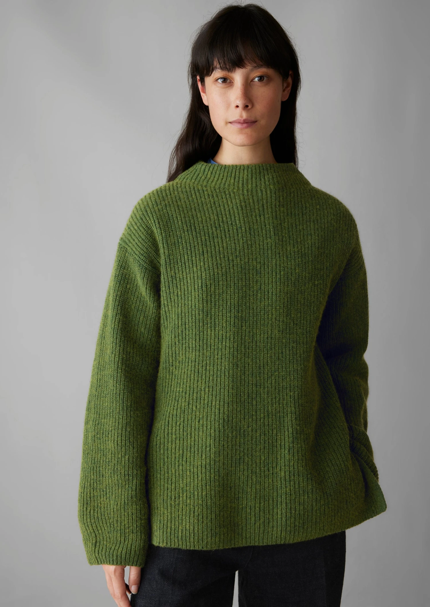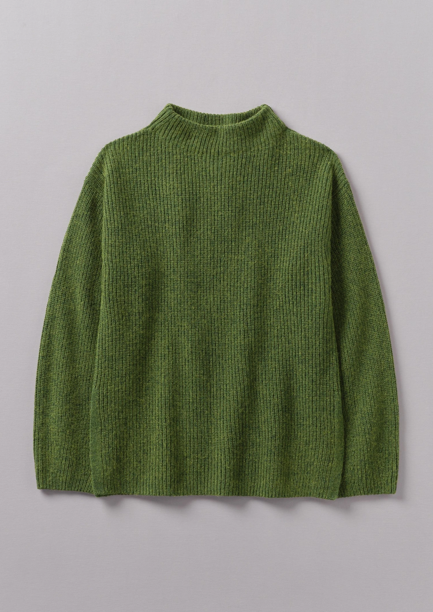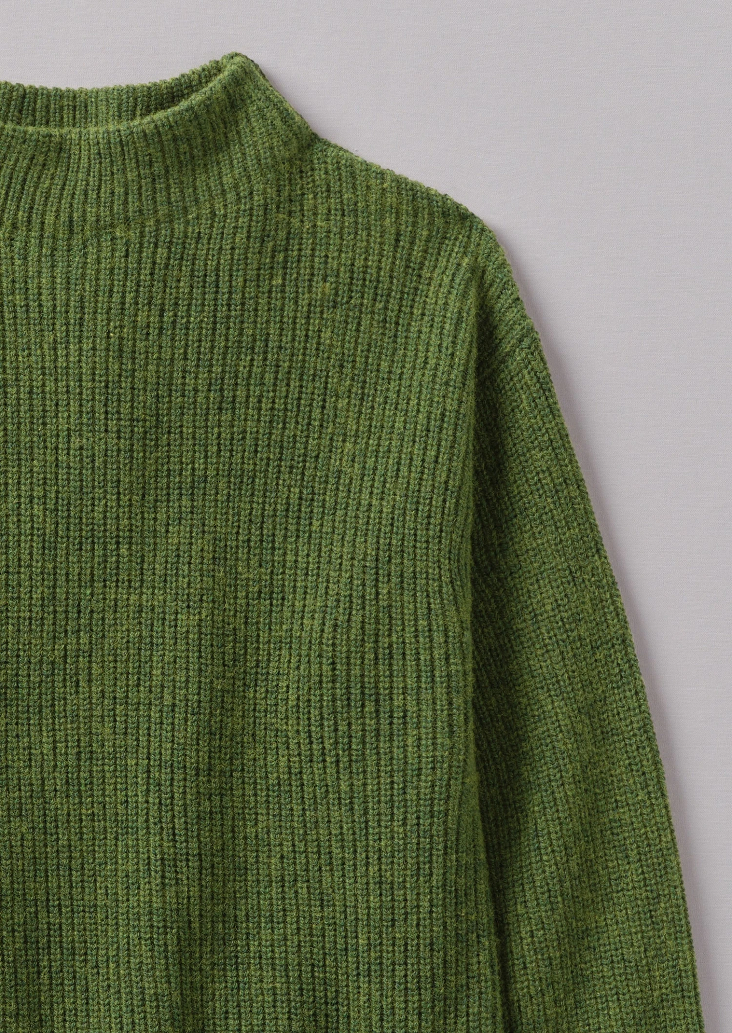 Cotton and wool blend. Fisherman ribbing. Easy shape. High neck. Set-back shoulders. Dropped wristbone-length sleeves. Side hem slits. Top-thigh length.