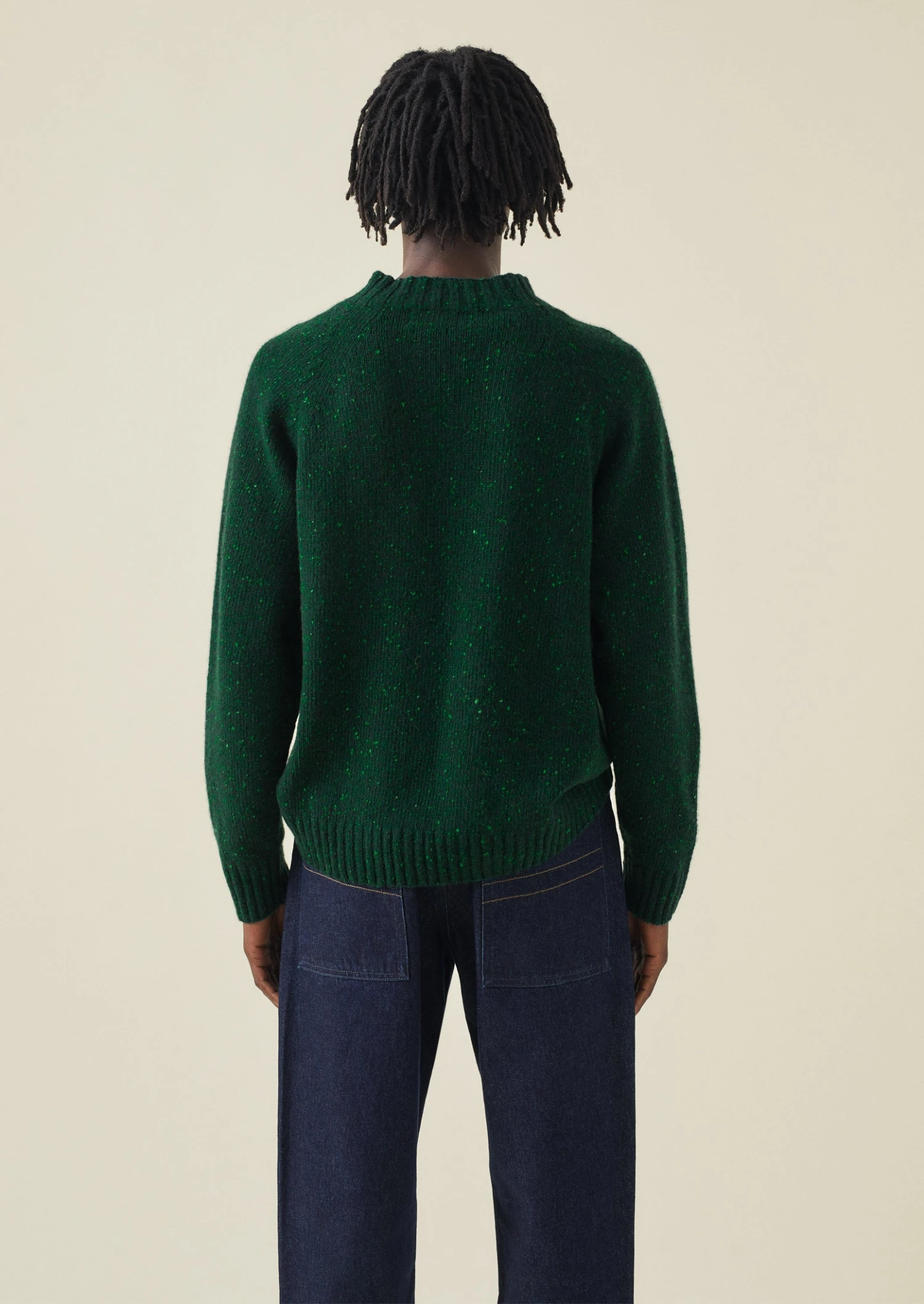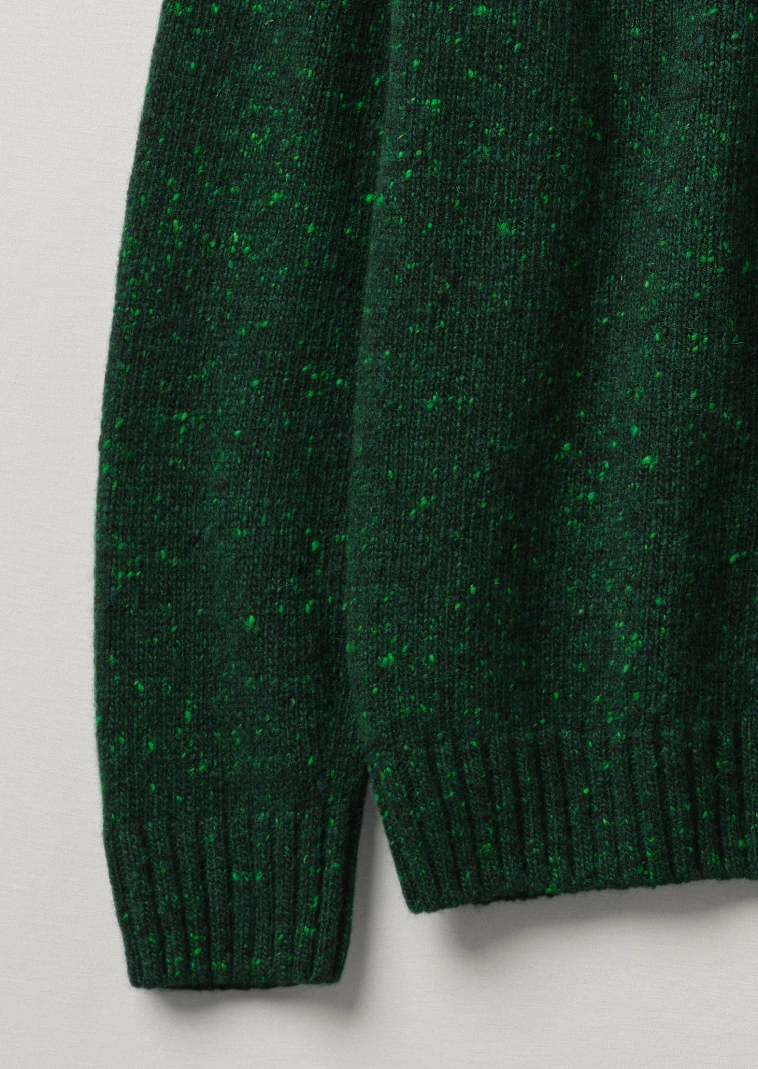 Flecky merino wool and cashmere blend. Deep crew neck. Ribbed edges.