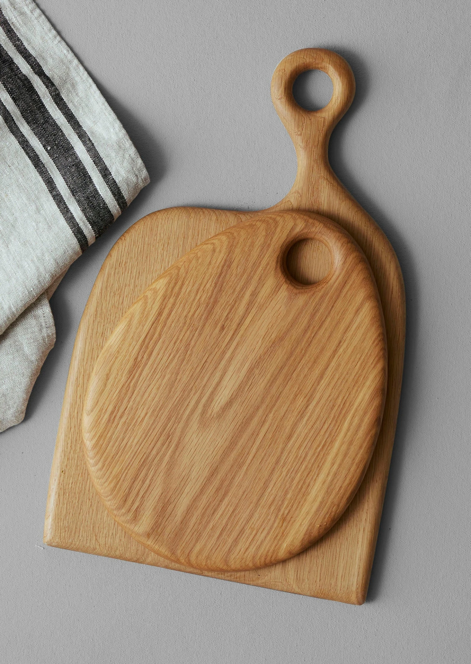 Smooth, durable and hardwearing, locally sourced oak. Wide silhouette with a circular end for carrying or hanging up in the kitchen. For chopping and serving. Treated with natural oil to protect. Handmade and designed by Forge Creative, a small team in West Sussex.