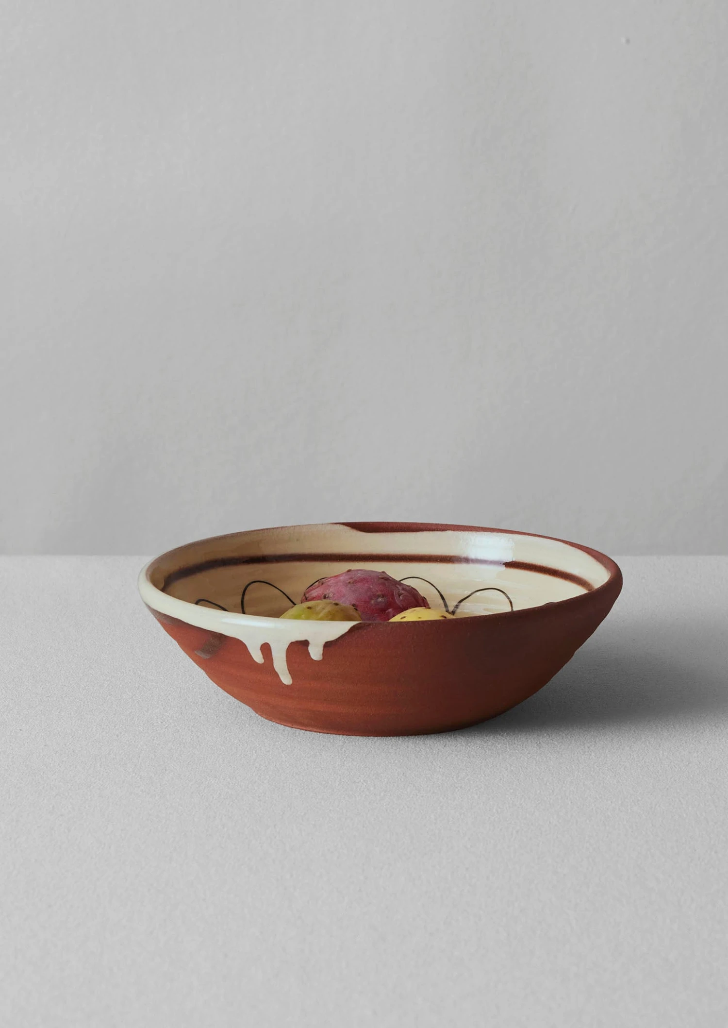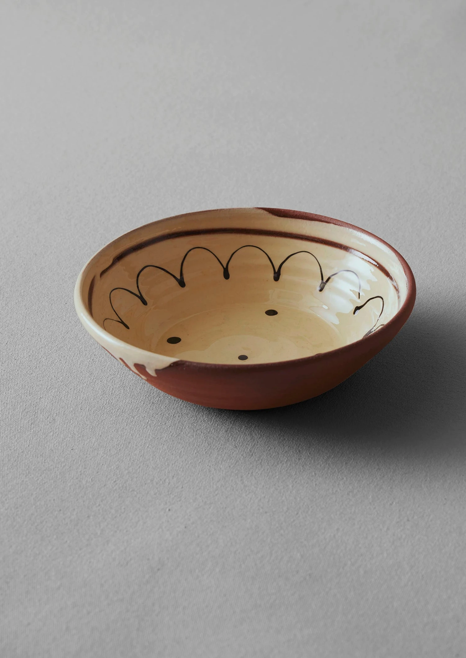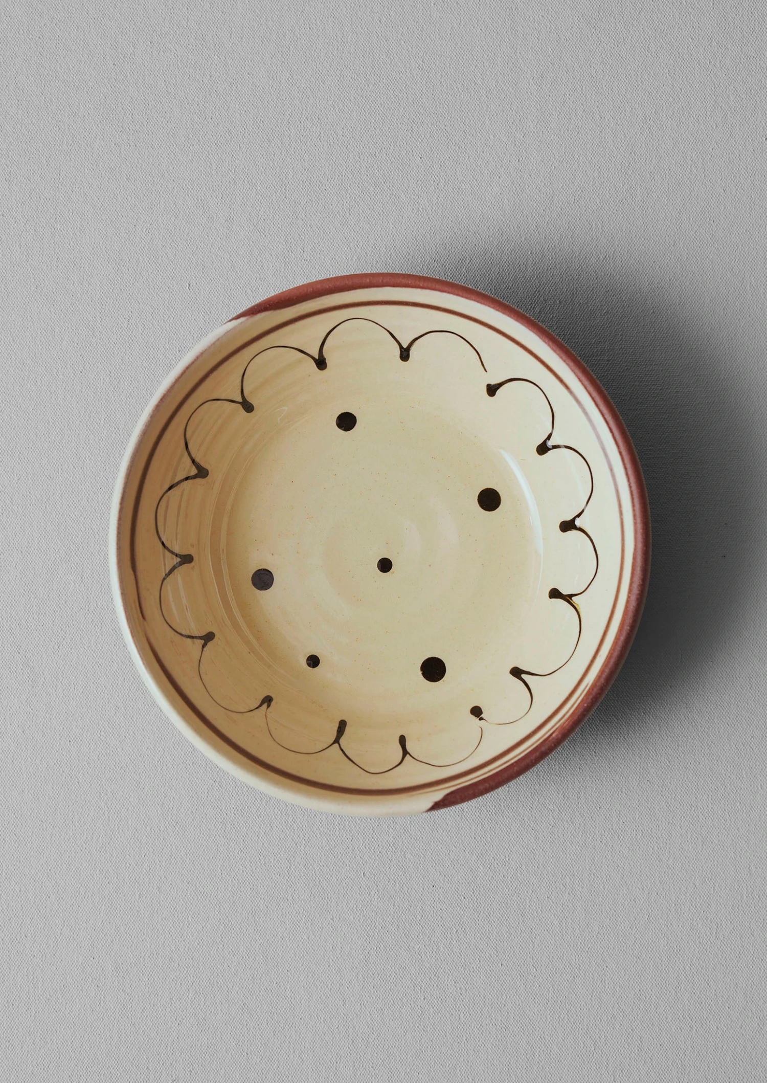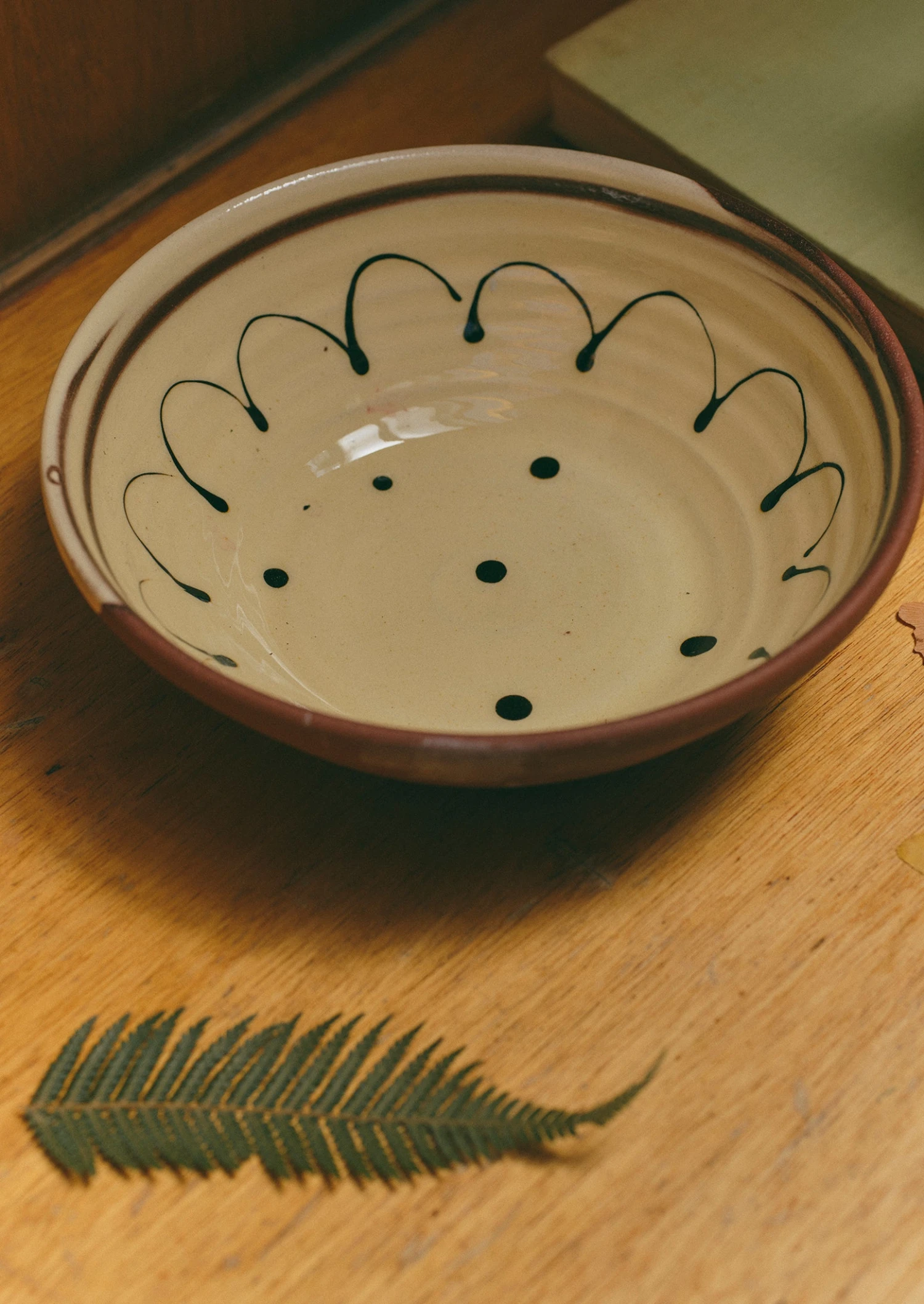 Low, wide serving bowl hand-thrown by Frances Savage exclusively for TOAST. Based at the Manchester Ceramics Collective, Frances trained in Stoke-on-Trent, known for its ceramics history, and Tuscany. Made from terracotta clay and decorated with a scalloped cream and black slip pattern, then finished with a transparent glaze. Each varies slightly in shape and colour.