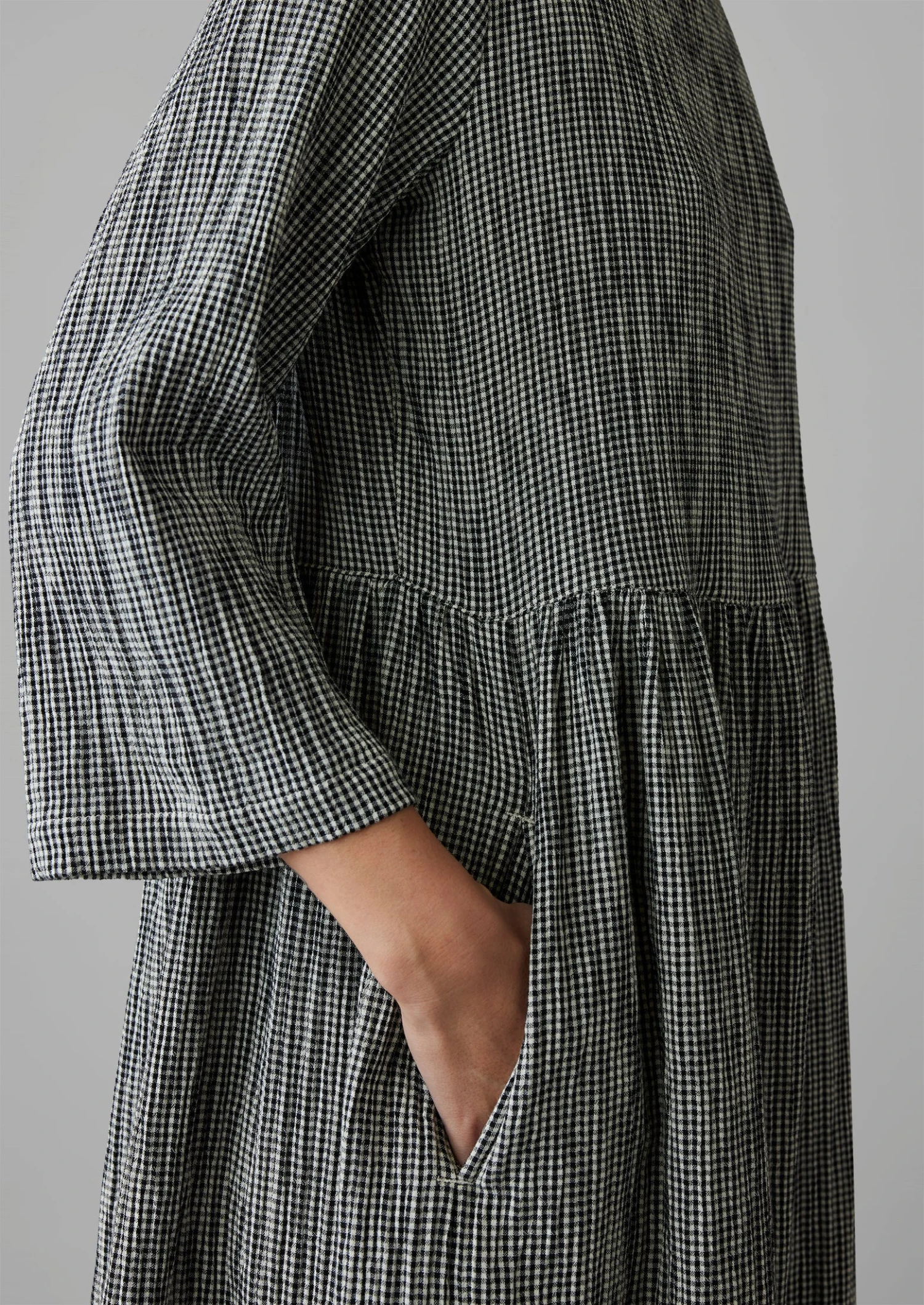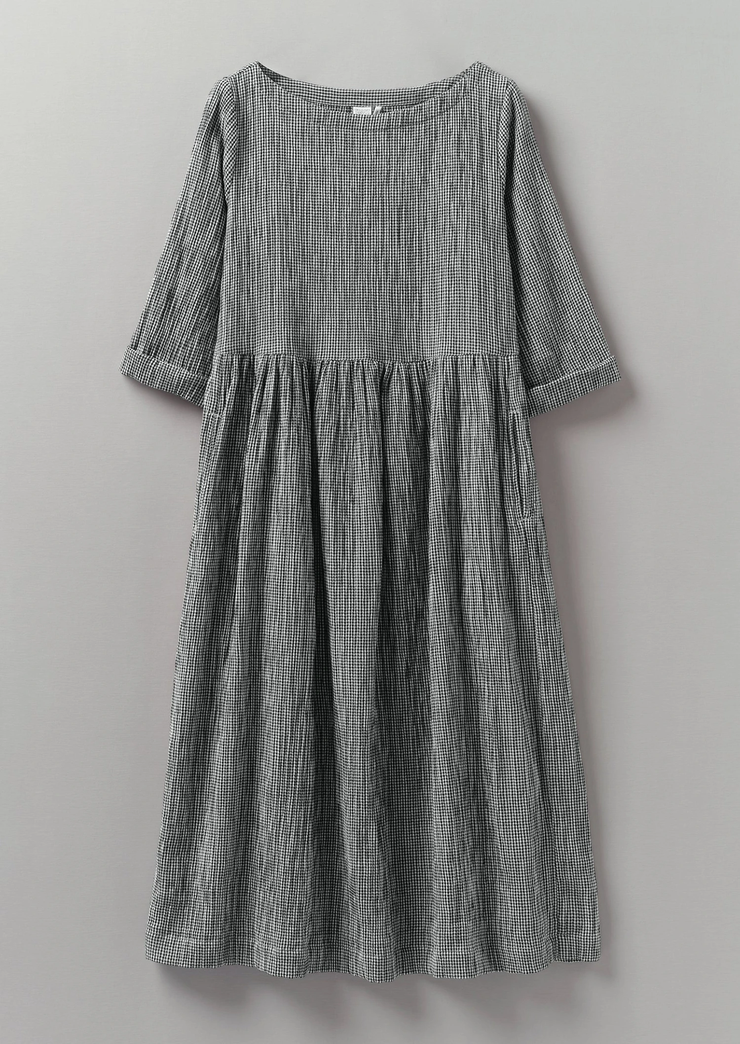 Crinkled cotton gingham. Boat neck. Three quarter length sleeves. Gathered waist. Side seam pockets. Lower-calf length. Internal hanging loop.