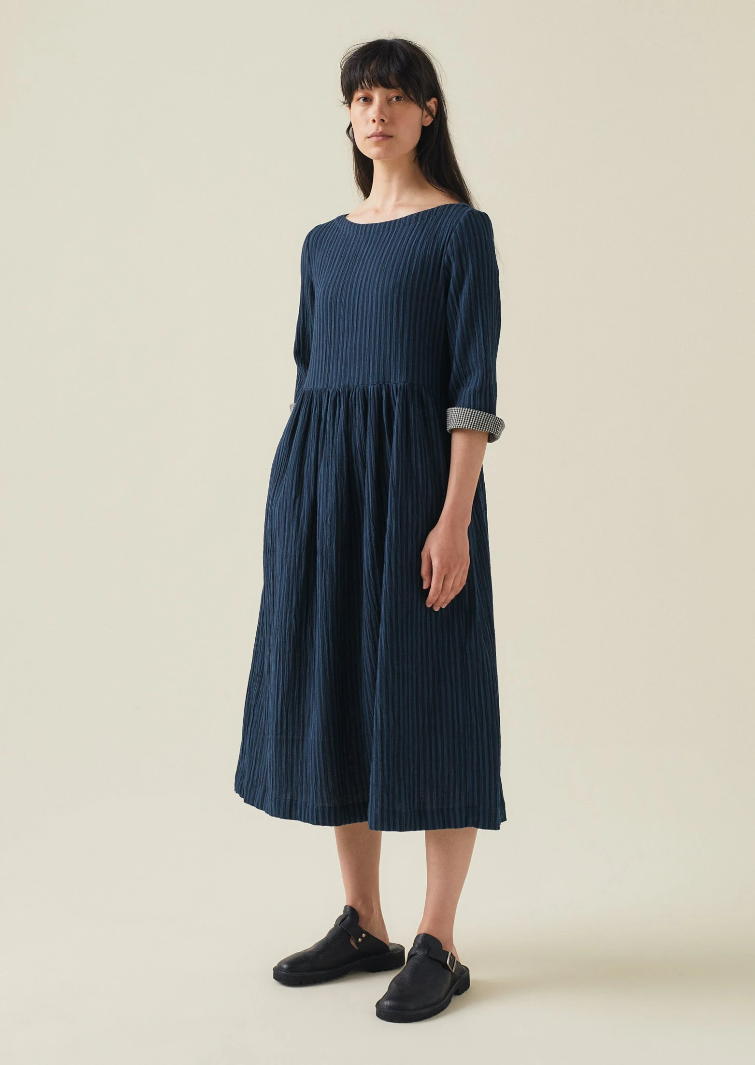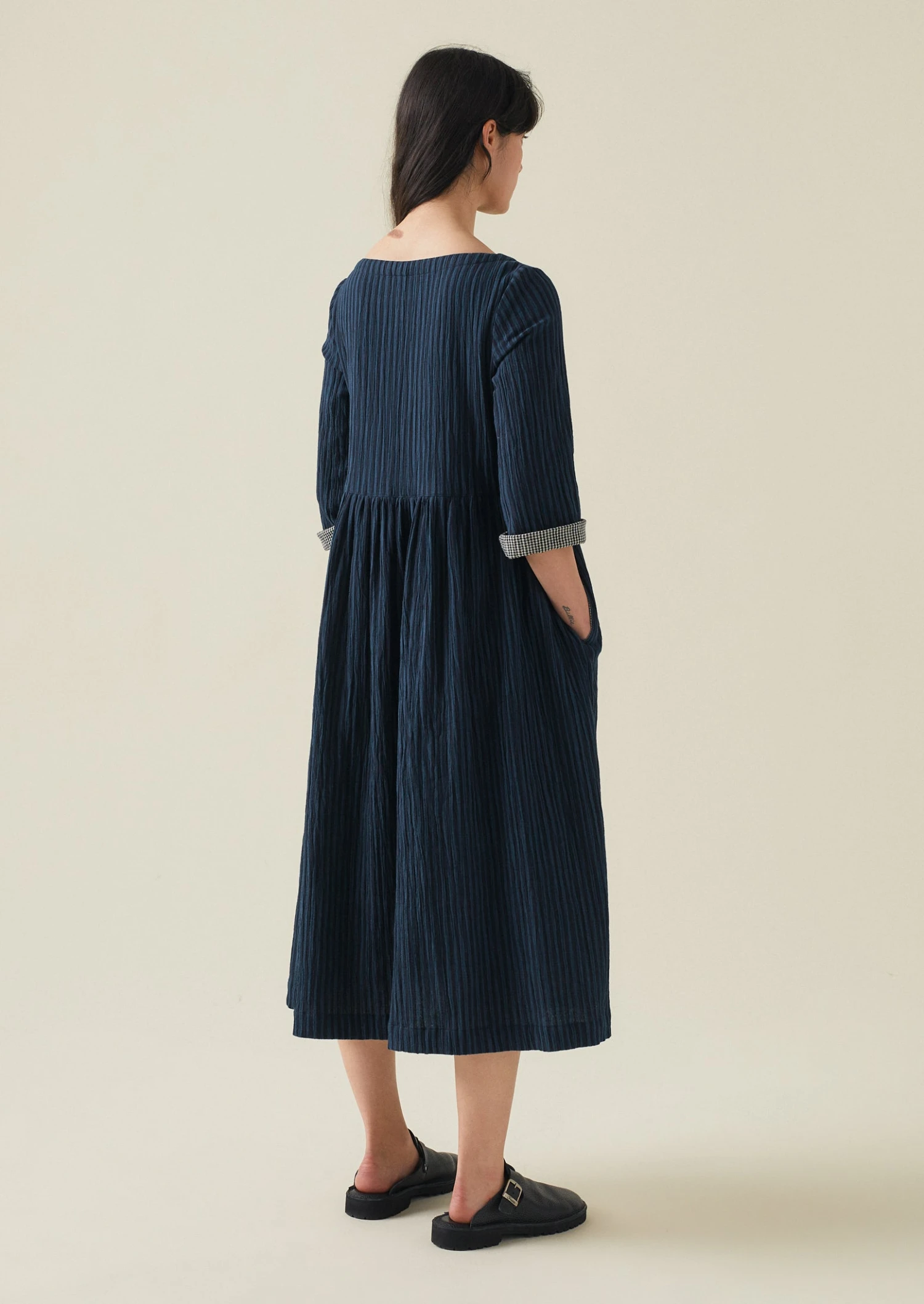 Double-faced crinkled cotton. Checked interior. Boat neck. Three quarter length sleeves. Gathered waist. Side seam pockets. Lower-calf length. Internal hanging loop.