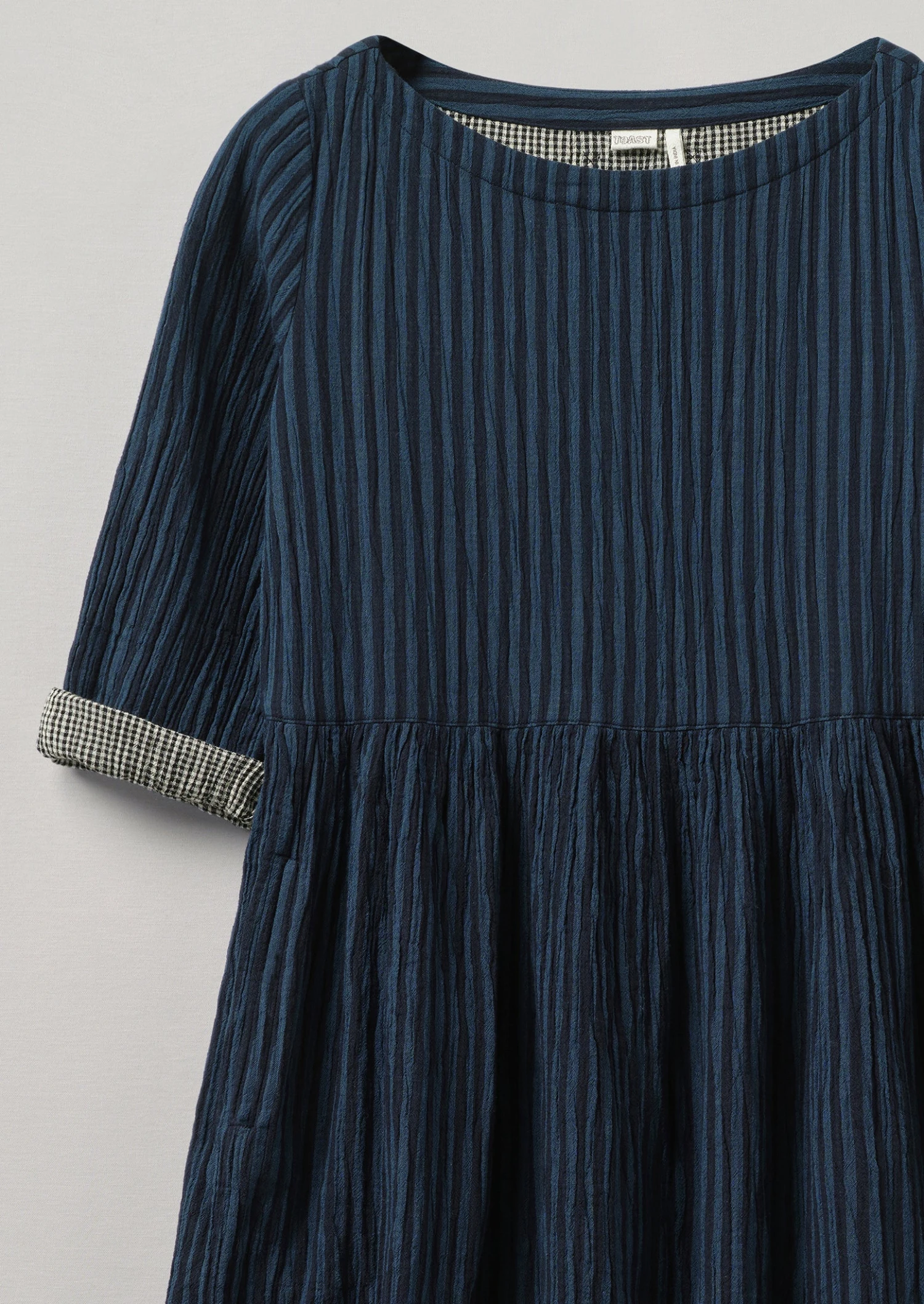Our Freya dress is crafted from double-faced crinkled cotton with a checked interior, visible when the sleeves are turned up. Cut to a relaxed shape with a boat neckline and side seam pockets.