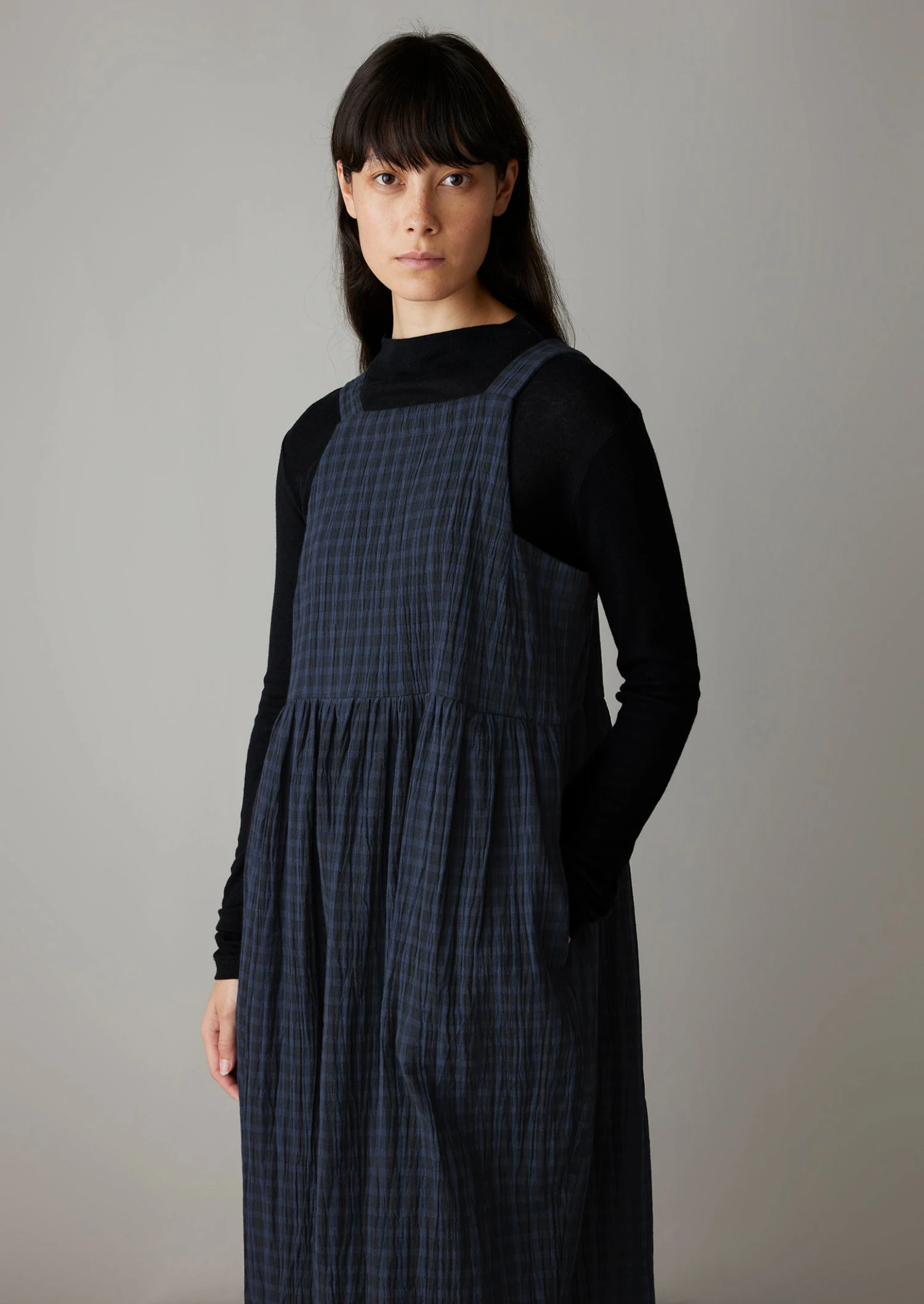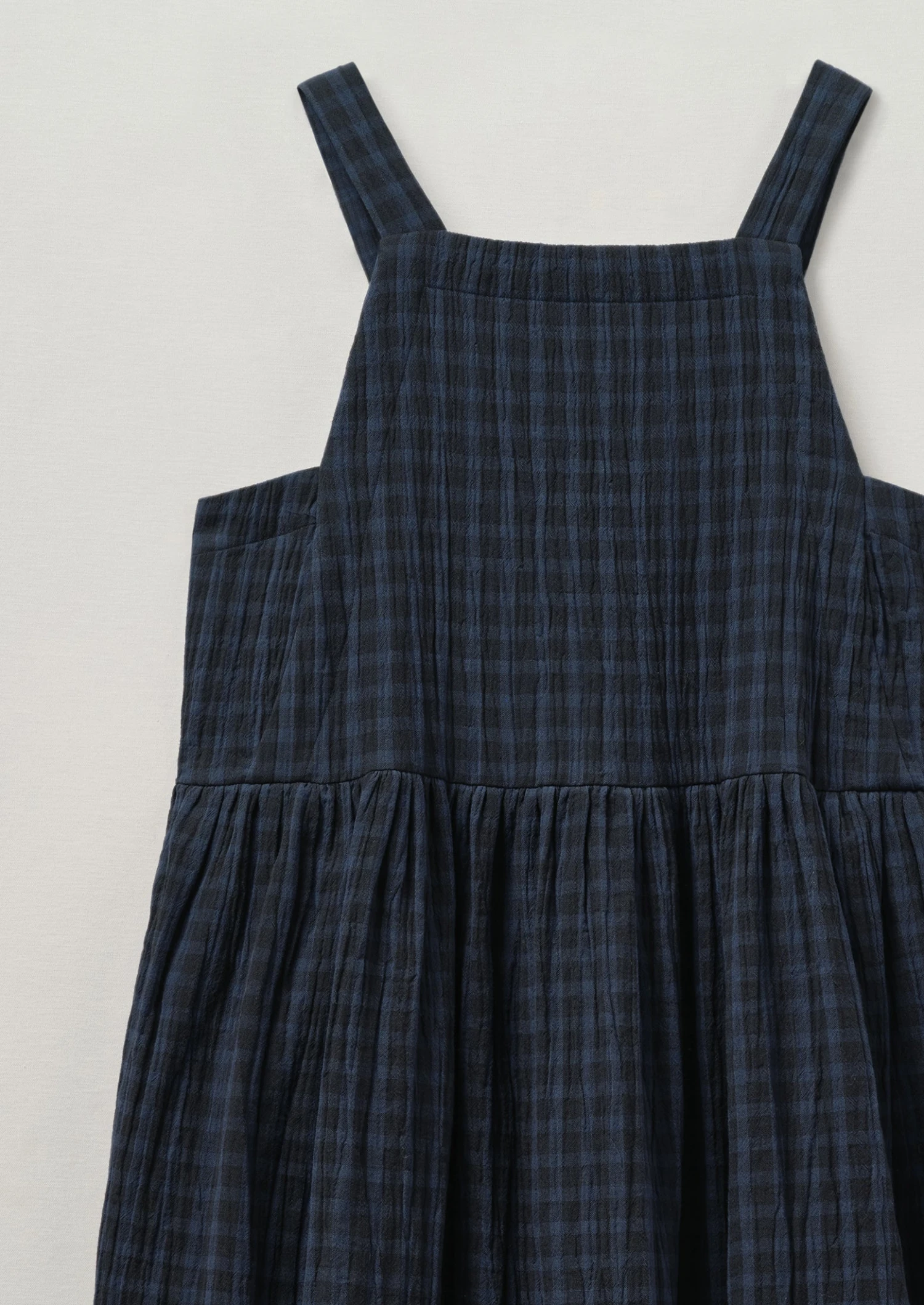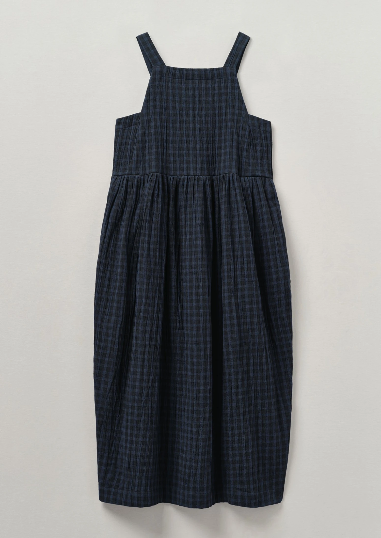 Our dress is crafted from crinkled double-faced cotton with a large exterior check and small interior check. Cut with a square neck and shaped with waist gathers for gentle movement through the skirt.