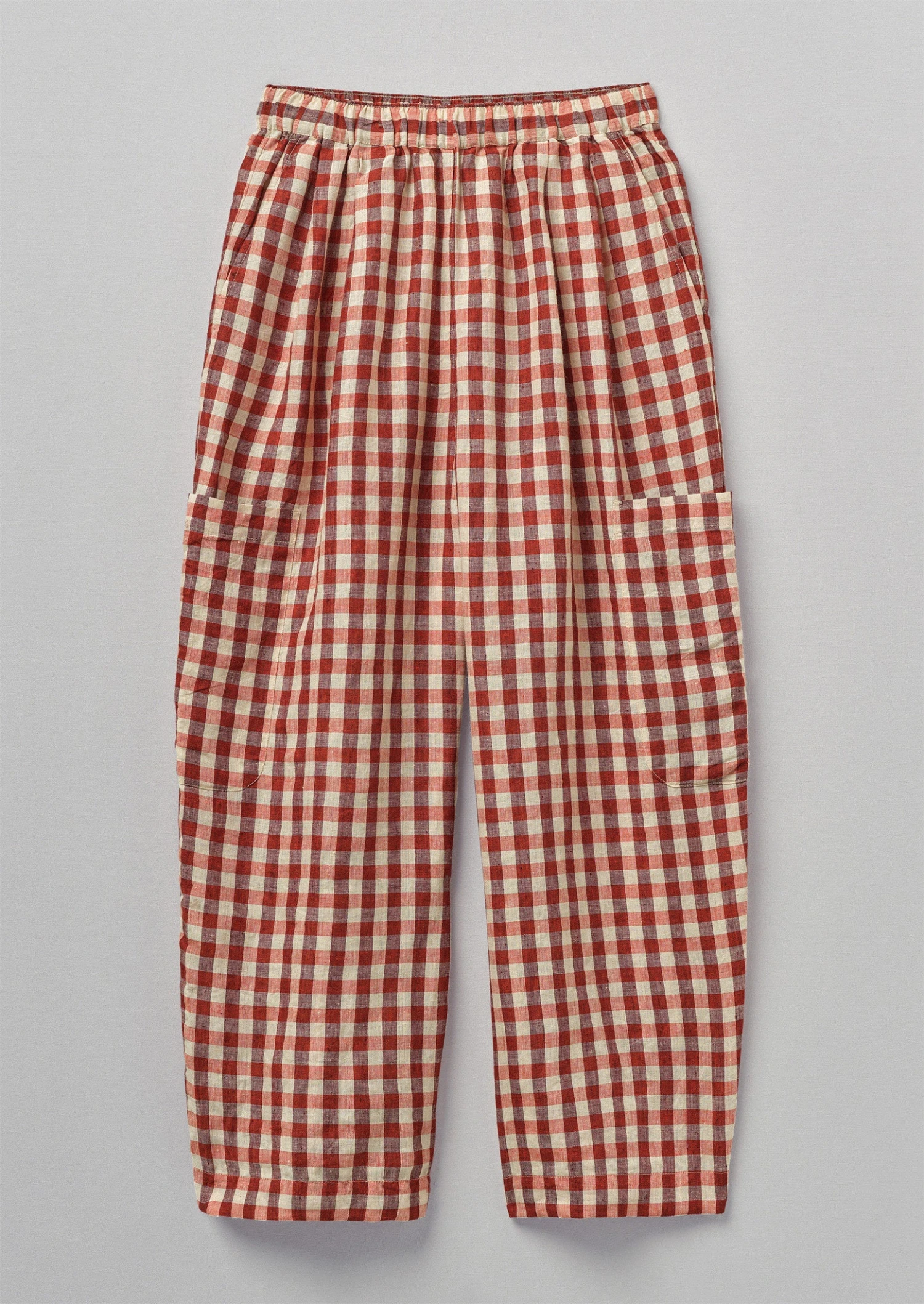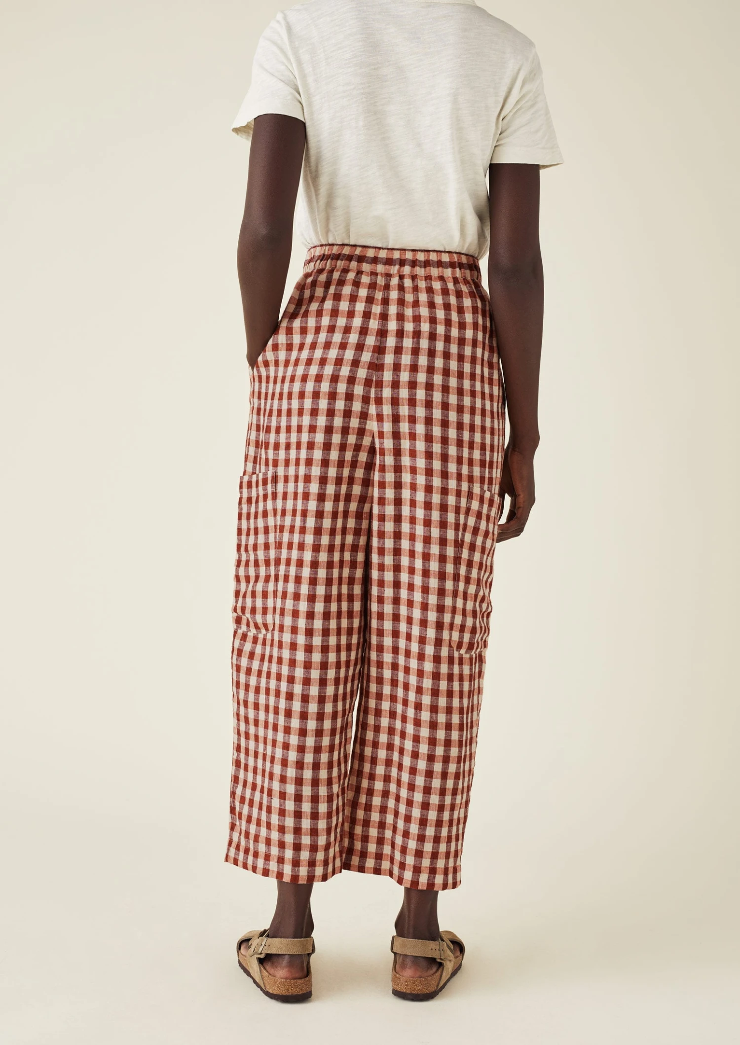 Our gingham trousers have low side patch pockets for functionality. Crafted from supple linen to an easy shape with a comfortable elasticated waist, falling to straight cropped legs.