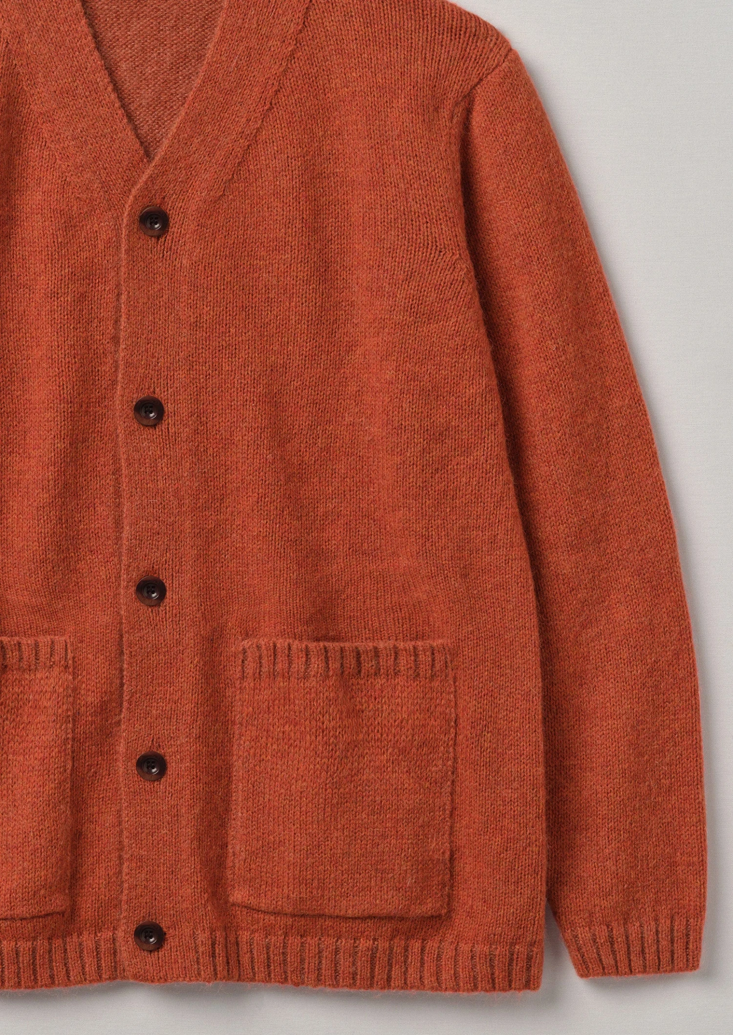 Wool blend containing mohair. High V-neck. Side patch pockets. Dropped sleeves. Ribbed cuffs and hem. Corozo buttons.