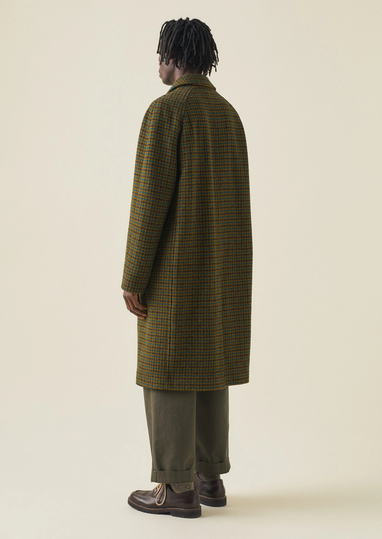Our collared houndstooth coat is crafted from a heavy and weighty wool woven with a houndstooth pattern in Italy. Cut to a relaxed, single-breasted silhouette with curved raglan seams, giving ease of movement, falling to a below-knee length.