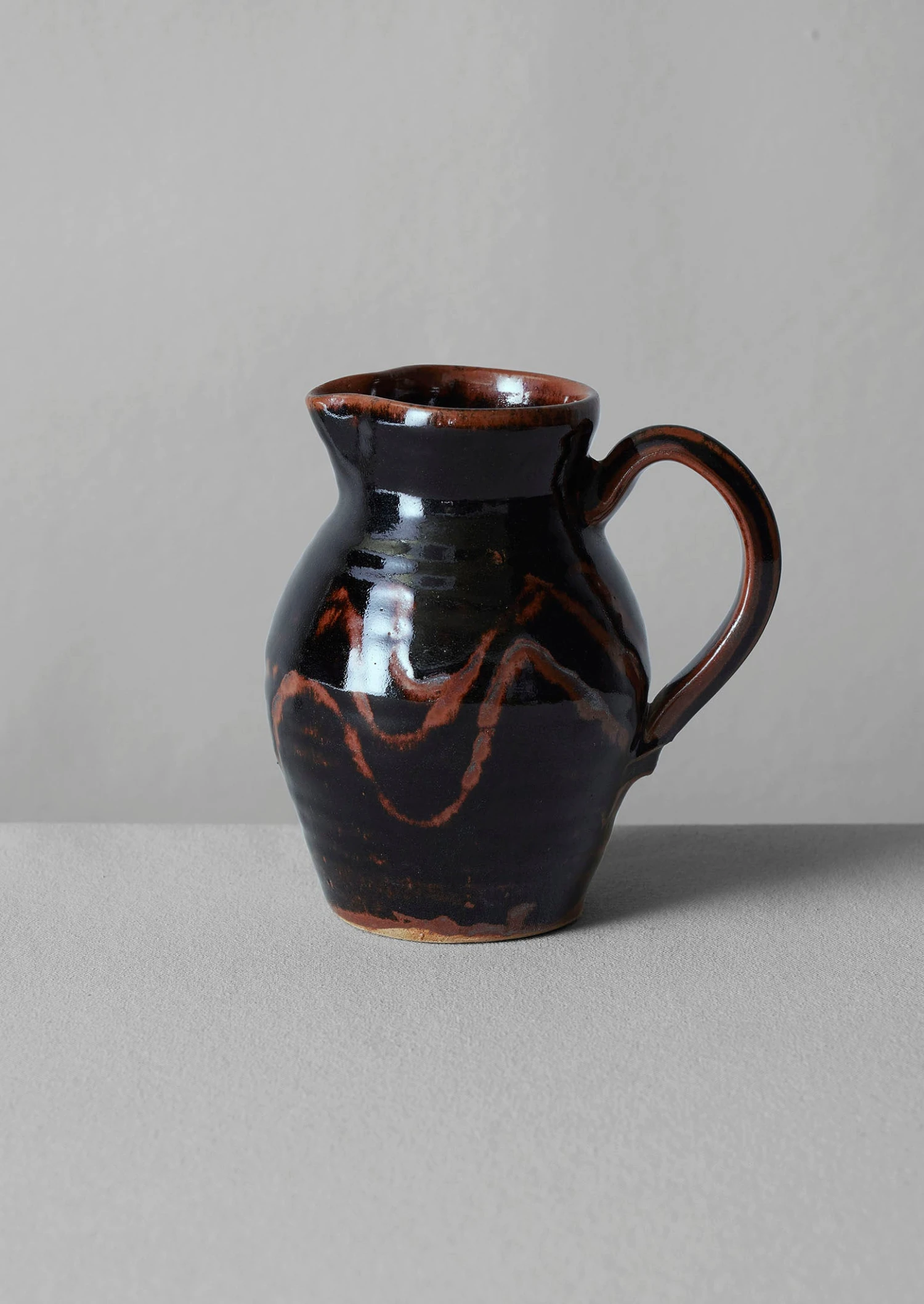 Rustic jug handcrafted by Jack Welbourne exclusively for TOAST, for table water or flowers. Based in Cardiff, Jack creates this weighty jug in his studio, which is in a courtyard that is home to many makers. He studied pottery in Plymouth and has now been making pieces for 12 years. Hand-thrown from iron-bearing clay, with a pulled handle. Finished with a tenmoku glaze with wave markings. Each varies slightly in shape, pattern and glaze tone from brown to black.