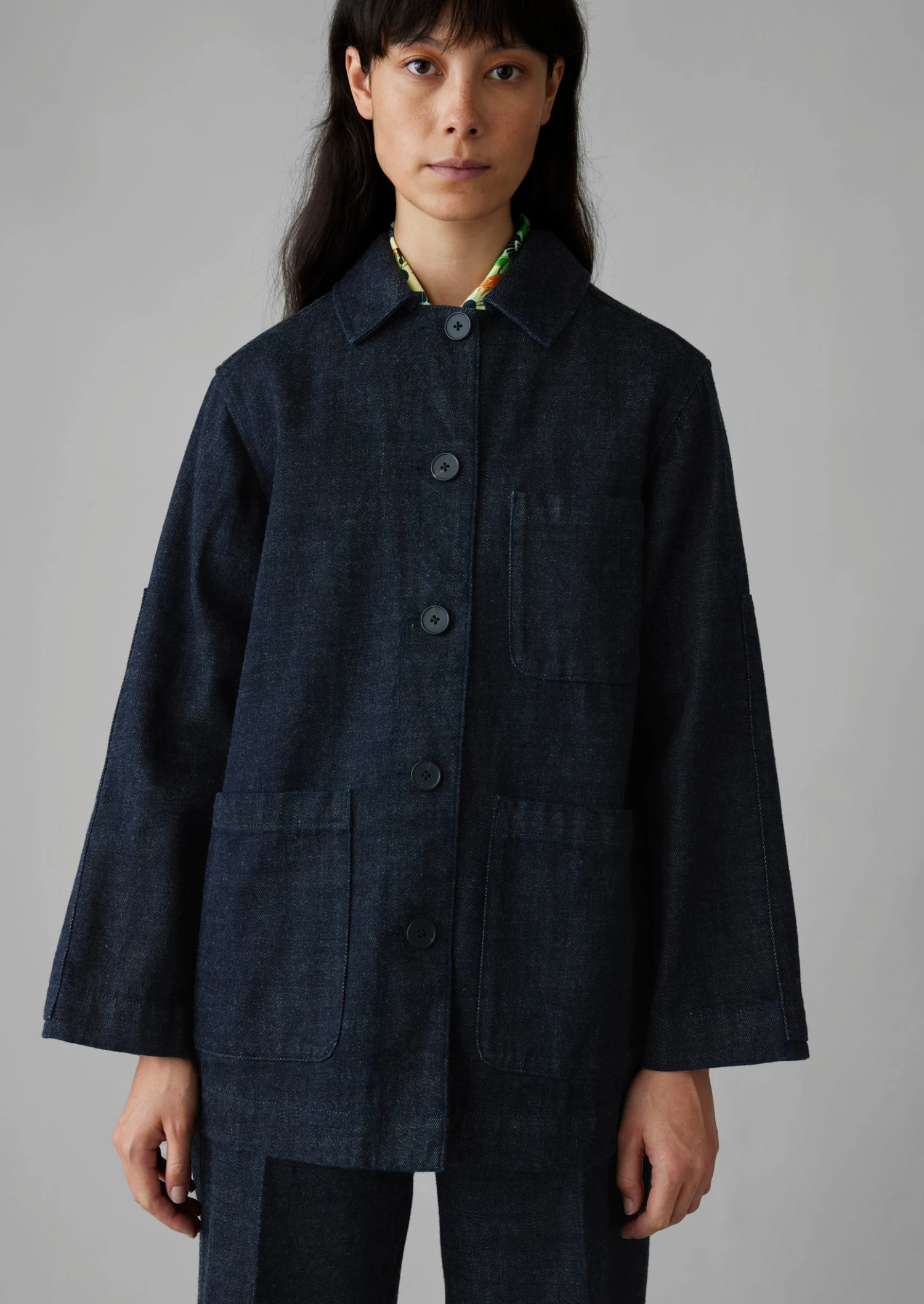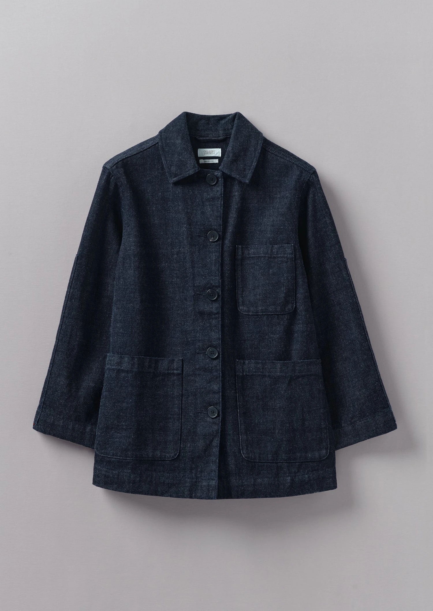 Our chore jacket is crafted from cotton denim dyed and woven on traditional shuttle looms in Ibara City in Okayama, Japan. Cut to a straight shape with panelled sleeves and accented by large patch pockets.