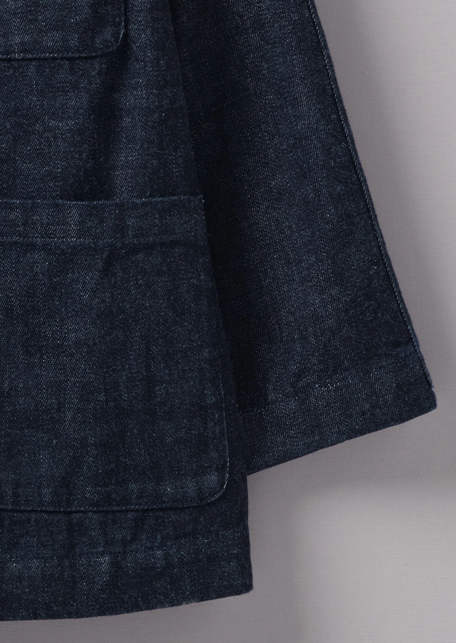 Japanese-woven cotton denim. Collar. Patch pockets. Panelled sleeves. Centre-back seam. Top-thigh length. Internal hanging loop. Horn buttons.